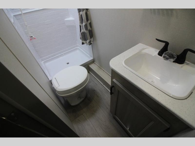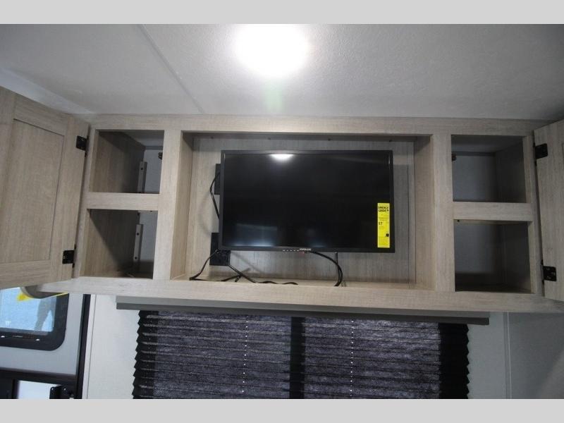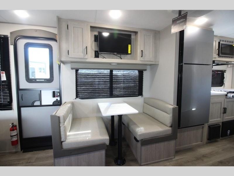 You will love how conventional this travel trailer is! If you want to travel for just a weekend or even more, you won't have to worry since you have all the amenities you need. This model has a queen bed with dual end wardrobes for some extra storage so you can neatly store your clothes. There is also a slide with theater seating, and a booth dinette to enjoy your favorite breakfast. A rear corner kitchen features everything you need to cook indoors, or you can head outside to use the outdoor Camper Kitchen with mini fridge and griddle. A rear corner bath features a 24" x 32" shower, toilet and sink. Outside, you'll find a 17' power awning with multicolor LED lights and exterior storage for camp gear.