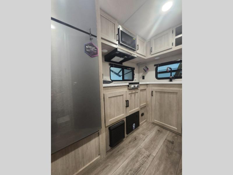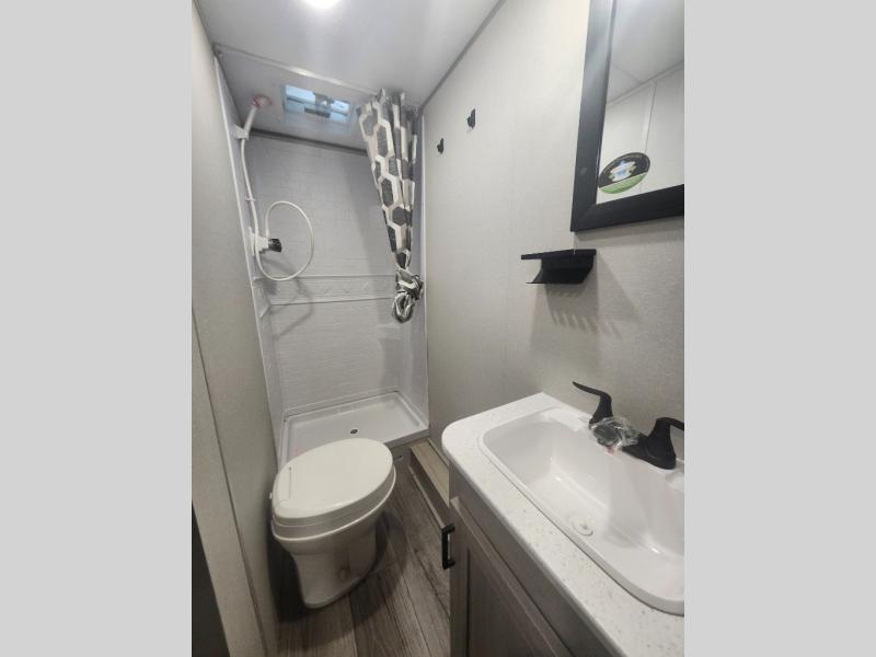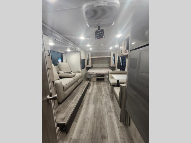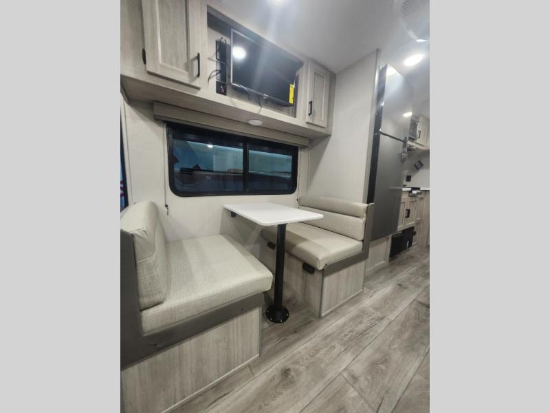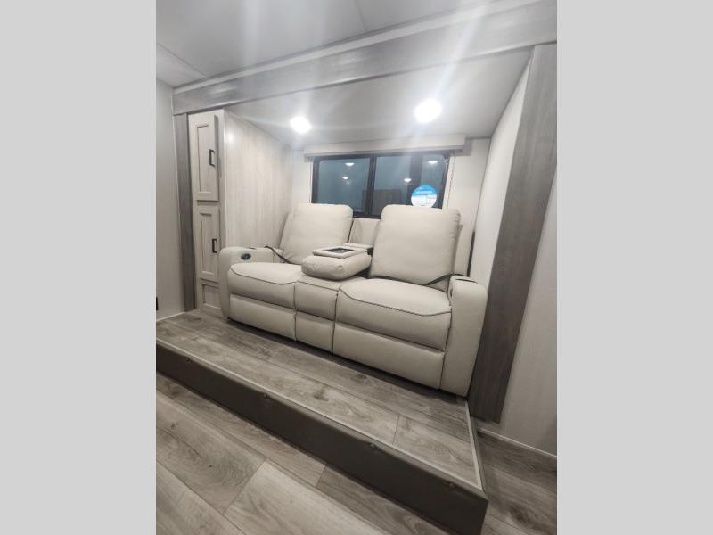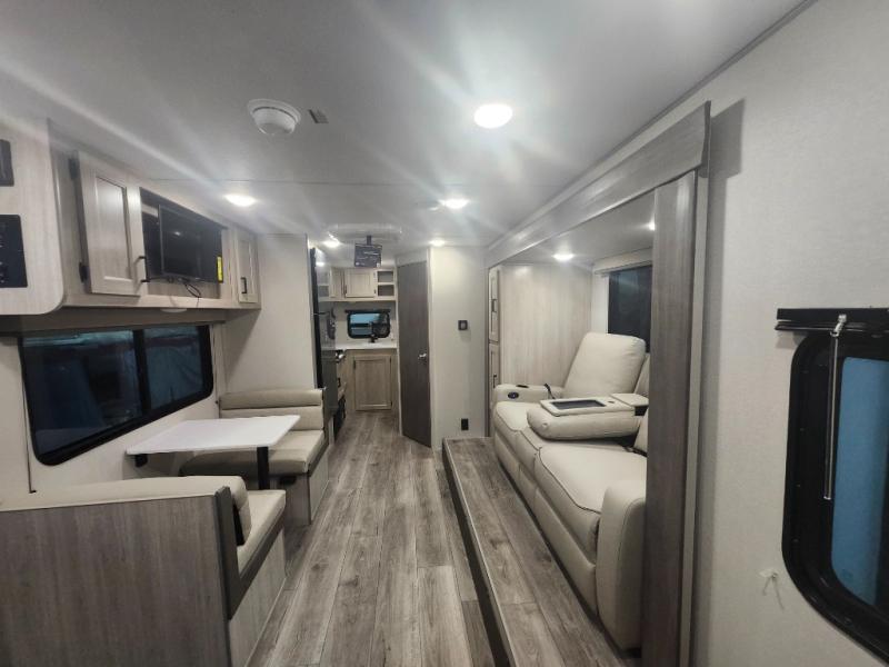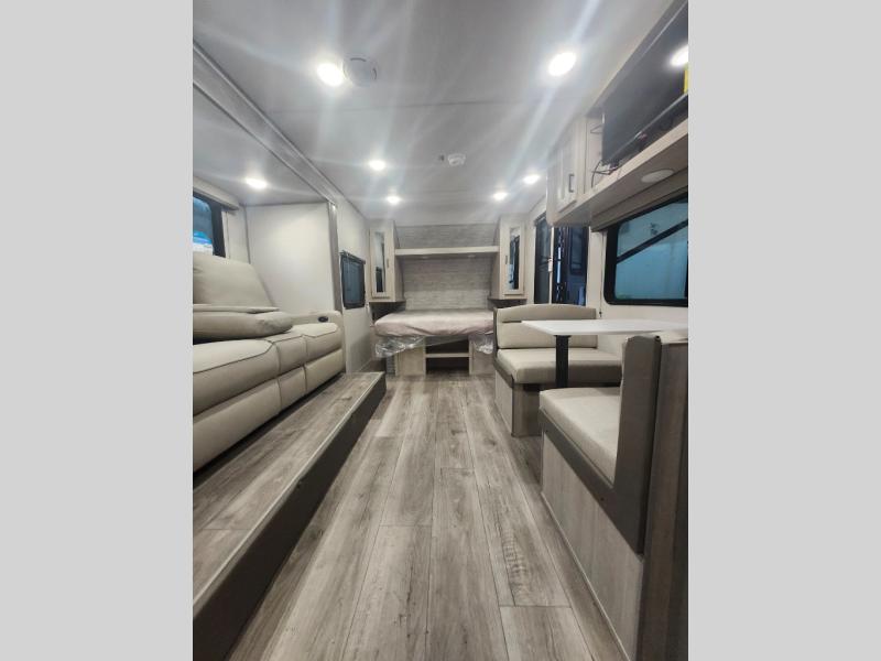 You will love how conventional this travel trailer is! If you want to travel for just a weekend or even more, you won't have to worry since you have all the amenities you need. This model has a queen bed with dual end wardrobes for some extra storage so you can neatly store your clothes. There is also a slide with theater seating, and a booth dinette to enjoy your favorite breakfast. A rear corner kitchen features everything you need to cook indoors, or you can head outside to use the outdoor Camper Kitchen with mini fridge and griddle. A rear corner bath features a 24" x 32" shower, toilet and sink. Outside, you'll find a 17' power awning with multicolor LED lights and exterior storage for camp gear.
