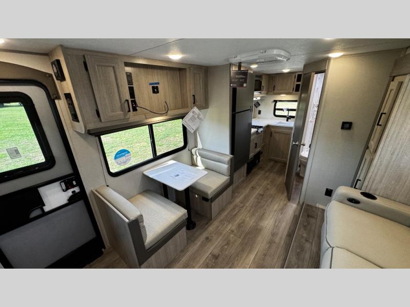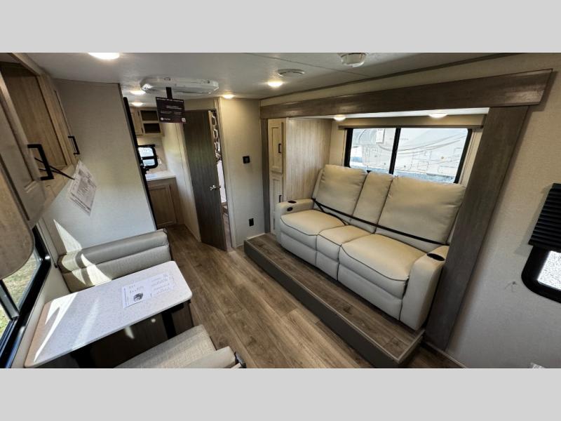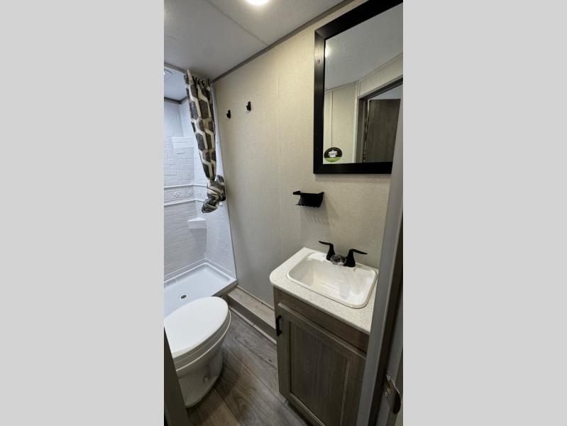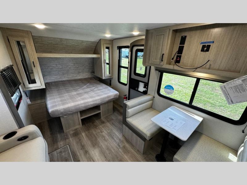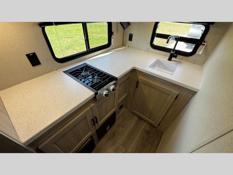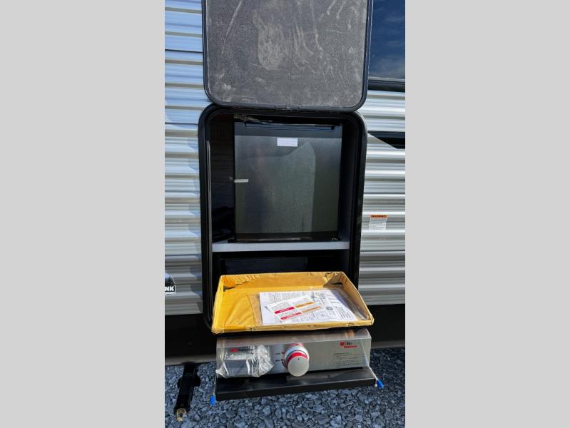 You will love how conventional this travel trailer is! If you want to travel for just a weekend or even more, you won't have to worry since you have all the amenities you need. This model has a queen bed with dual end wardrobes for some extra storage so you can neatly store your clothes. There is also a slide with theater seating, and a booth dinette to enjoy your favorite breakfast. A rear corner kitchen features everything you need to cook indoors, or you can head outside to use the outdoor Camper Kitchen with mini fridge and griddle. A rear corner bath features a 24" x 32" shower, toilet and sink. Outside, you'll find a 17' power awning with multicolor LED lights and exterior storage for camp gear.