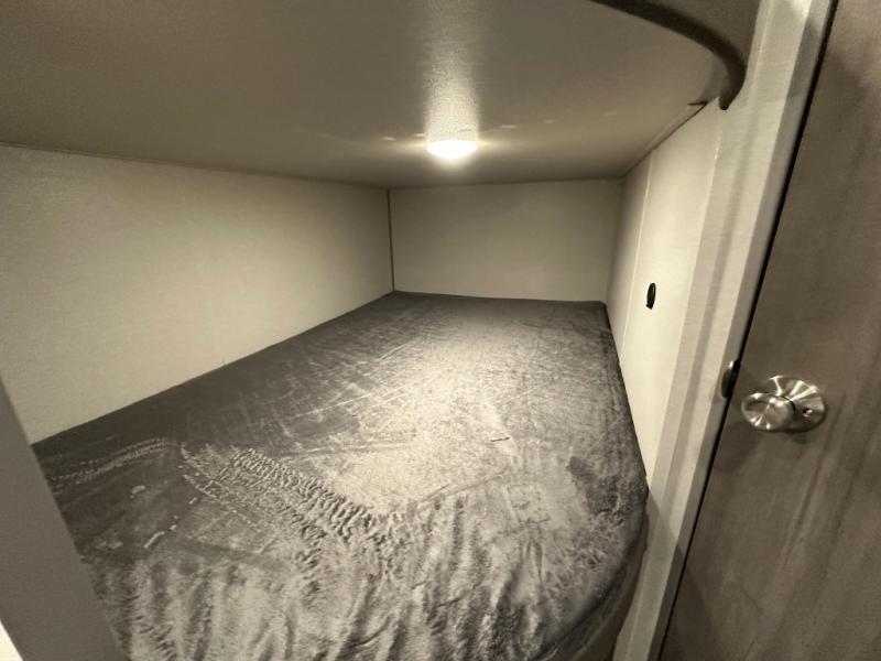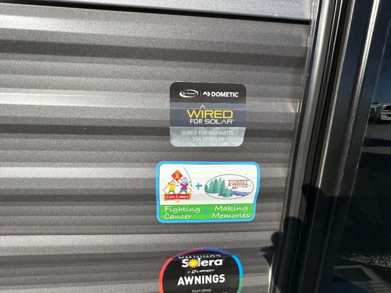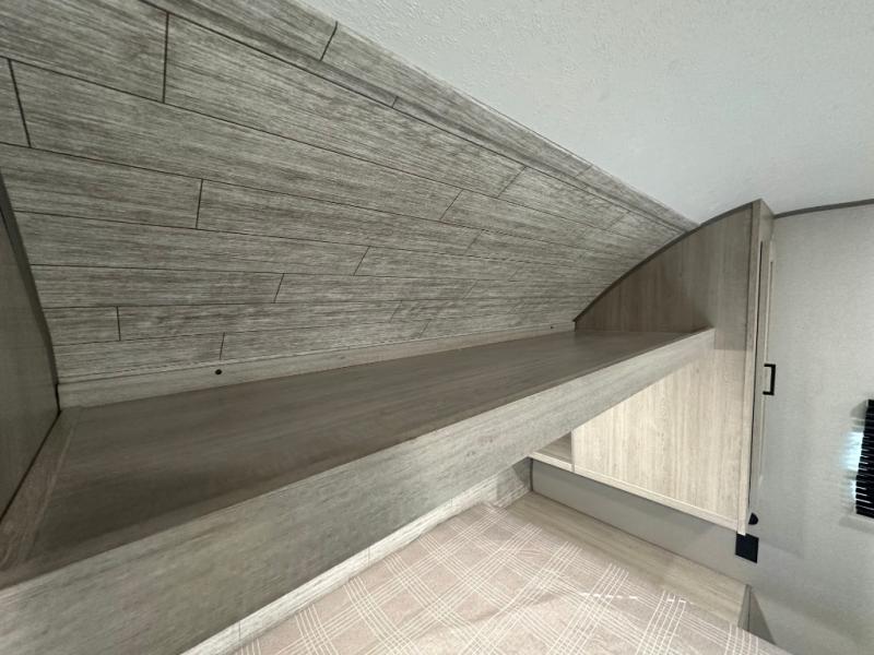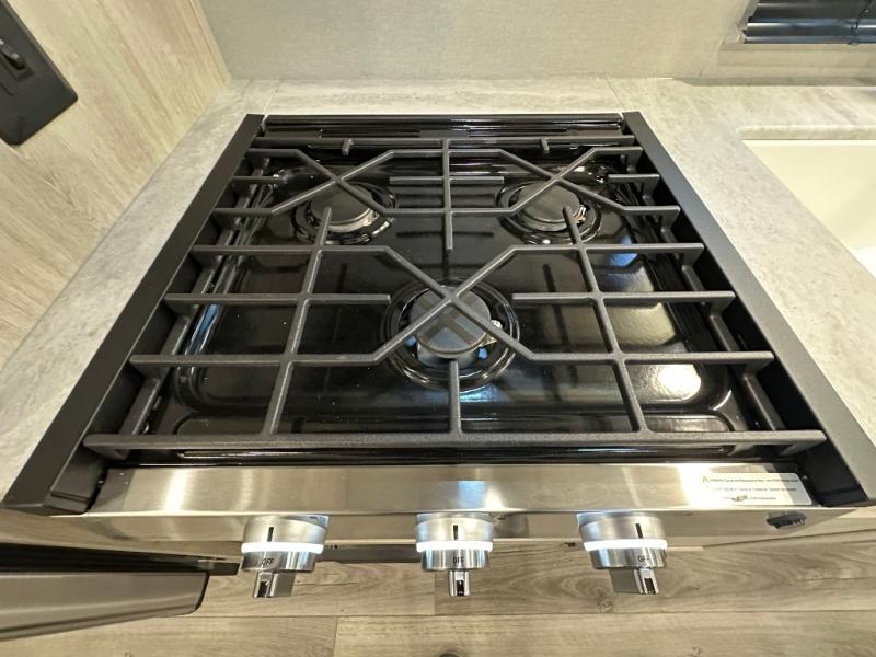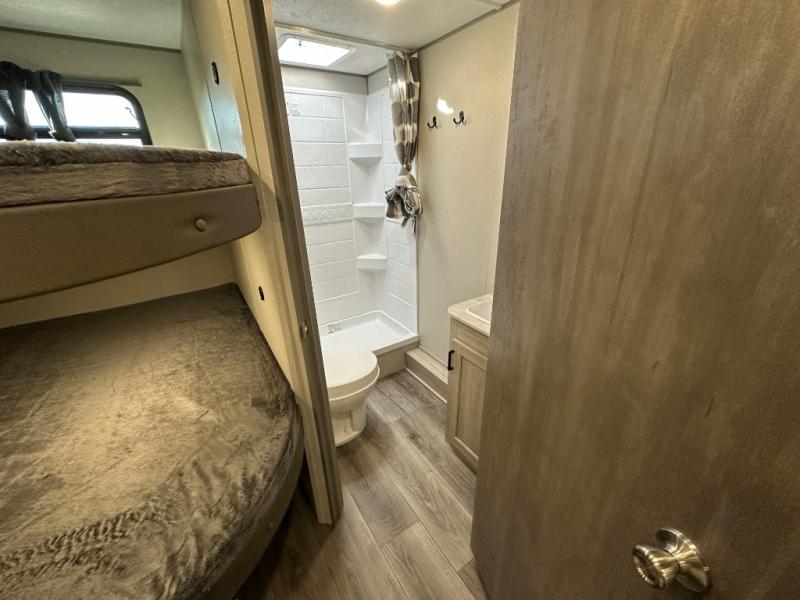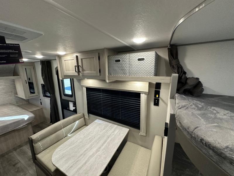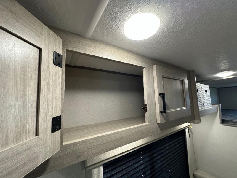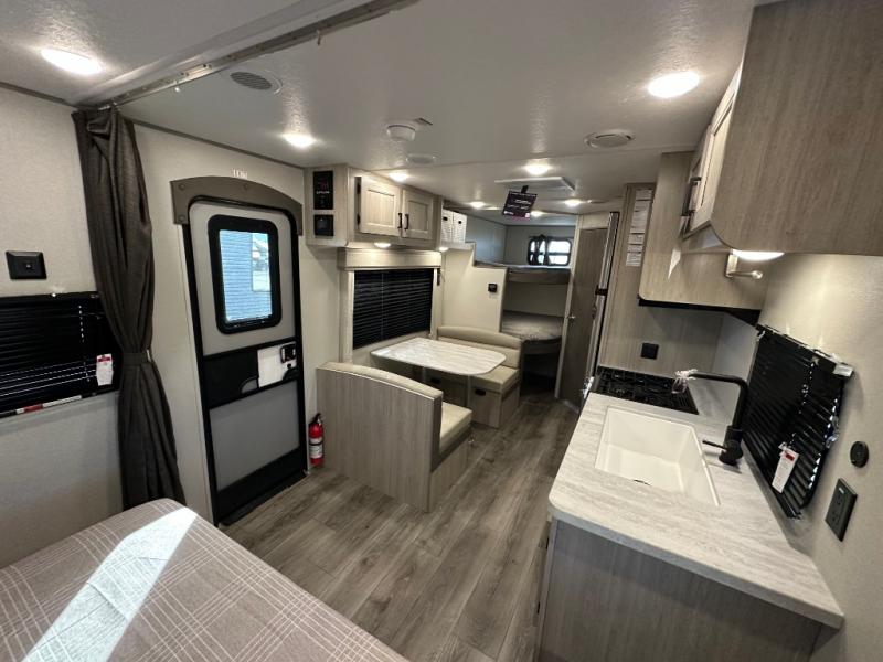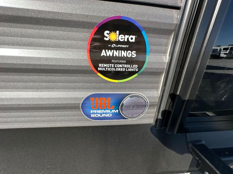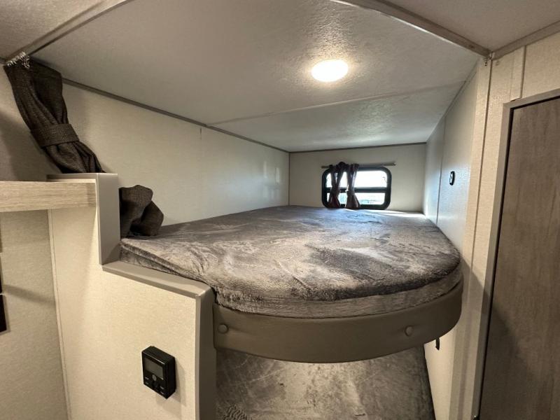 You'll love camping and spending time together in this travel trailer for seven! The bunk beds include under-bunk storage to keep bags out of the way, and the full bath is right next to the bunks for easy nighttime use. A semi-private bedroom up front includes a privacy curtain so you can get dressed each morning, and there are dual wardrobes to keep your things tidy. The chef of your group can whip up breakfast each morning on the three burner cooktop or in the GE stainless microwave, and there is a GE 10.7 cu. ft. 12V refrigerator to keep perishables fresh! A booth dinette provides a place to dine, or you can take your plate outdoors to sit under the 15' power awning with multicolored lights!