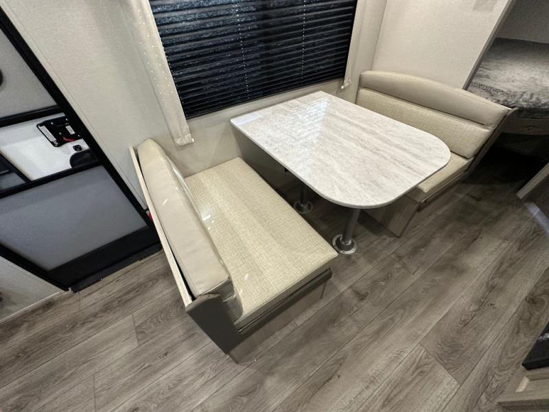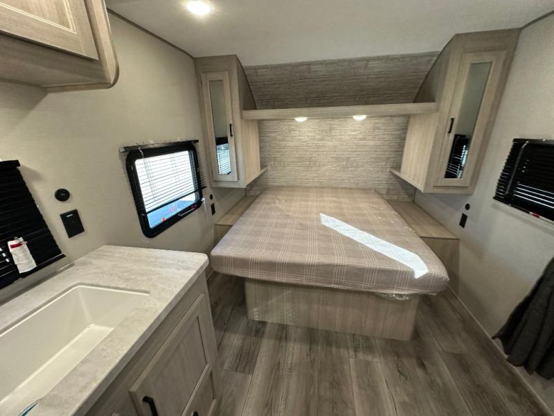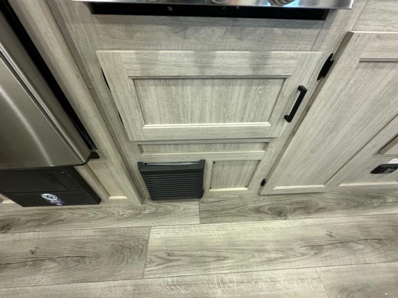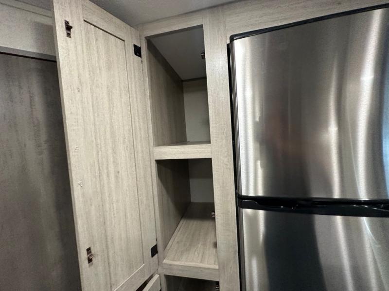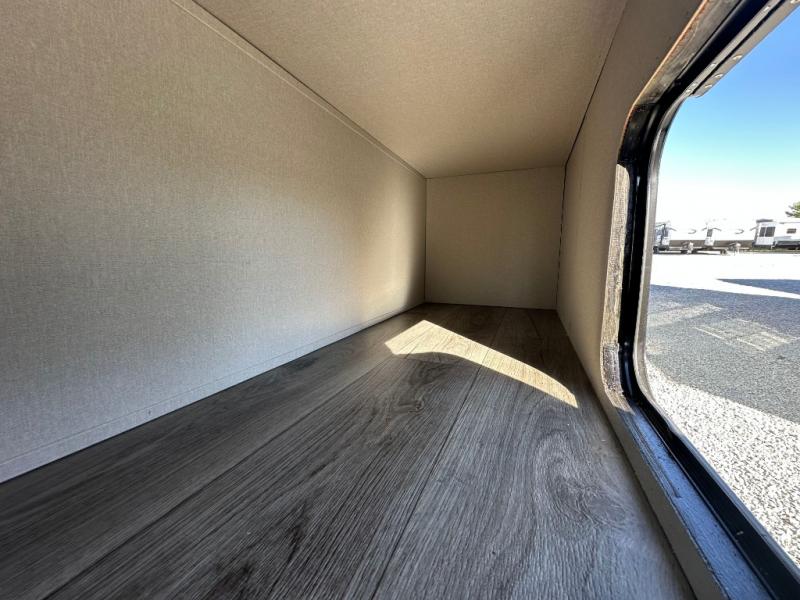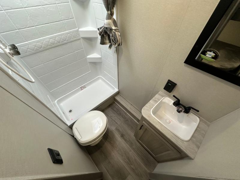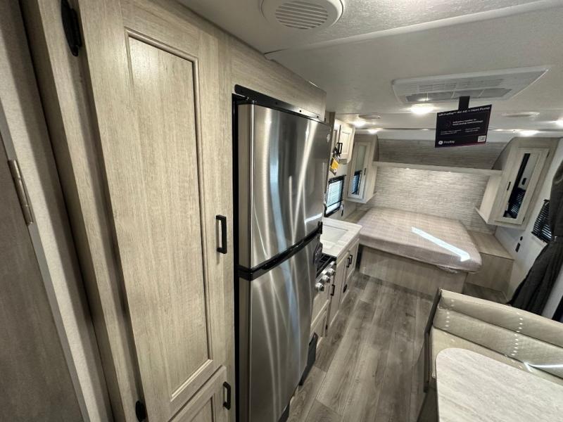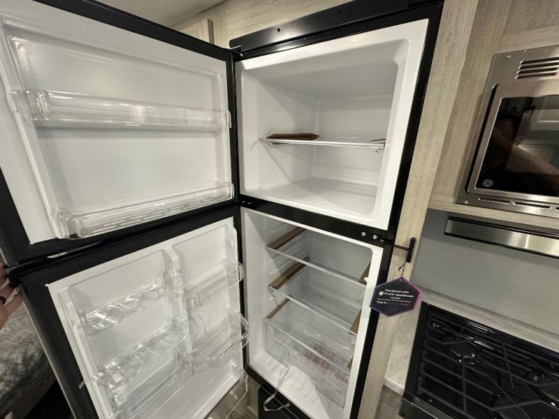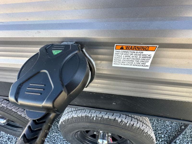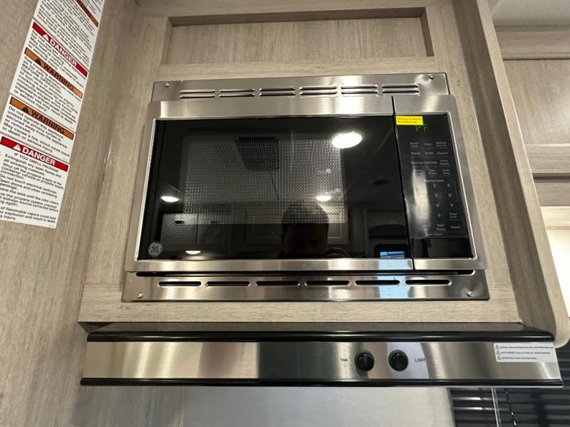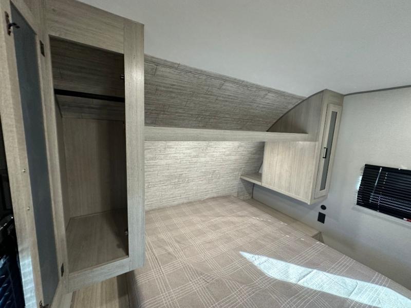 You'll love camping and spending time together in this travel trailer for seven! The bunk beds include under-bunk storage to keep bags out of the way, and the full bath is right next to the bunks for easy nighttime use. A semi-private bedroom up front includes a privacy curtain so you can get dressed each morning, and there are dual wardrobes to keep your things tidy. The chef of your group can whip up breakfast each morning on the three burner cooktop or in the GE stainless microwave, and there is a GE 10.7 cu. ft. 12V refrigerator to keep perishables fresh! A booth dinette provides a place to dine, or you can take your plate outdoors to sit under the 15' power awning with multicolored lights!