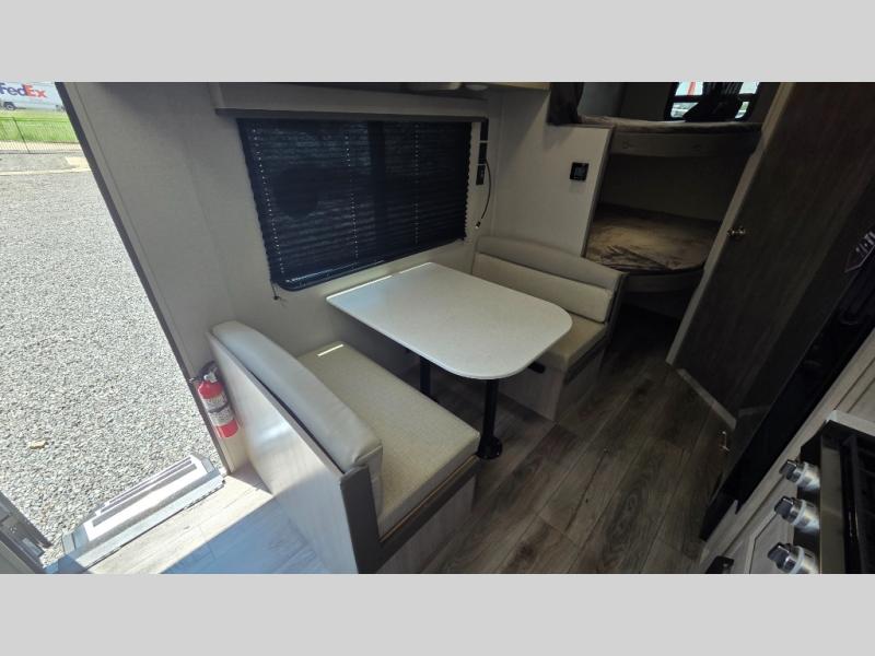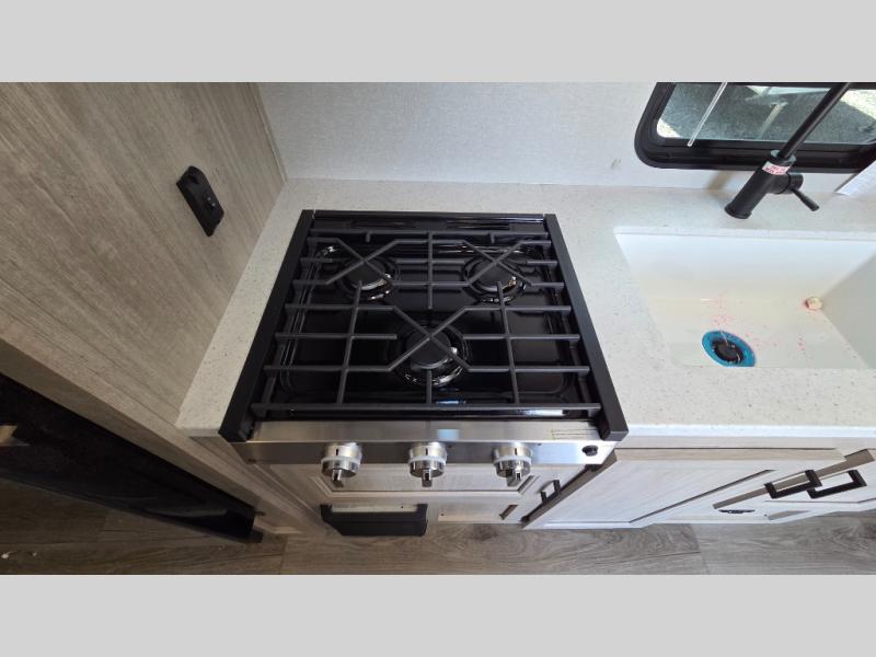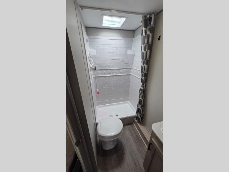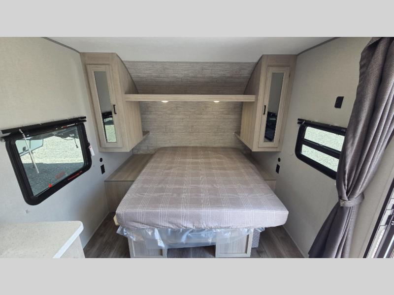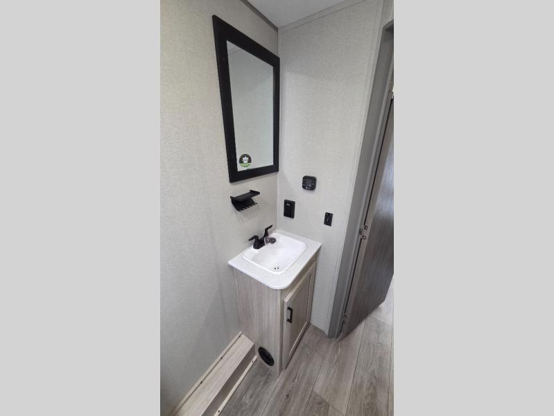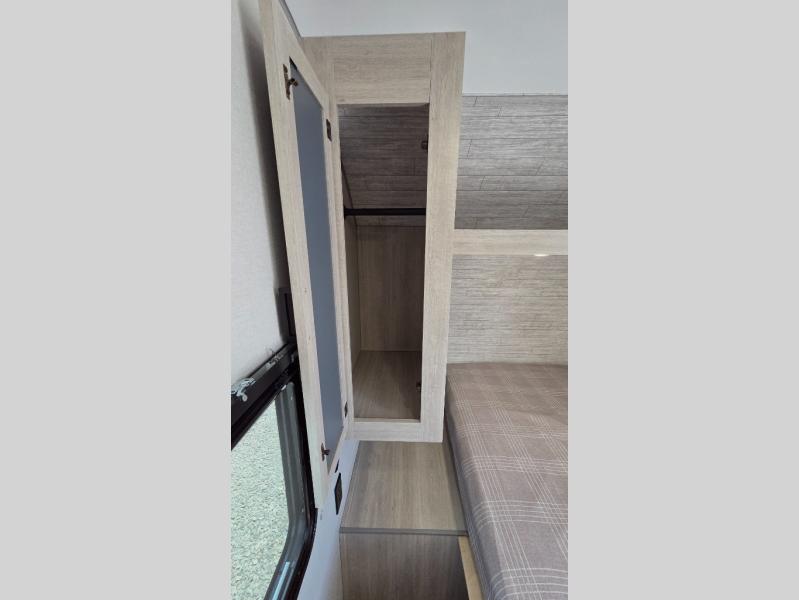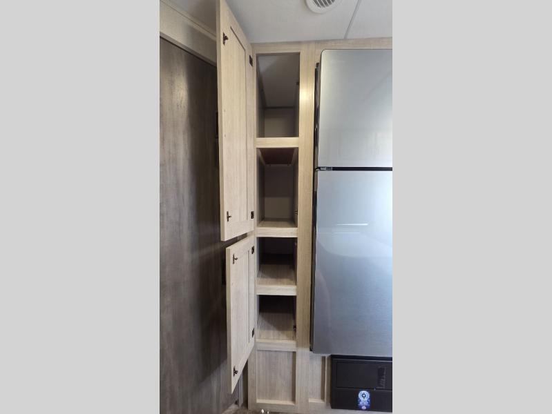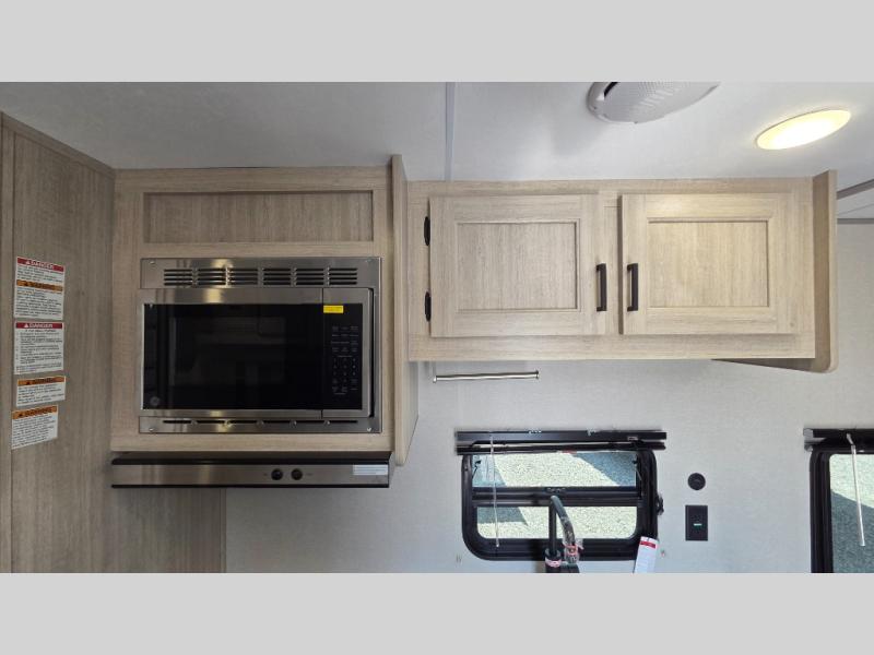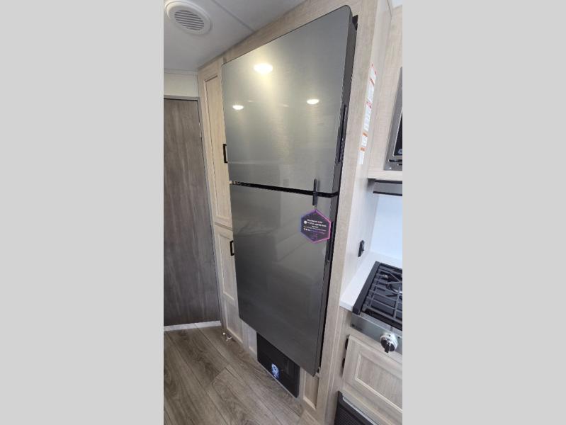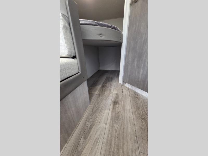 You'll love camping and spending time together in this travel trailer for seven! The bunk beds include under-bunk storage to keep bags out of the way, and the full bath is right next to the bunks for easy nighttime use. A semi-private bedroom up front includes a privacy curtain so you can get dressed each morning, and there are dual wardrobes to keep your things tidy. The chef of your group can whip up breakfast each morning on the three burner cooktop or in the GE stainless microwave, and there is a GE 10.7 cu. ft. 12V refrigerator to keep perishables fresh! A booth dinette provides a place to dine, or you can take your plate outdoors to sit under the 15' power awning with multicolored lights!