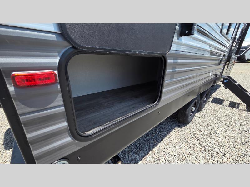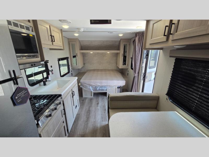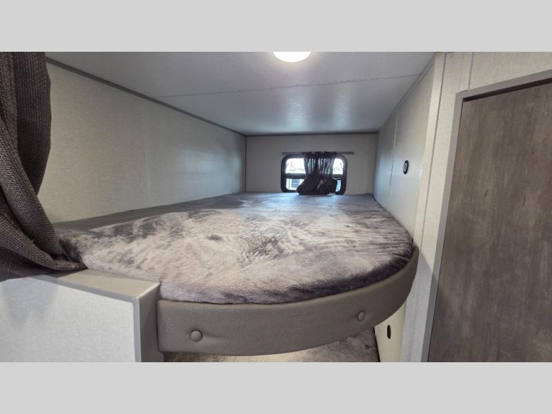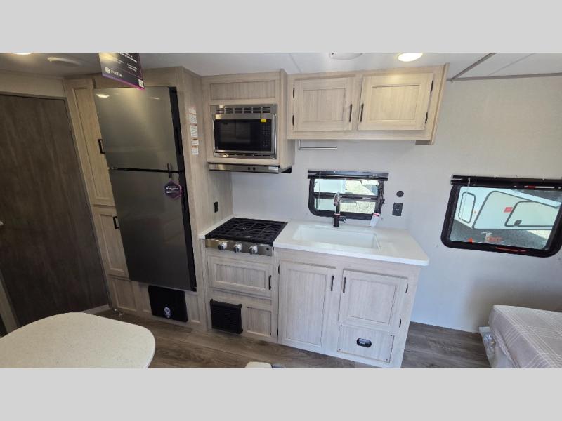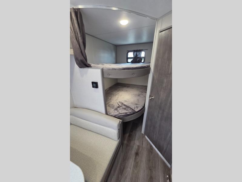 You'll love camping and spending time together in this travel trailer for seven! The bunk beds include under-bunk storage to keep bags out of the way, and the full bath is right next to the bunks for easy nighttime use. A semi-private bedroom up front includes a privacy curtain so you can get dressed each morning, and there are dual wardrobes to keep your things tidy. The chef of your group can whip up breakfast each morning on the three burner cooktop or in the GE stainless microwave, and there is a GE 10.7 cu. ft. 12V refrigerator to keep perishables fresh! A booth dinette provides a place to dine, or you can take your plate outdoors to sit under the 15' power awning with multicolored lights!