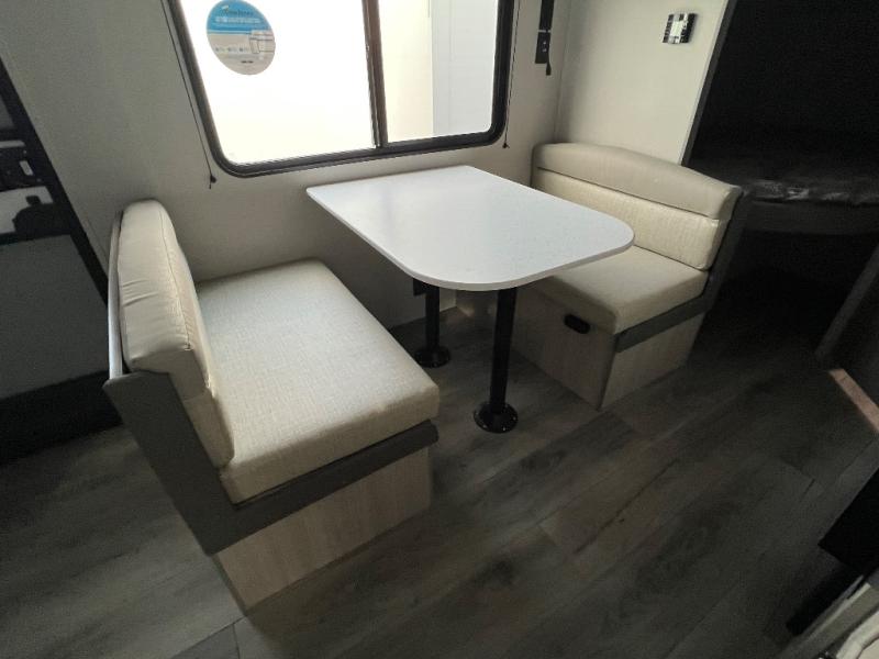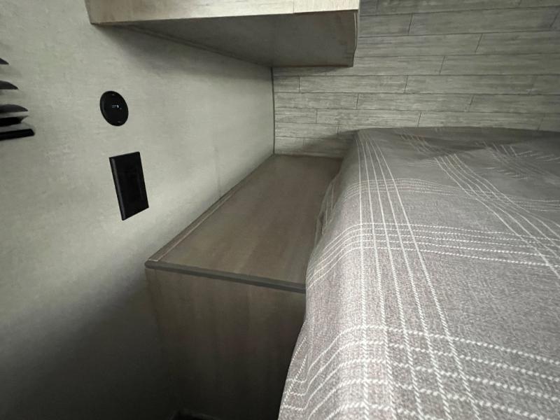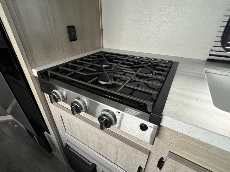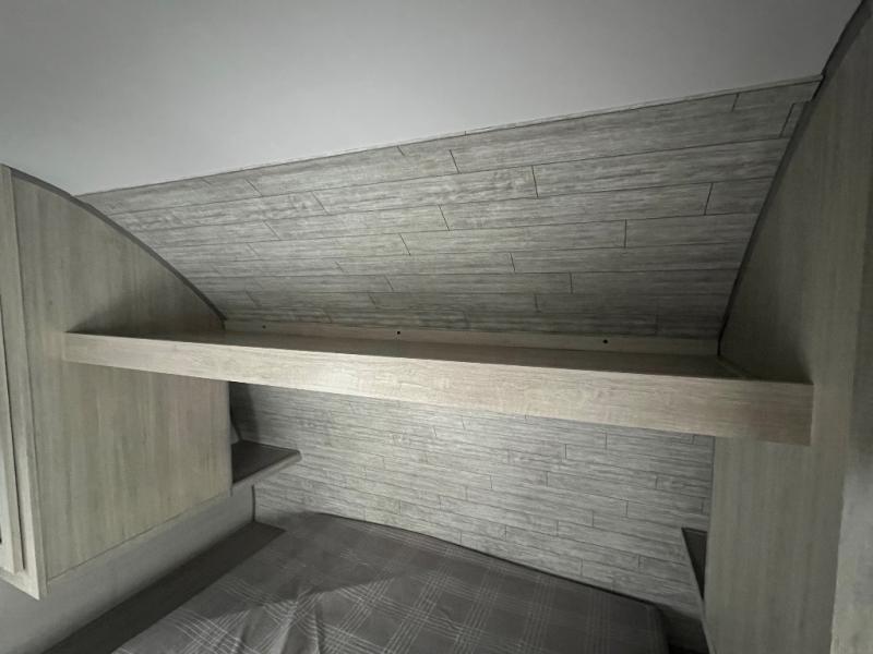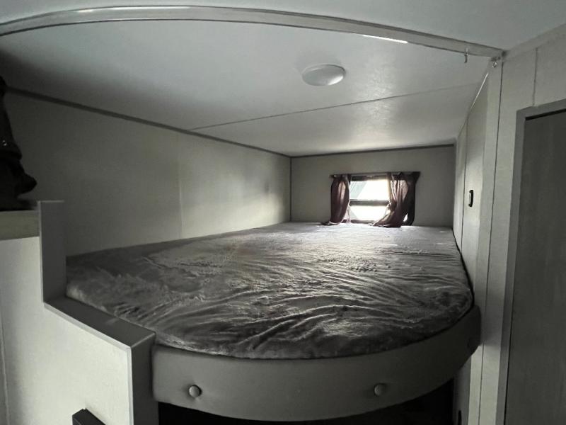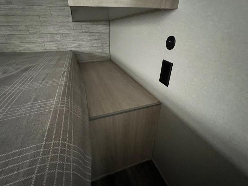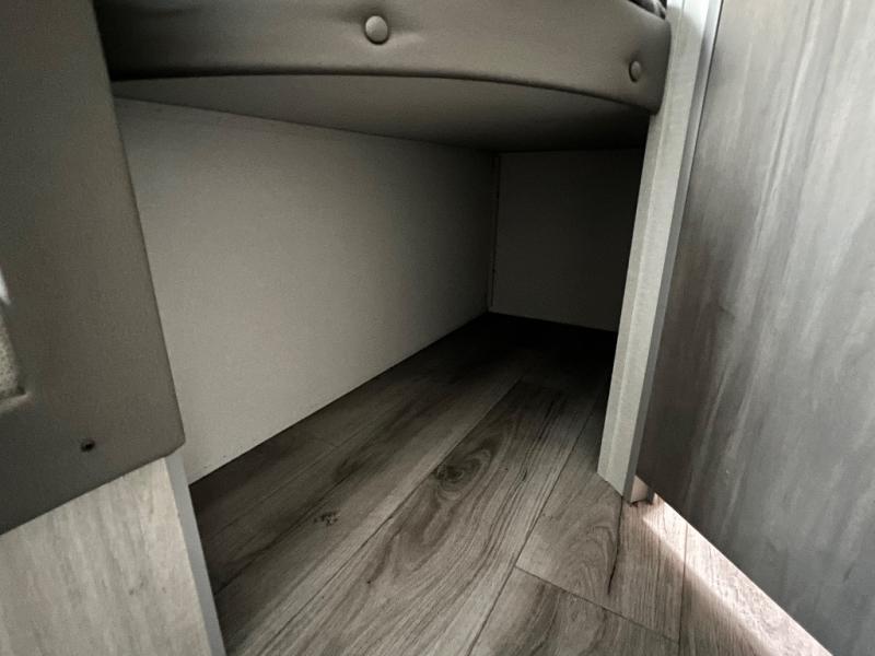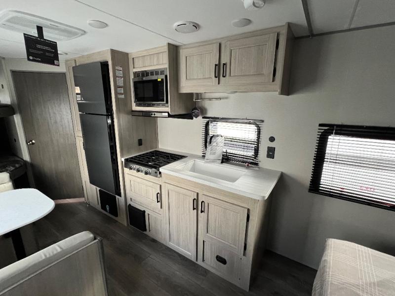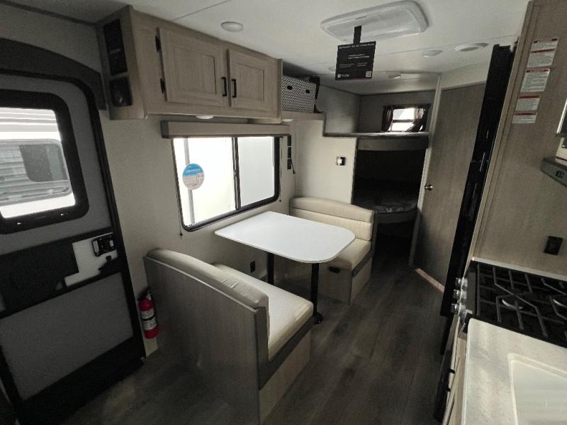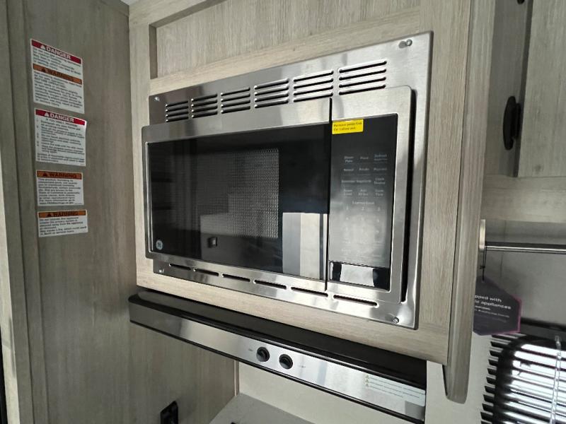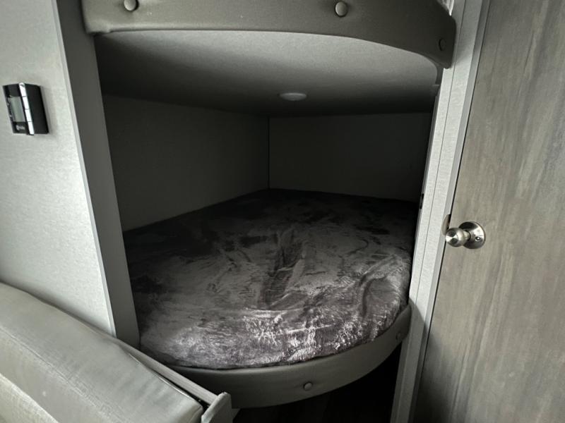 You'll love camping and spending time together in this travel trailer for seven! The bunk beds include under-bunk storage to keep bags out of the way, and the full bath is right next to the bunks for easy nighttime use. A semi-private bedroom up front includes a privacy curtain so you can get dressed each morning, and there are dual wardrobes to keep your things tidy. The chef of your group can whip up breakfast each morning on the three burner cooktop or in the GE stainless microwave, and there is a GE 10.7 cu. ft. 12V refrigerator to keep perishables fresh! A booth dinette provides a place to dine, or you can take your plate outdoors to sit under the 15' power awning with multicolored lights!