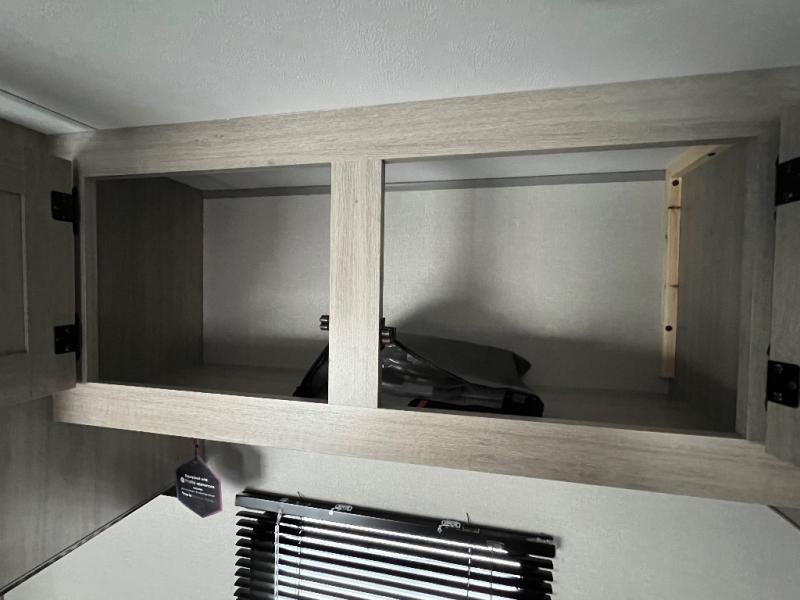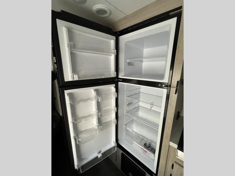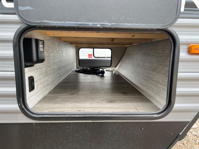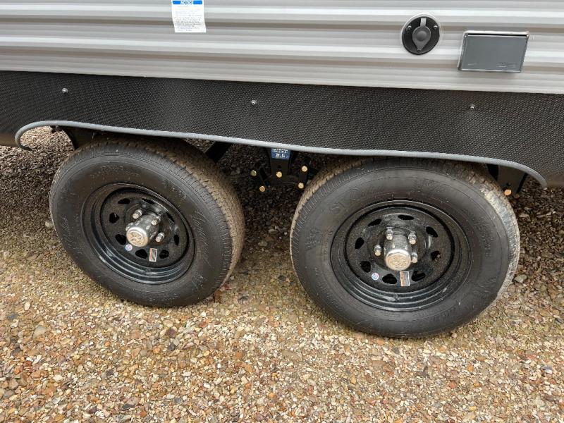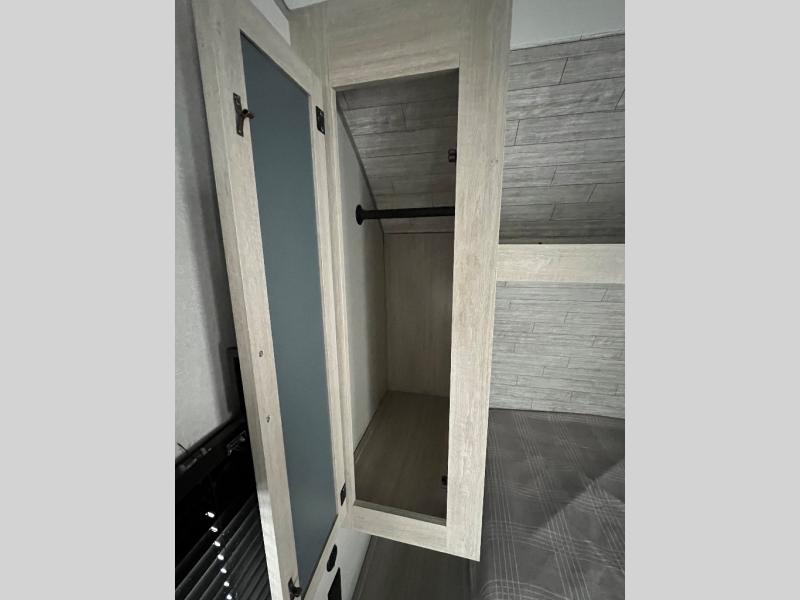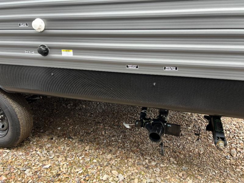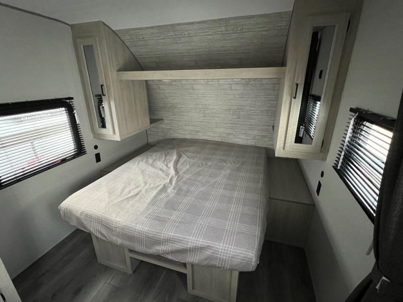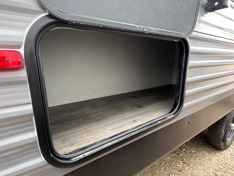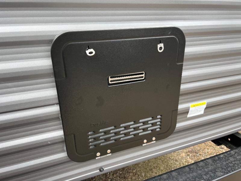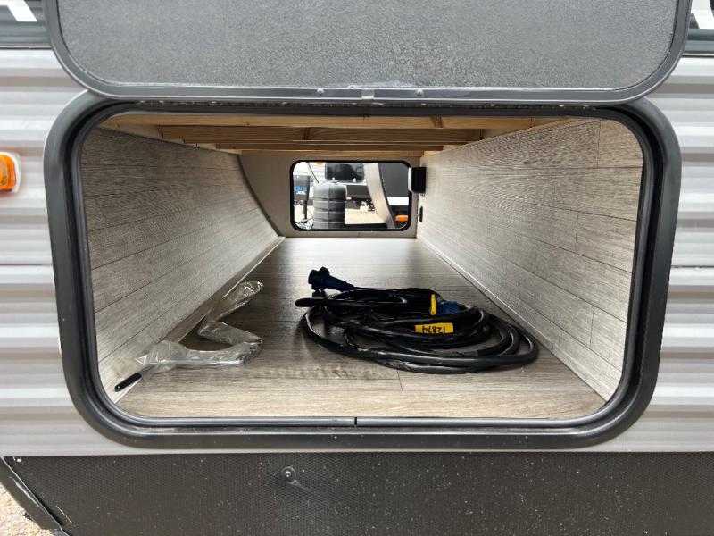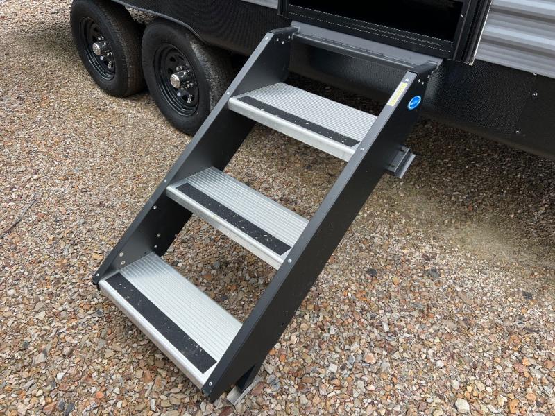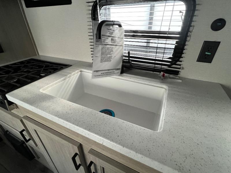 You'll love camping and spending time together in this travel trailer for seven! The bunk beds include under-bunk storage to keep bags out of the way, and the full bath is right next to the bunks for easy nighttime use. A semi-private bedroom up front includes a privacy curtain so you can get dressed each morning, and there are dual wardrobes to keep your things tidy. The chef of your group can whip up breakfast each morning on the three burner cooktop or in the GE stainless microwave, and there is a GE 10.7 cu. ft. 12V refrigerator to keep perishables fresh! A booth dinette provides a place to dine, or you can take your plate outdoors to sit under the 15' power awning with multicolored lights!