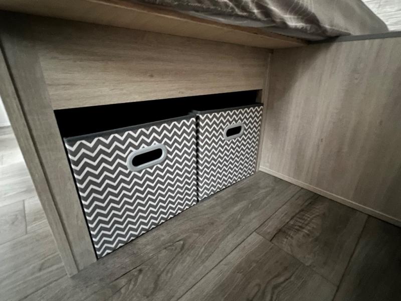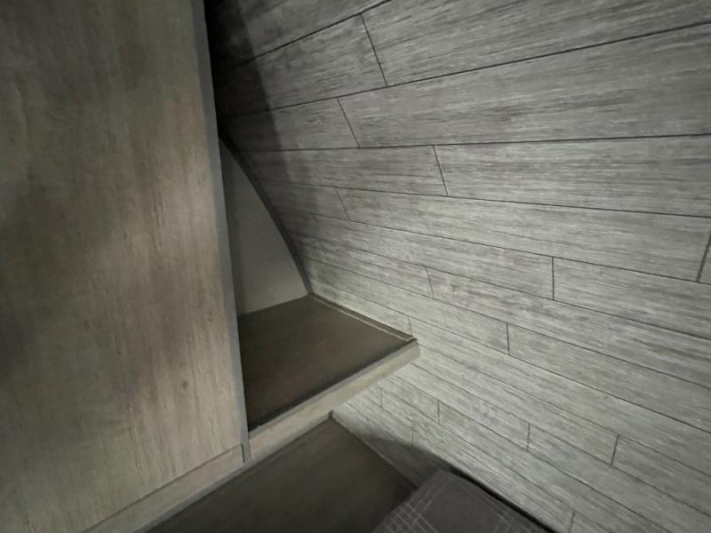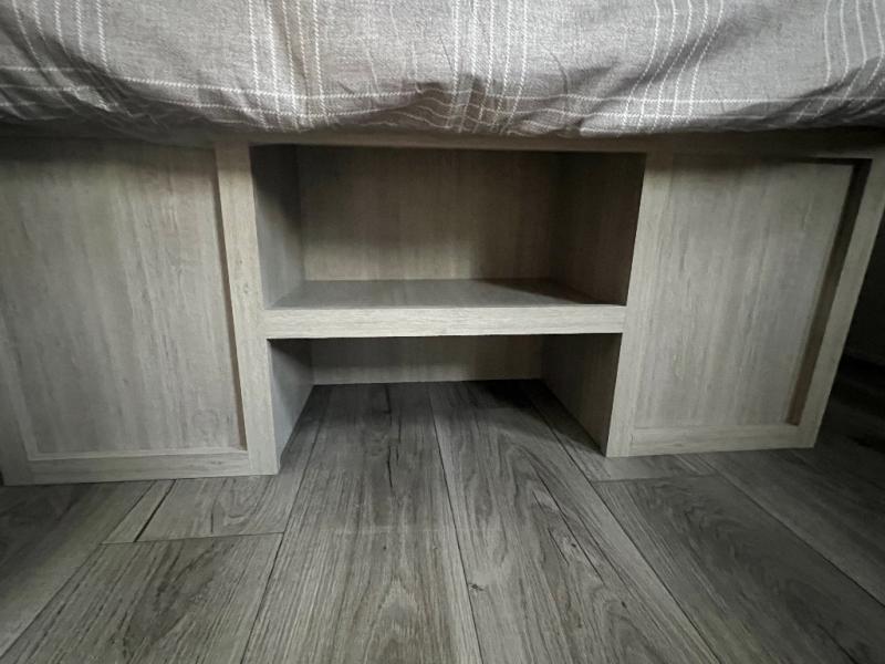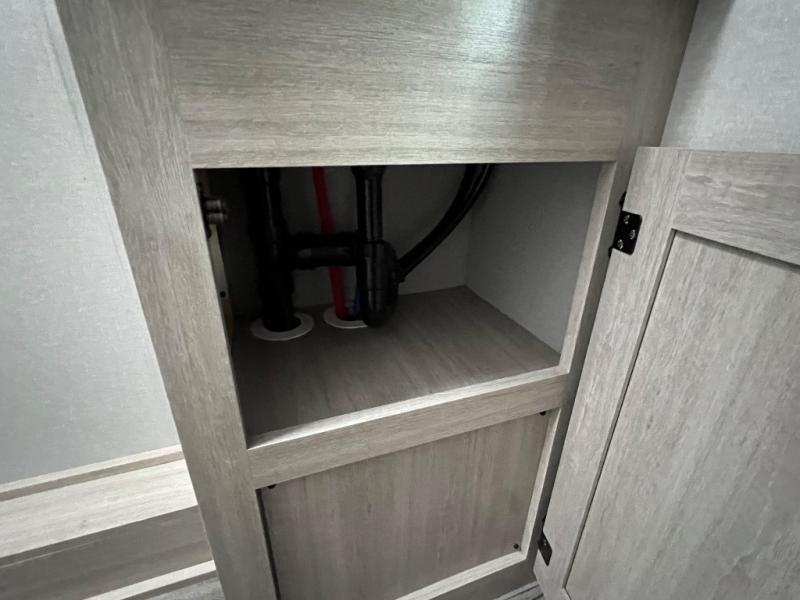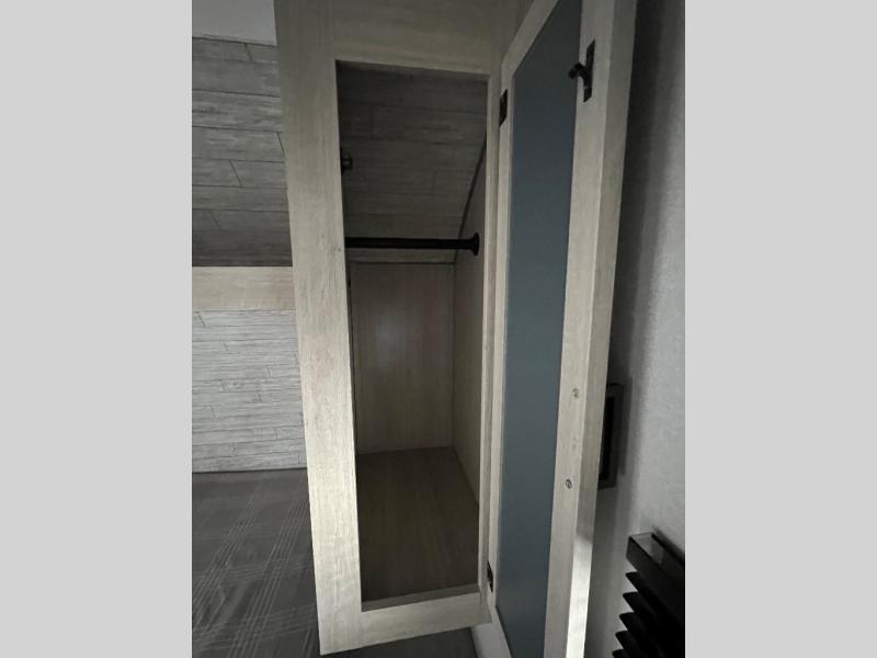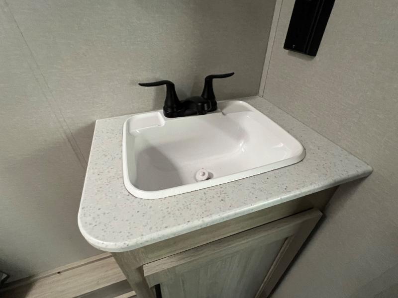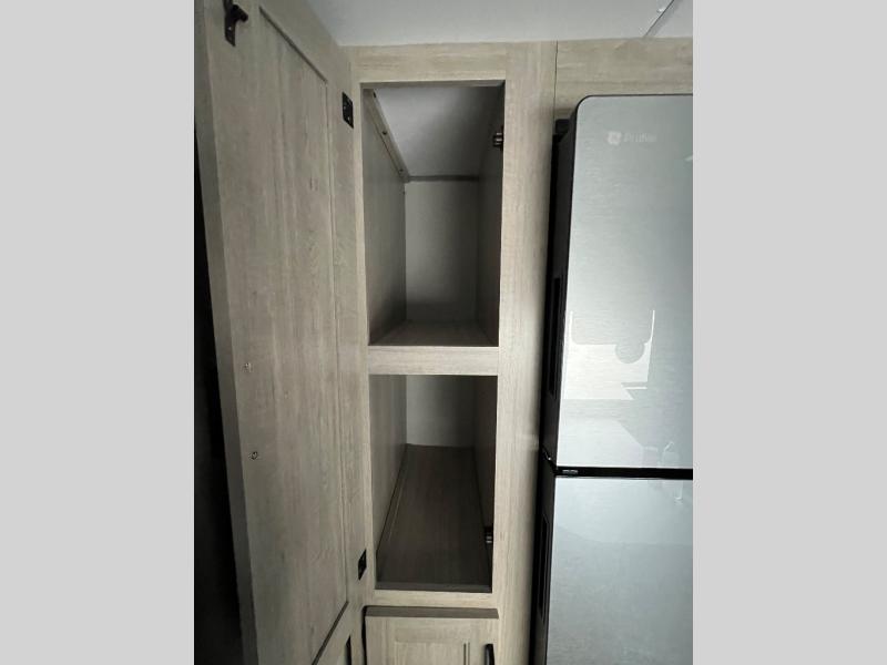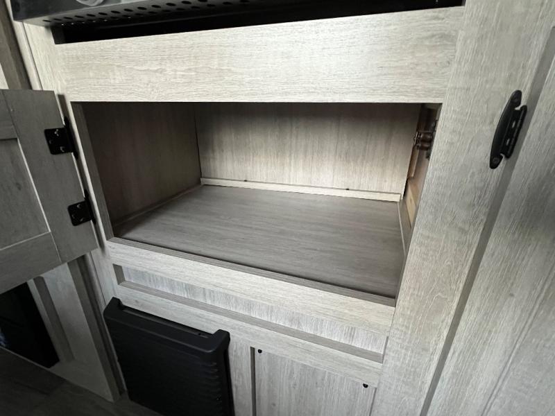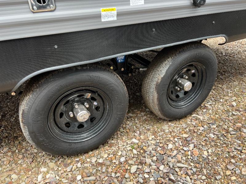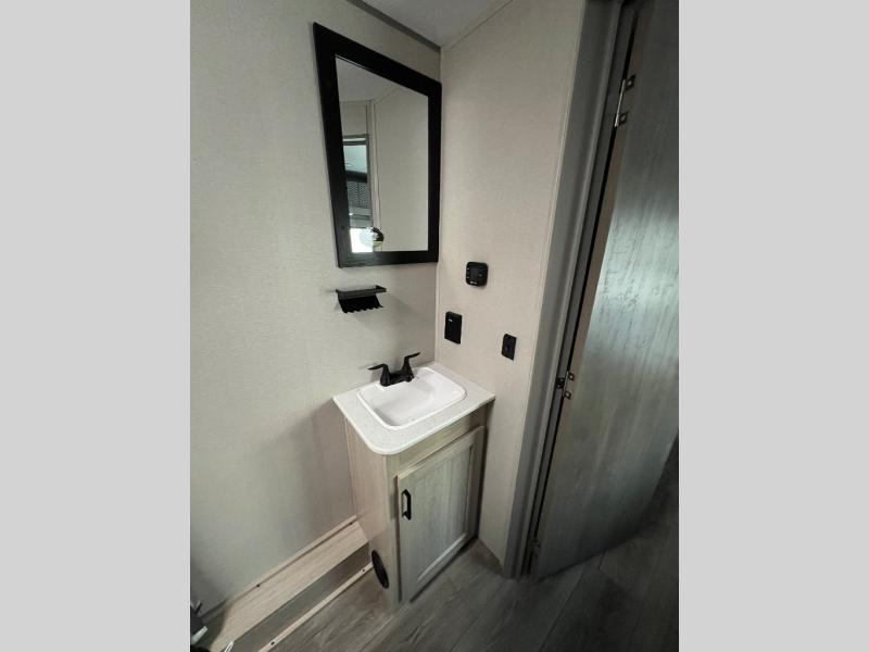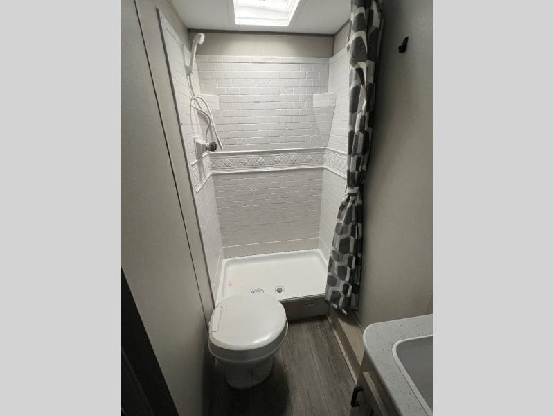 You'll love camping and spending time together in this travel trailer for seven! The bunk beds include under-bunk storage to keep bags out of the way, and the full bath is right next to the bunks for easy nighttime use. A semi-private bedroom up front includes a privacy curtain so you can get dressed each morning, and there are dual wardrobes to keep your things tidy. The chef of your group can whip up breakfast each morning on the three burner cooktop or in the GE stainless microwave, and there is a GE 10.7 cu. ft. 12V refrigerator to keep perishables fresh! A booth dinette provides a place to dine, or you can take your plate outdoors to sit under the 15' power awning with multicolored lights!