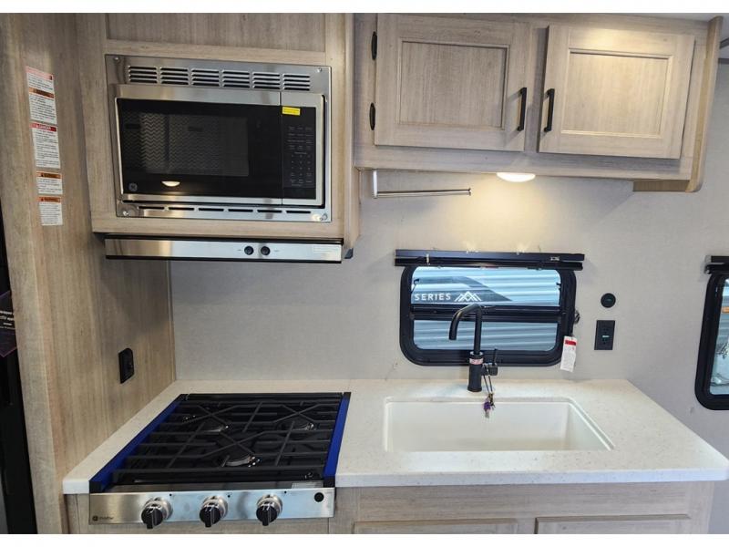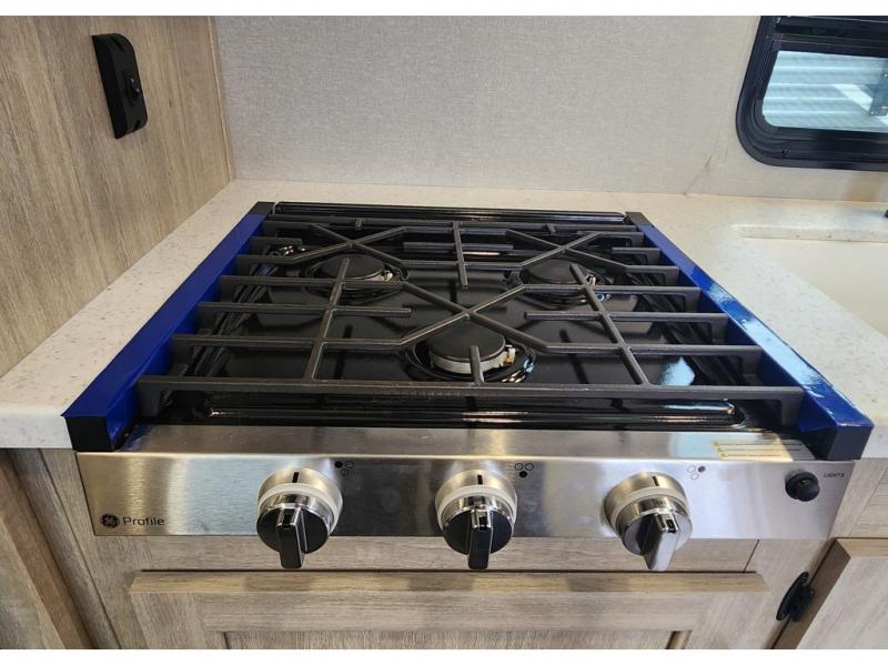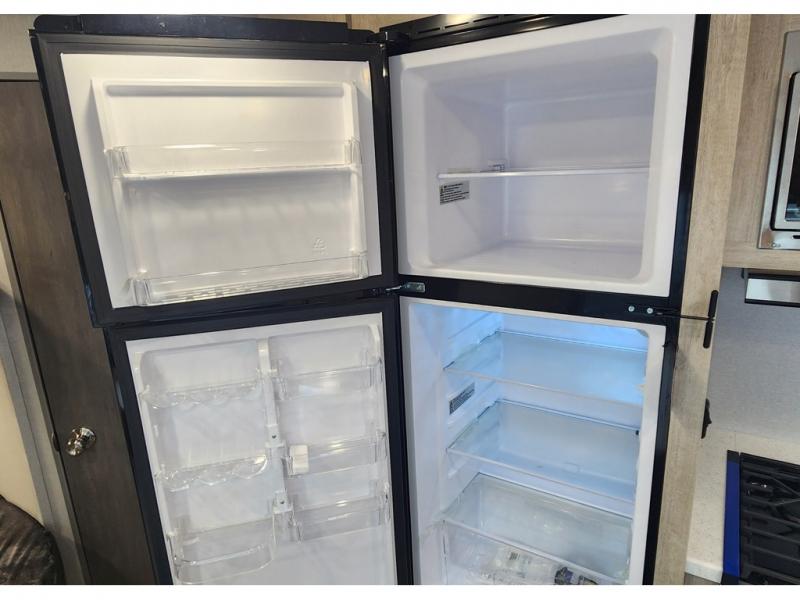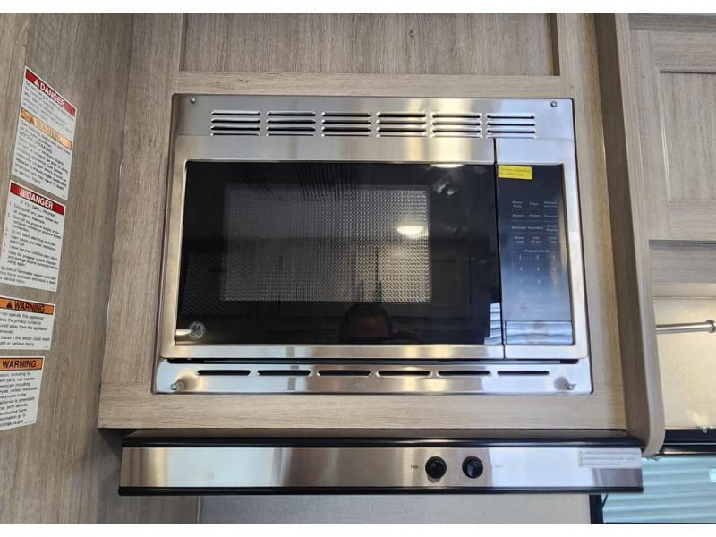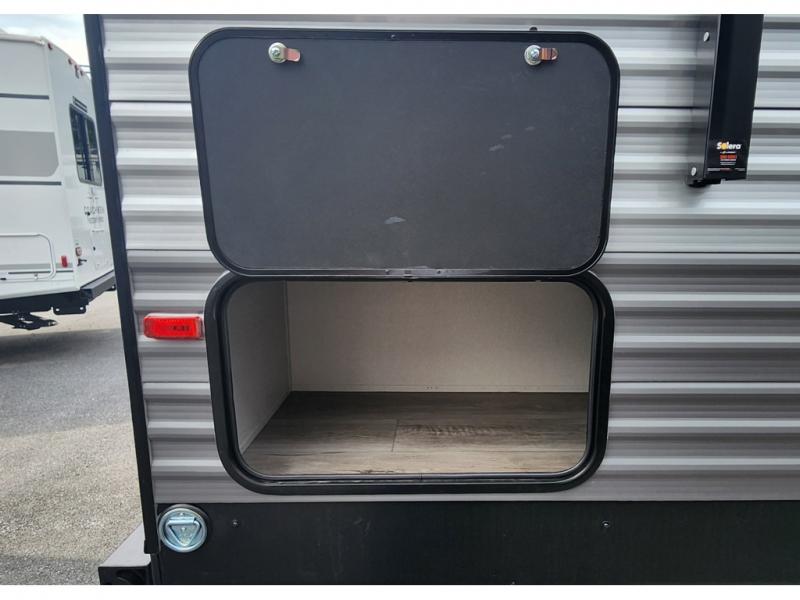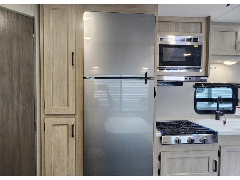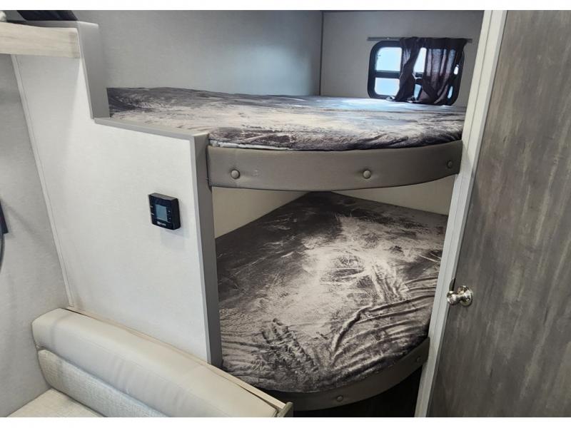 You'll love camping and spending time together in this travel trailer for seven! The bunk beds include under-bunk storage to keep bags out of the way, and the full bath is right next to the bunks for easy nighttime use. A semi-private bedroom up front includes a privacy curtain so you can get dressed each morning, and there are dual wardrobes to keep your things tidy. The chef of your group can whip up breakfast each morning on the three burner cooktop or in the GE stainless microwave, and there is a GE 10.7 cu. ft. 12V refrigerator to keep perishables fresh! A booth dinette provides a place to dine, or you can take your plate outdoors to sit under the 15' power awning with multicolored lights!