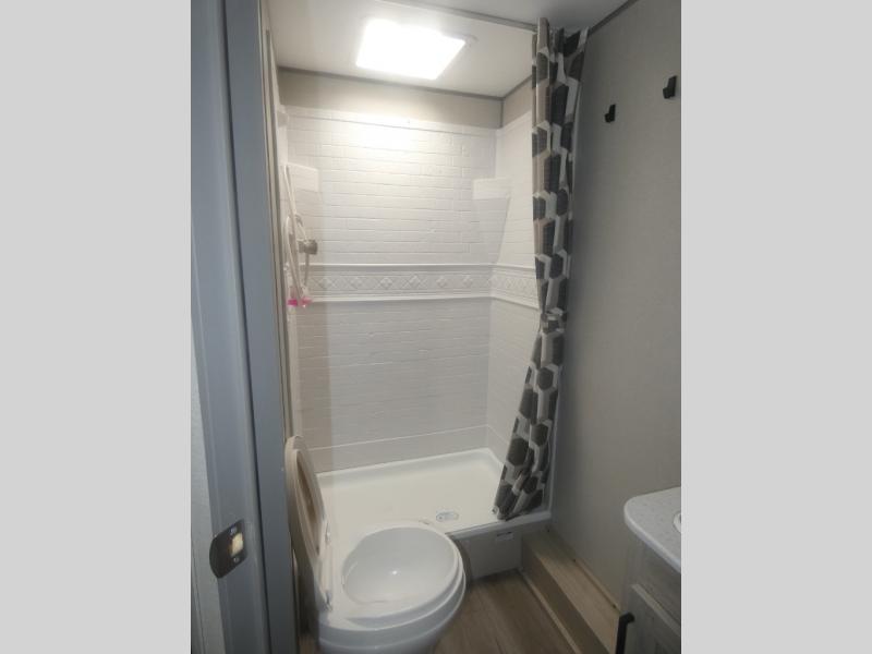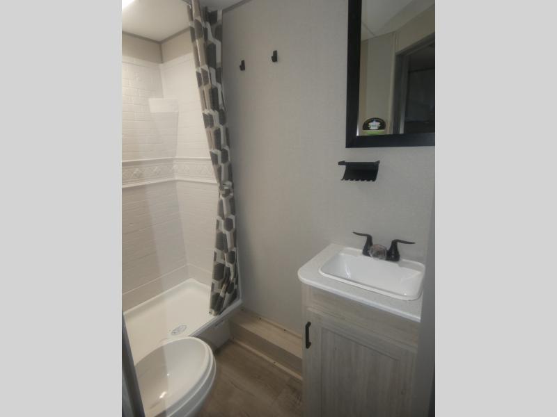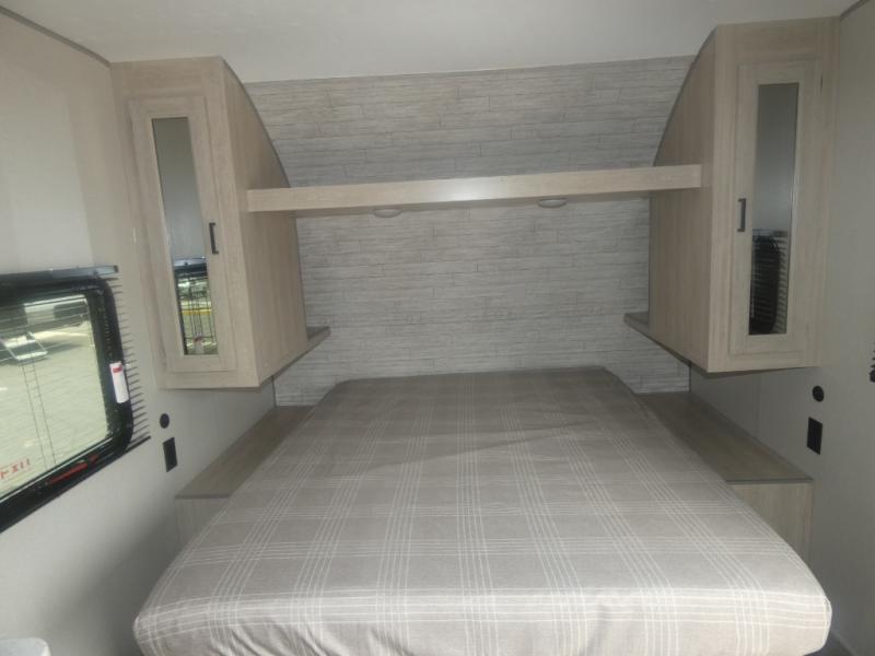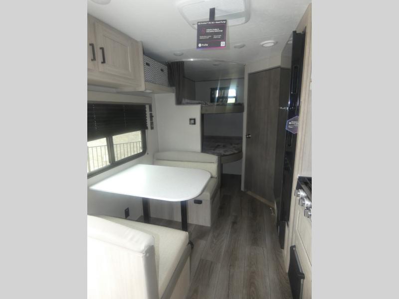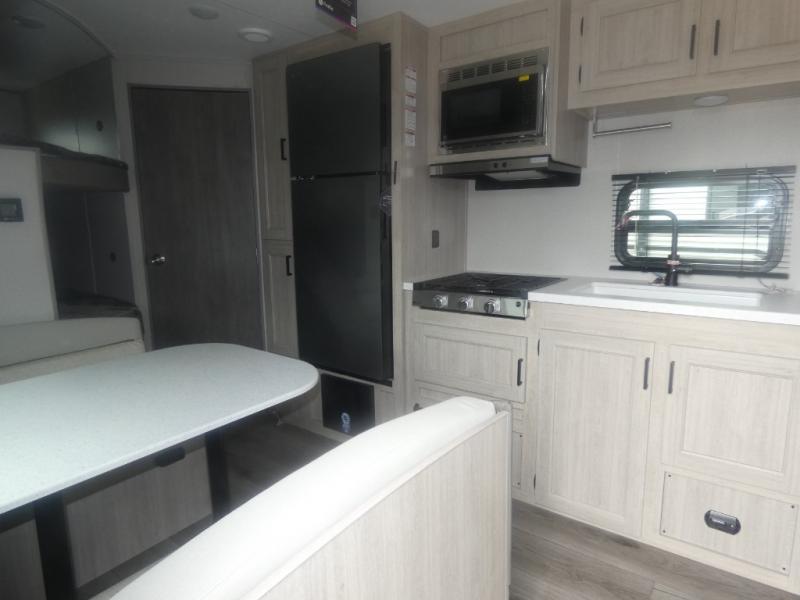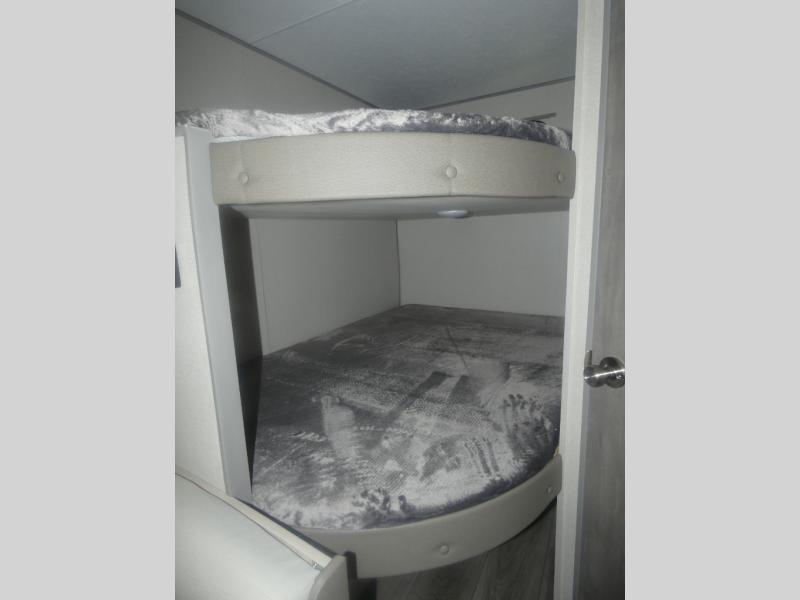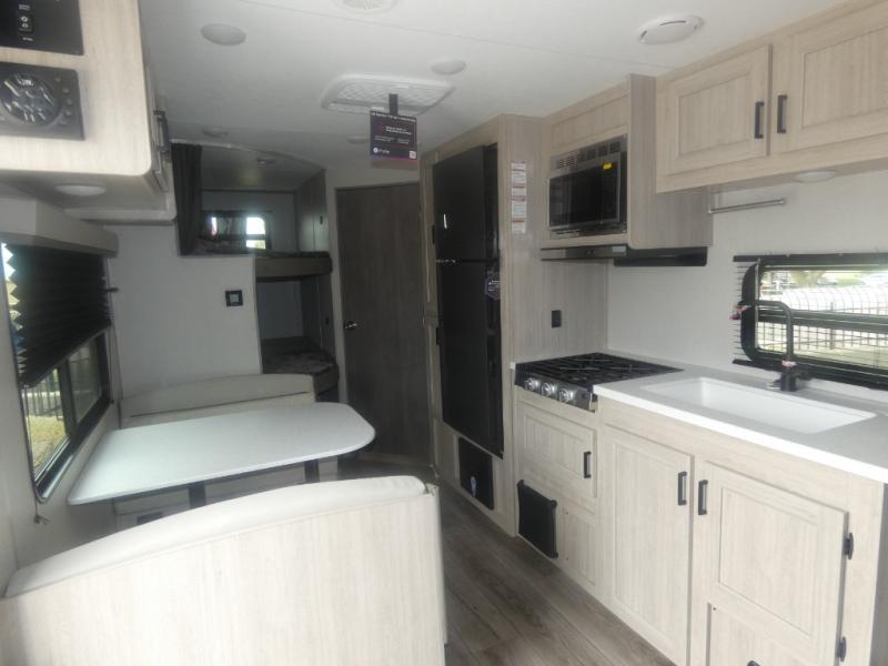 You'll love camping and spending time together in this travel trailer for seven! The bunk beds include under-bunk storage to keep bags out of the way, and the full bath is right next to the bunks for easy nighttime use. A semi-private bedroom up front includes a privacy curtain so you can get dressed each morning, and there are dual wardrobes to keep your things tidy. The chef of your group can whip up breakfast each morning on the three burner cooktop or in the GE stainless microwave, and there is a GE 10.7 cu. ft. 12V refrigerator to keep perishables fresh! A booth dinette provides a place to dine, or you can take your plate outdoors to sit under the 15' power awning with multicolored lights!