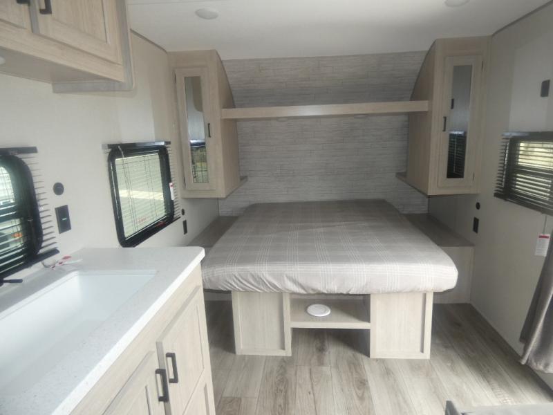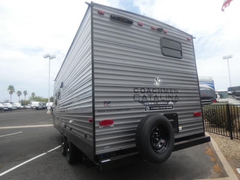 With any Catalina Summit Series 8 by Coachmen you will enjoy an affordable travel trailer packed with at-home comforts! The solid construction includes a Norco electromagnetic powder coated chassis, a seamless Alpha roof membrane, and full length frame outriggers for maximum support and durability. EZ lube axles with leaf spring suspension and self adjusting brakes provide smooth towing from home to campground, and the premium exterior graphics package is sure to turn heads as you travel down the highway. You will love the features included, such as a JBL Aura Cube media center, magnetic baggage door latches, 4,000 lumen interior touch lighting, and the list goes on!