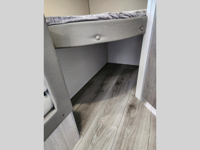 You'll love camping and spending time together in this travel trailer for seven! The bunk beds include under-bunk storage to keep bags out of the way, and the full bath is right next to the bunks for easy nighttime use. A semi-private bedroom up front includes a privacy curtain so you can get dressed each morning, and there are dual wardrobes to keep your things tidy. The chef of your group can whip up breakfast each morning on the three burner cooktop or in the GE stainless microwave, and there is a GE 10.7 cu. ft. 12V refrigerator to keep perishables fresh! A booth dinette provides a place to dine, or you can take your plate outdoors to sit under the 15' power awning with multicolored lights!