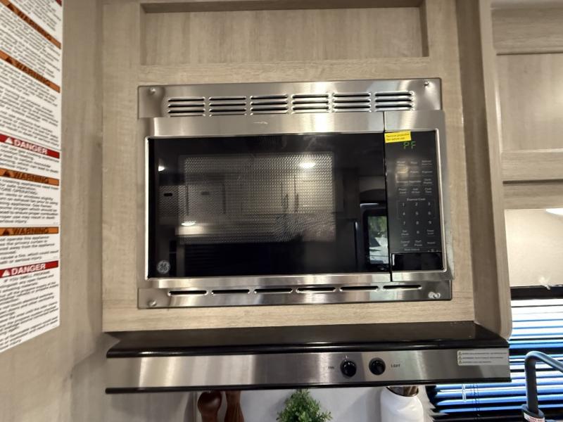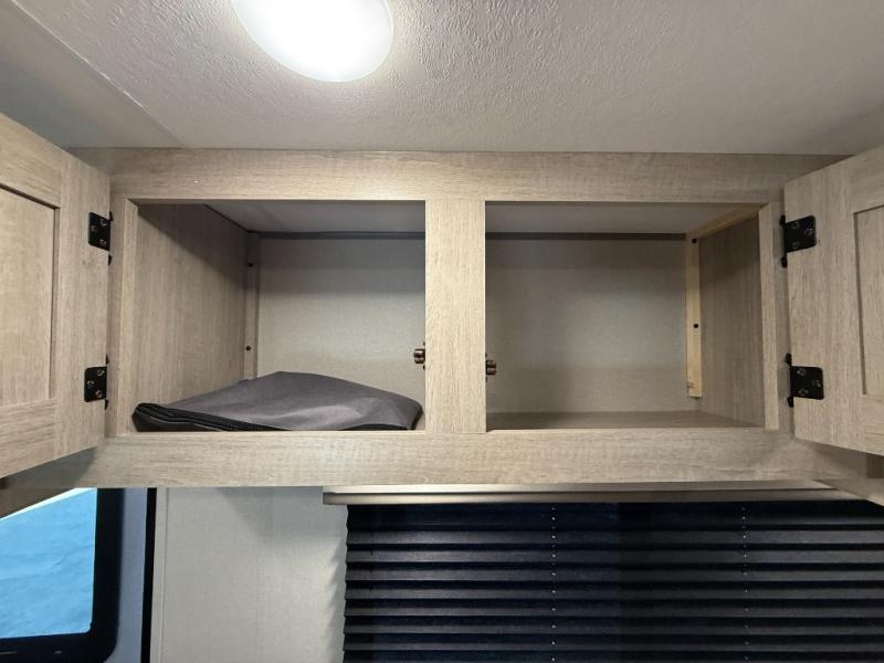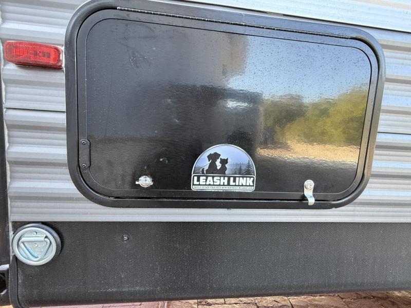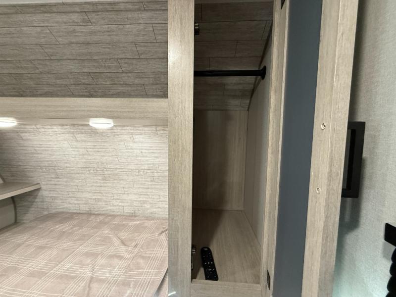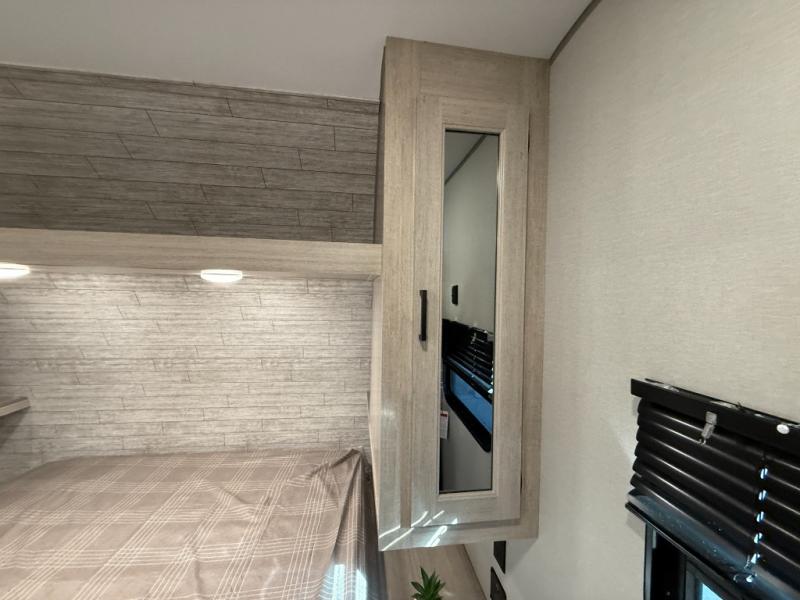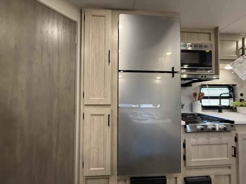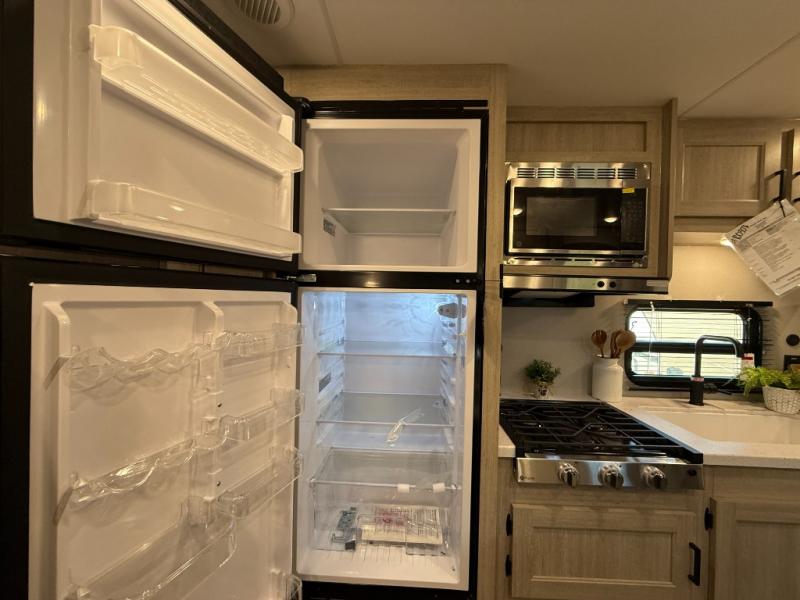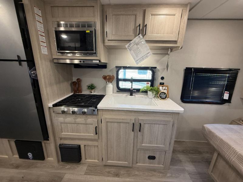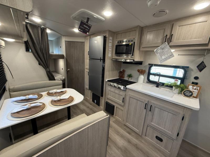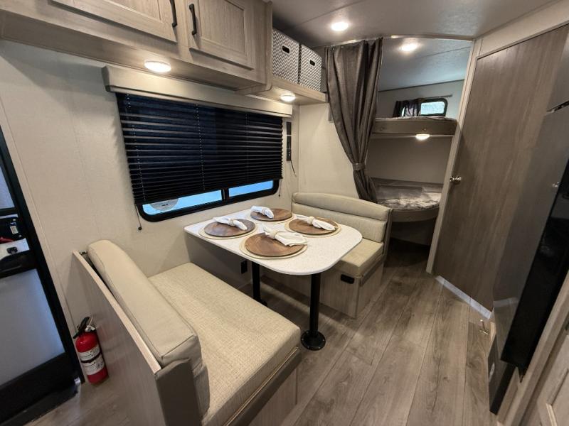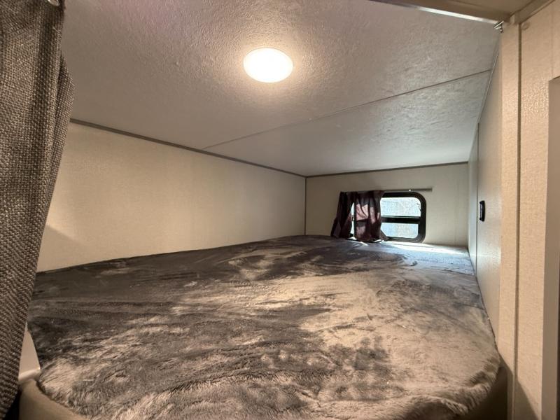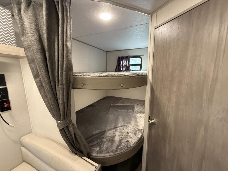 You'll love camping and spending time together in this travel trailer for seven! The bunk beds include under-bunk storage to keep bags out of the way, and the full bath is right next to the bunks for easy nighttime use. A semi-private bedroom up front includes a privacy curtain so you can get dressed each morning, and there are dual wardrobes to keep your things tidy. The chef of your group can whip up breakfast each morning on the three burner cooktop or in the GE stainless microwave, and there is a GE 10.7 cu. ft. 12V refrigerator to keep perishables fresh! A booth dinette provides a place to dine, or you can take your plate outdoors to sit under the 15' power awning with multicolored lights!