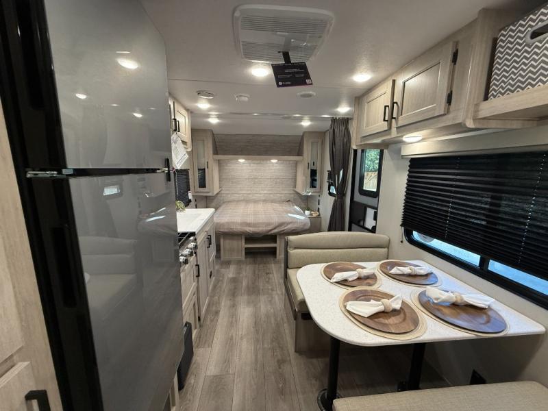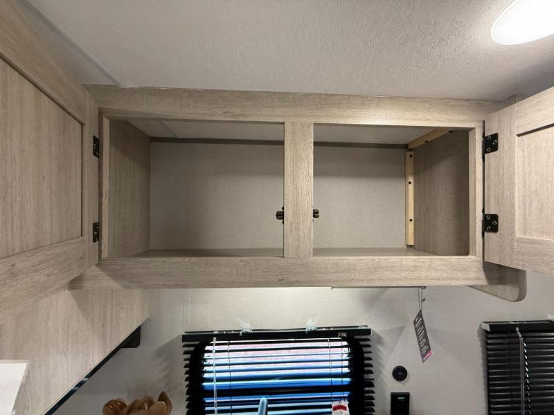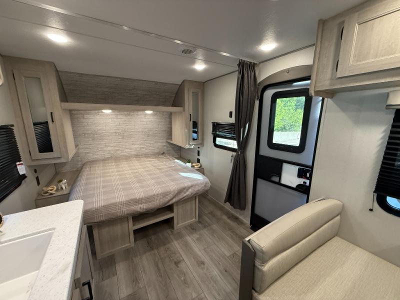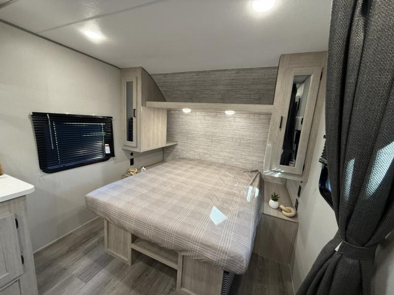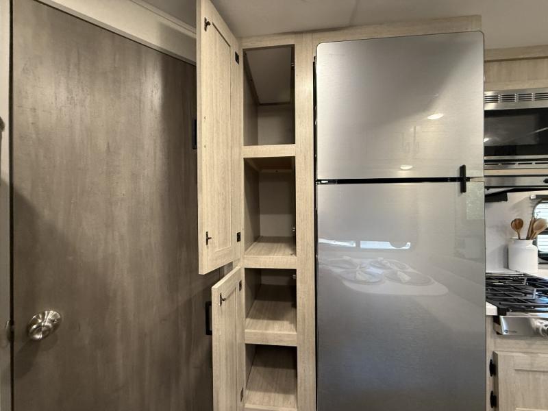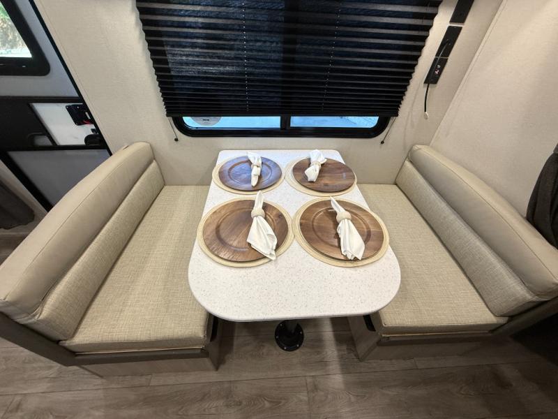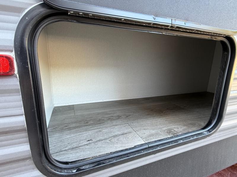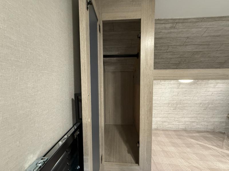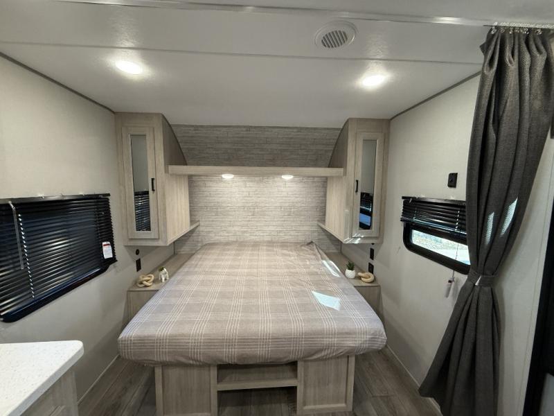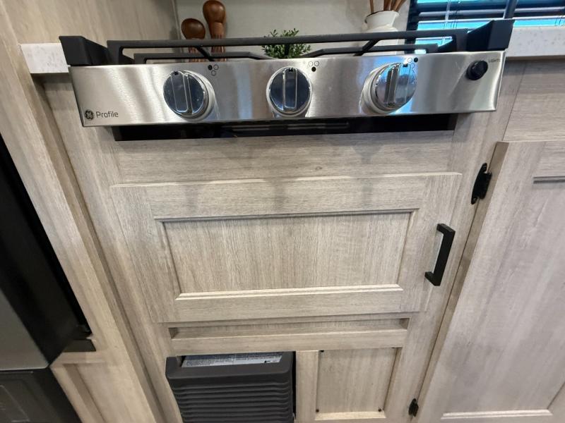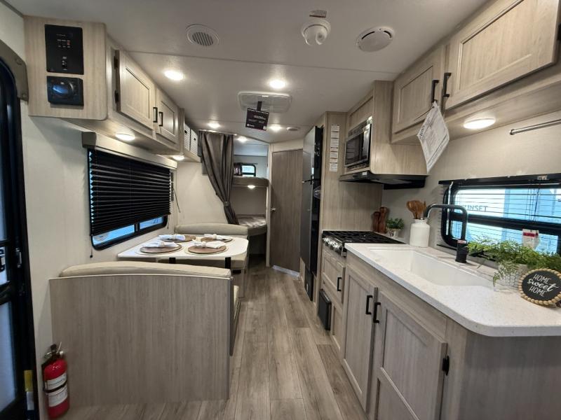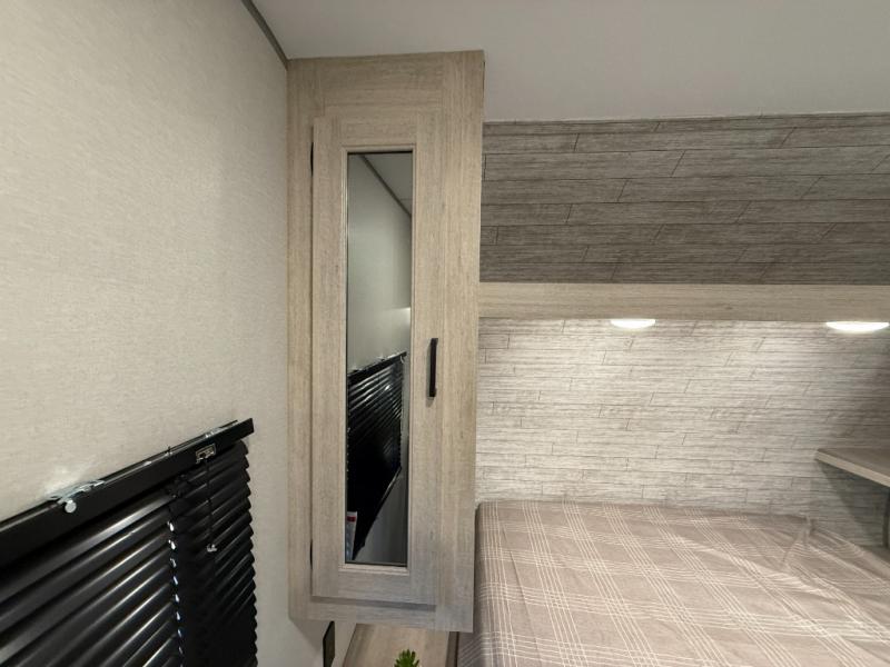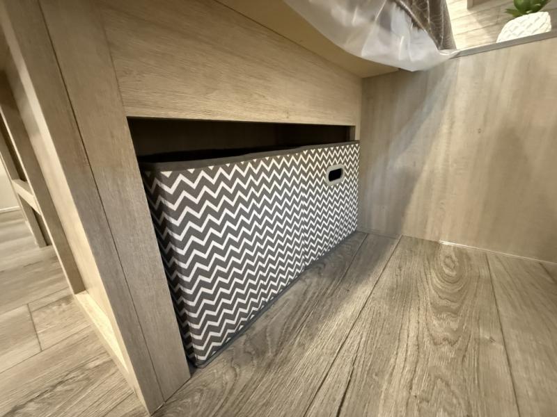 You'll love camping and spending time together in this travel trailer for seven! The bunk beds include under-bunk storage to keep bags out of the way, and the full bath is right next to the bunks for easy nighttime use. A semi-private bedroom up front includes a privacy curtain so you can get dressed each morning, and there are dual wardrobes to keep your things tidy. The chef of your group can whip up breakfast each morning on the three burner cooktop or in the GE stainless microwave, and there is a GE 10.7 cu. ft. 12V refrigerator to keep perishables fresh! A booth dinette provides a place to dine, or you can take your plate outdoors to sit under the 15' power awning with multicolored lights!