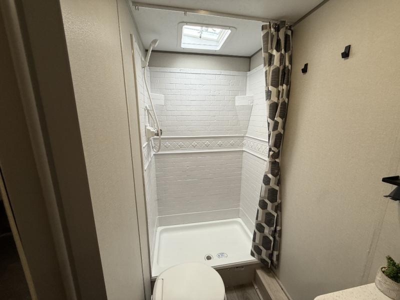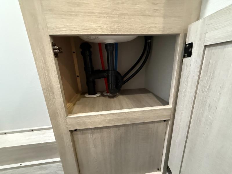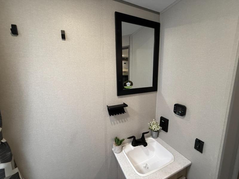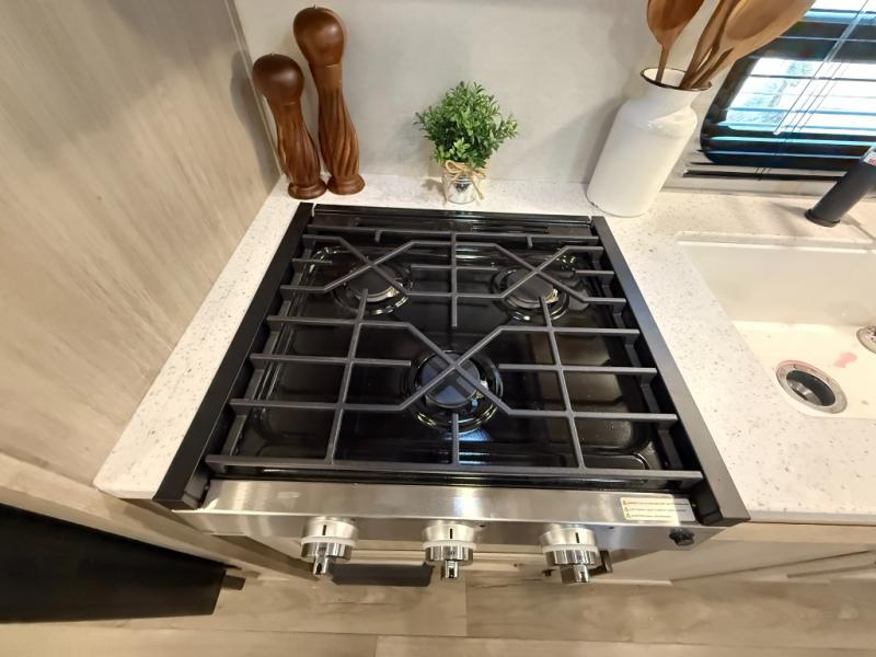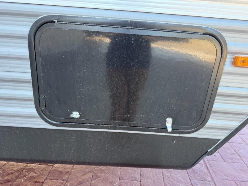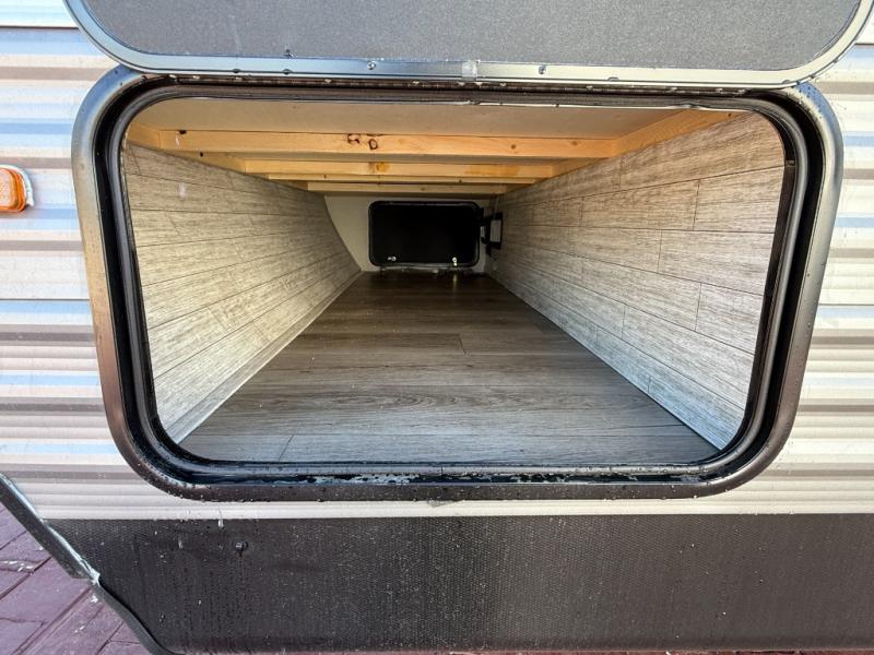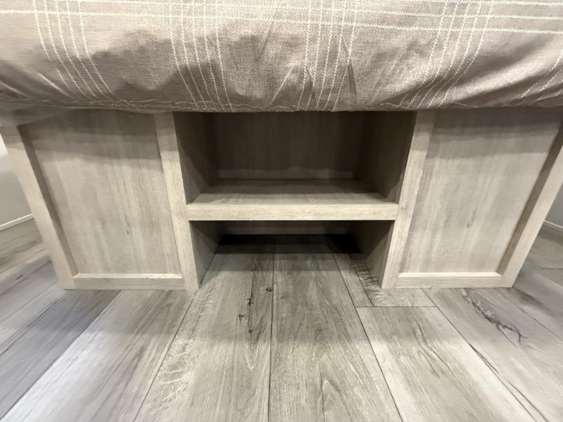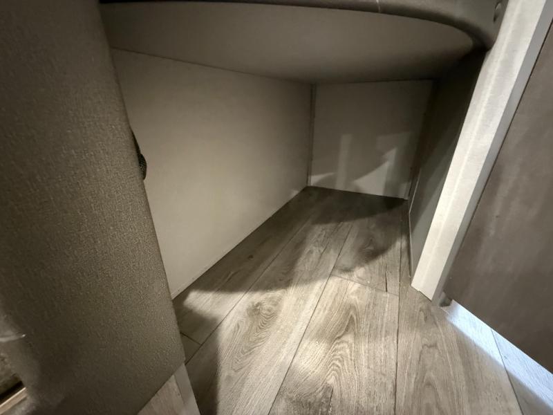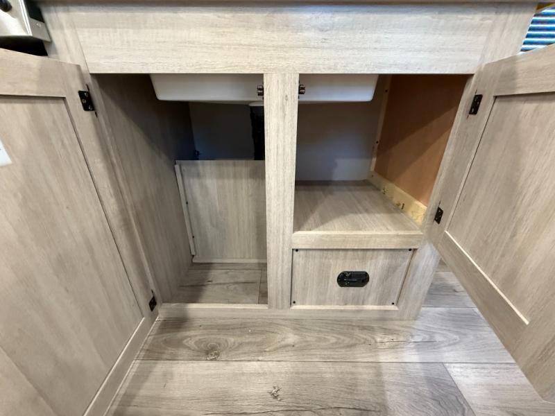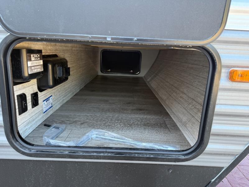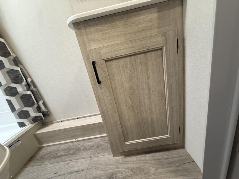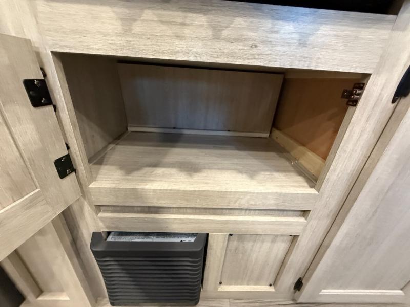 You'll love camping and spending time together in this travel trailer for seven! The bunk beds include under-bunk storage to keep bags out of the way, and the full bath is right next to the bunks for easy nighttime use. A semi-private bedroom up front includes a privacy curtain so you can get dressed each morning, and there are dual wardrobes to keep your things tidy. The chef of your group can whip up breakfast each morning on the three burner cooktop or in the GE stainless microwave, and there is a GE 10.7 cu. ft. 12V refrigerator to keep perishables fresh! A booth dinette provides a place to dine, or you can take your plate outdoors to sit under the 15' power awning with multicolored lights!