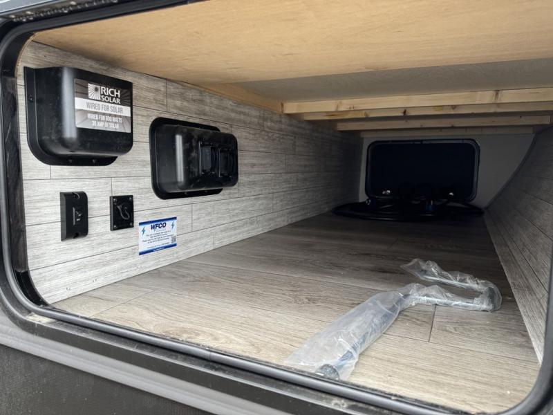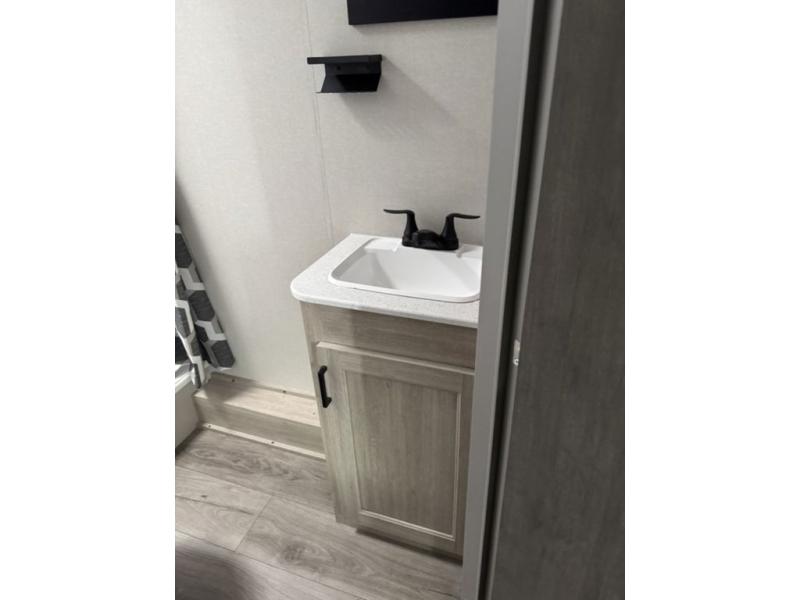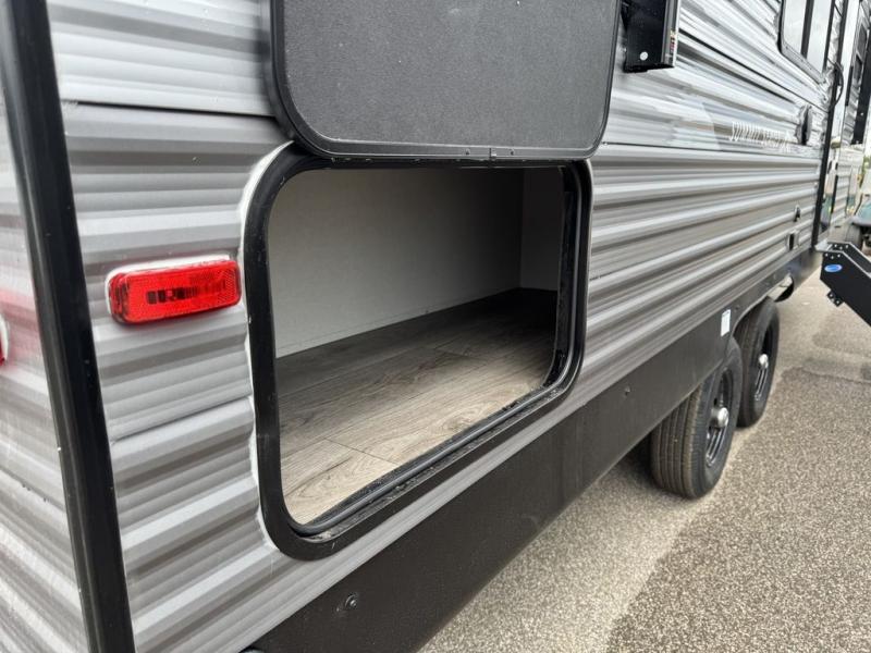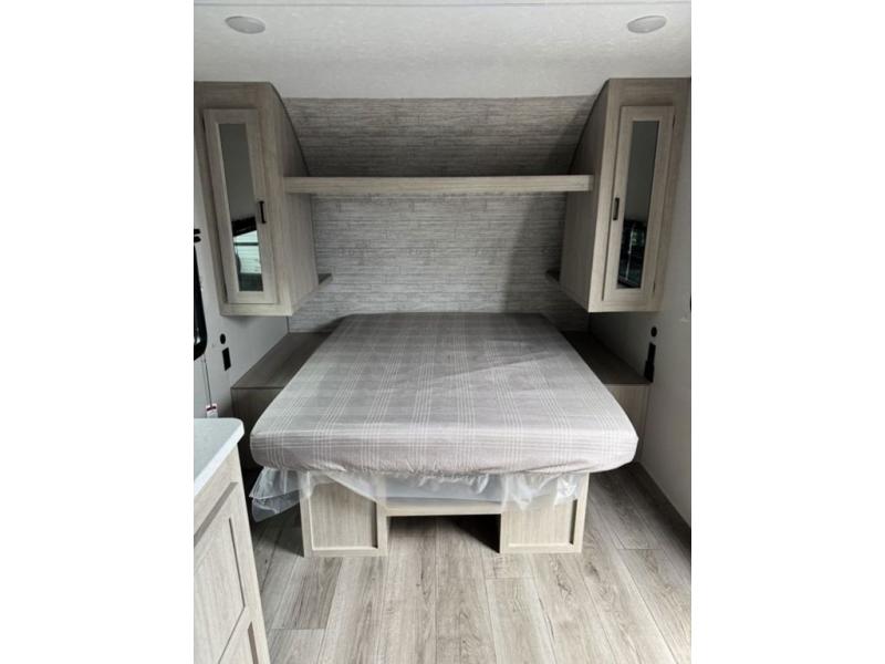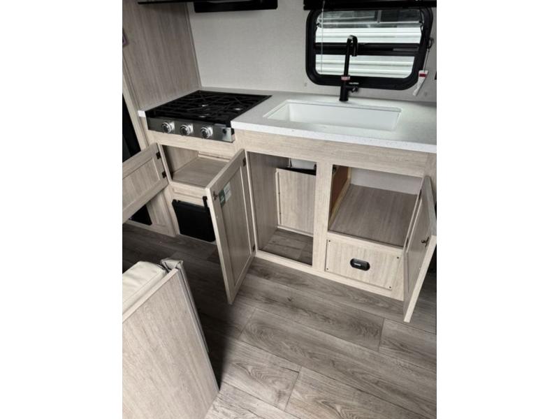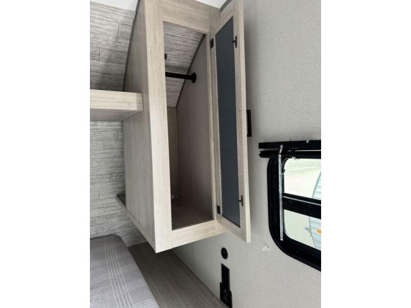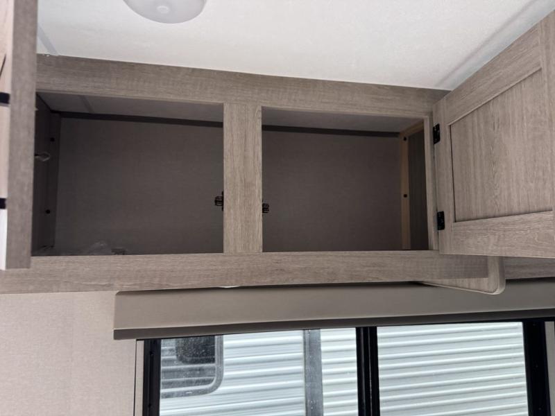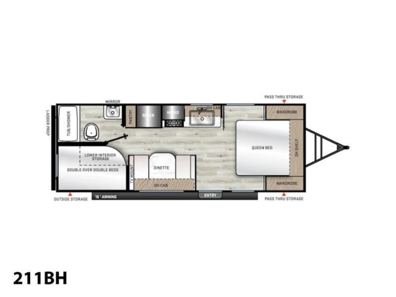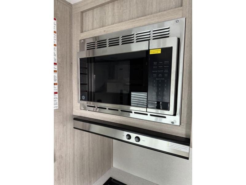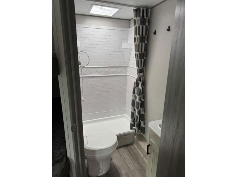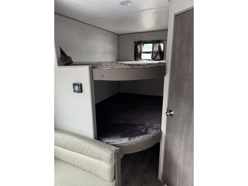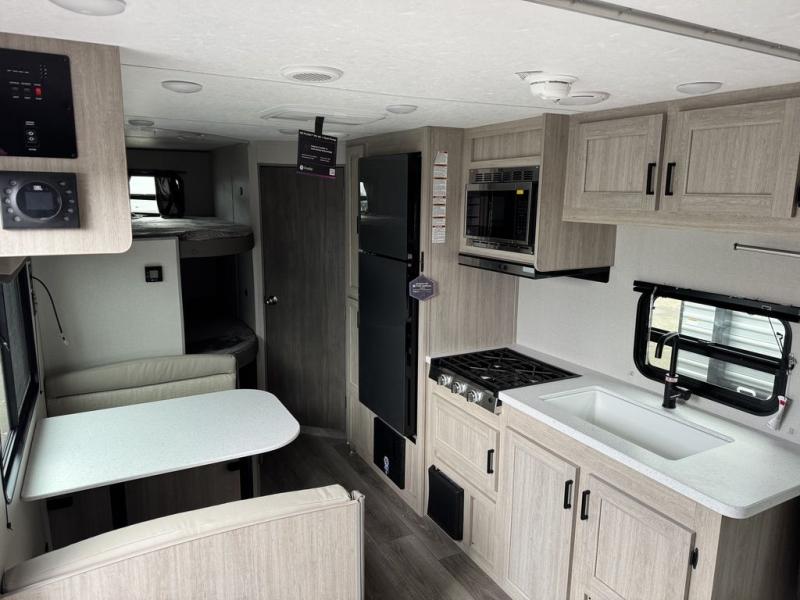 You'll love camping and spending time together in this travel trailer for seven! The bunk beds include under-bunk storage to keep bags out of the way, and the full bath is right next to the bunks for easy nighttime use. A semi-private bedroom up front includes a privacy curtain so you can get dressed each morning, and there are dual wardrobes to keep your things tidy. The chef of your group can whip up breakfast each morning on the three burner cooktop or in the GE stainless microwave, and there is a GE 10.7 cu. ft. 12V refrigerator to keep perishables fresh! A booth dinette provides a place to dine, or you can take your plate outdoors to sit under the 15' power awning with multicolored lights!