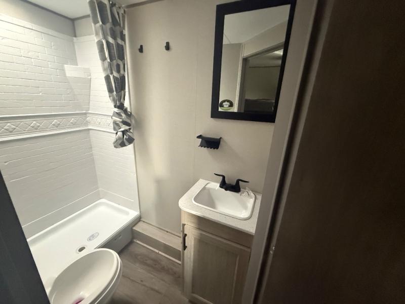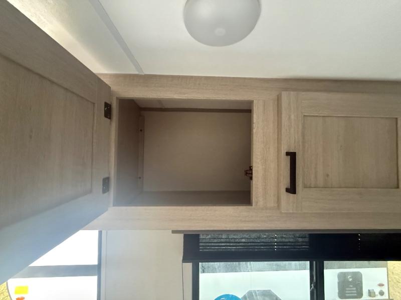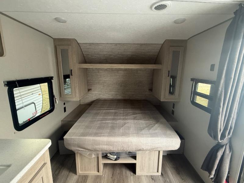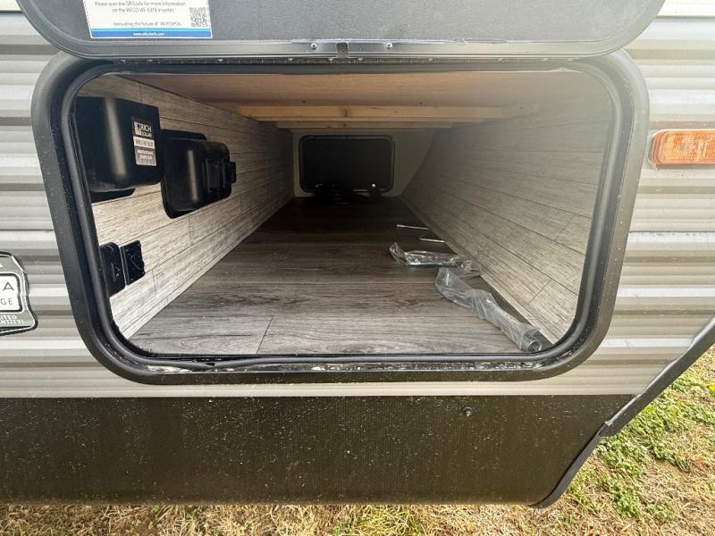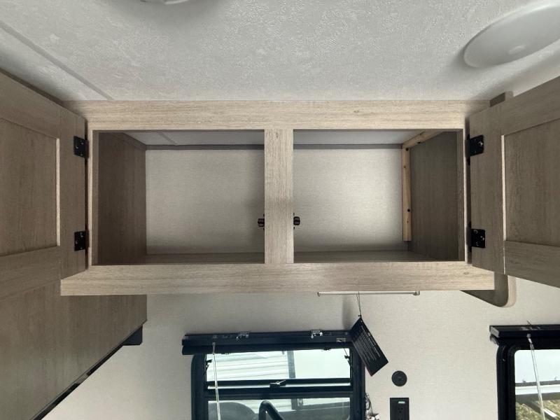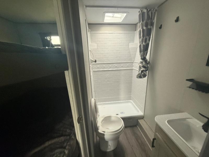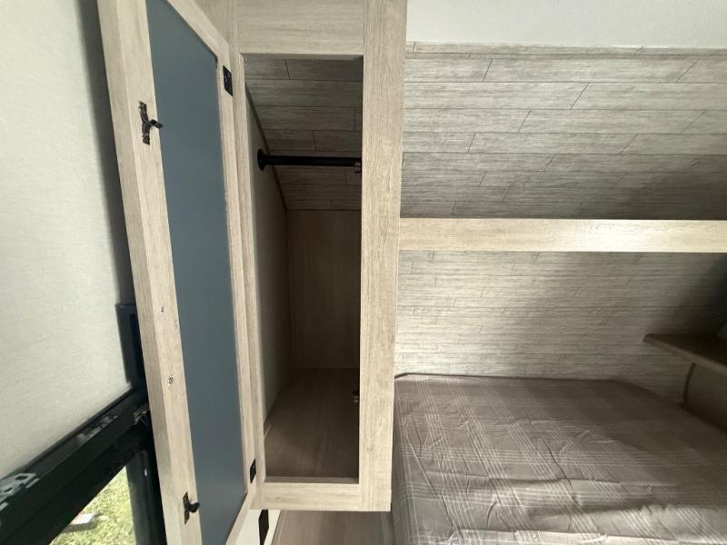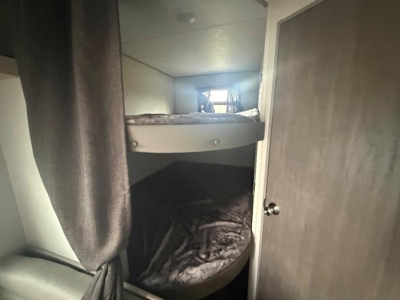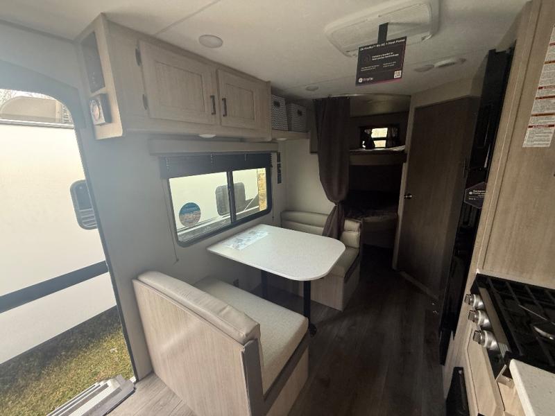 You'll love camping and spending time together in this travel trailer for seven! The bunk beds include under-bunk storage to keep bags out of the way, and the full bath is right next to the bunks for easy nighttime use. A semi-private bedroom up front includes a privacy curtain so you can get dressed each morning, and there are dual wardrobes to keep your things tidy. The chef of your group can whip up breakfast each morning on the three burner cooktop or in the GE stainless microwave, and there is a GE 10.7 cu. ft. 12V refrigerator to keep perishables fresh! A booth dinette provides a place to dine, or you can take your plate outdoors to sit under the 15' power awning with multicolored lights!