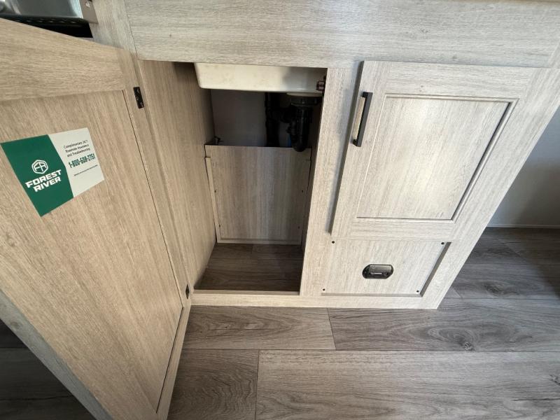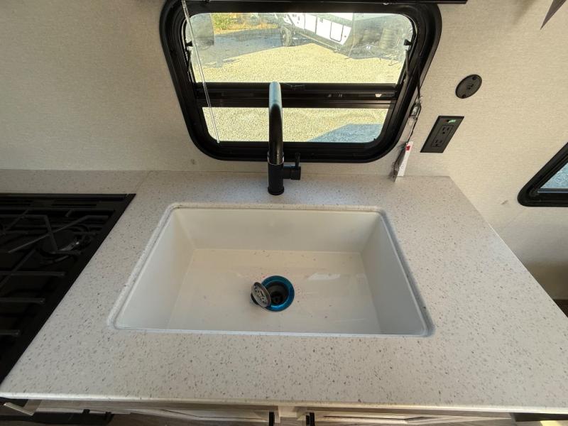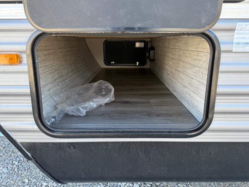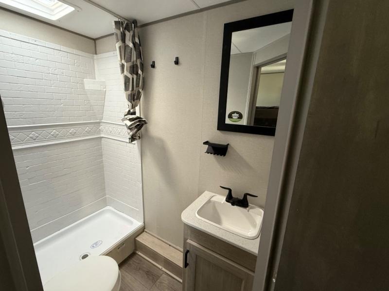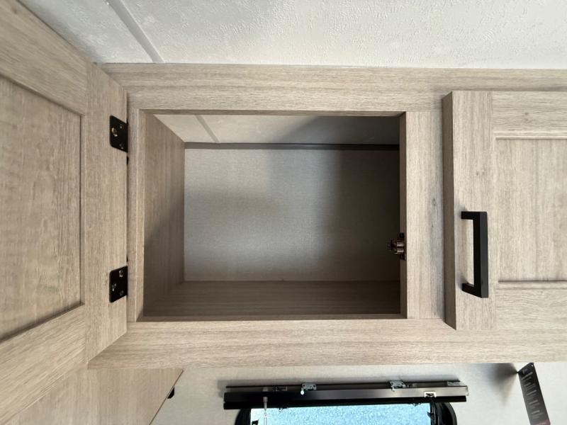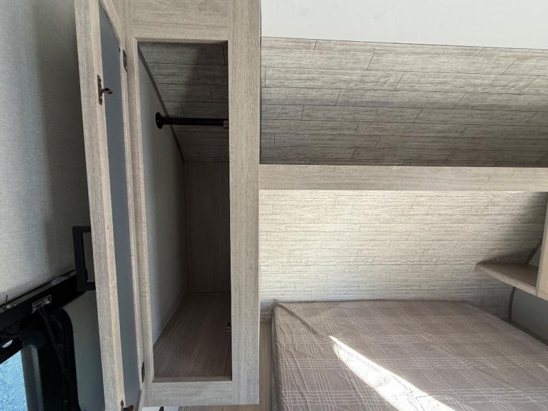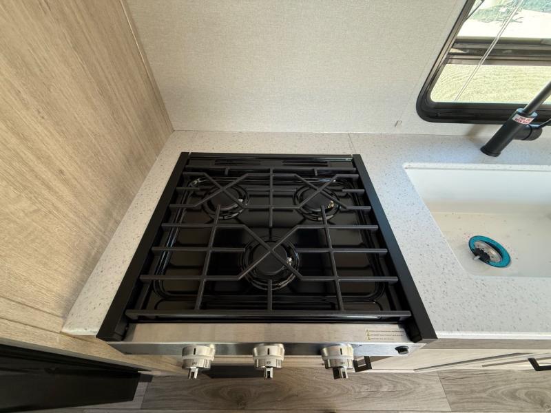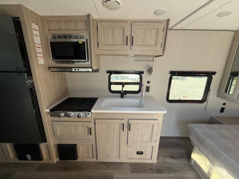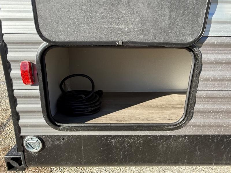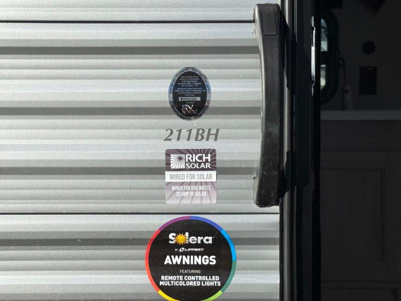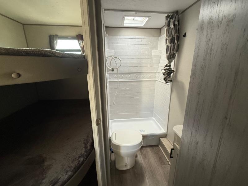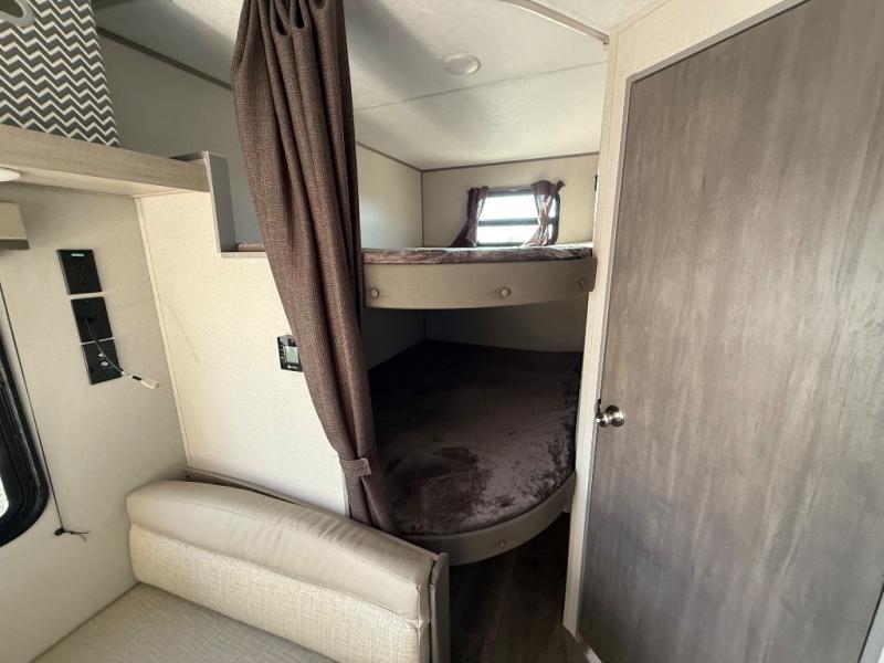 You'll love camping and spending time together in this travel trailer for seven! The bunk beds include under-bunk storage to keep bags out of the way, and the full bath is right next to the bunks for easy nighttime use. A semi-private bedroom up front includes a privacy curtain so you can get dressed each morning, and there are dual wardrobes to keep your things tidy. The chef of your group can whip up breakfast each morning on the three burner cooktop or in the GE stainless microwave, and there is a GE 10.7 cu. ft. 12V refrigerator to keep perishables fresh! A booth dinette provides a place to dine, or you can take your plate outdoors to sit under the 15' power awning with multicolored lights!