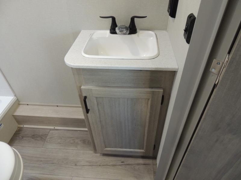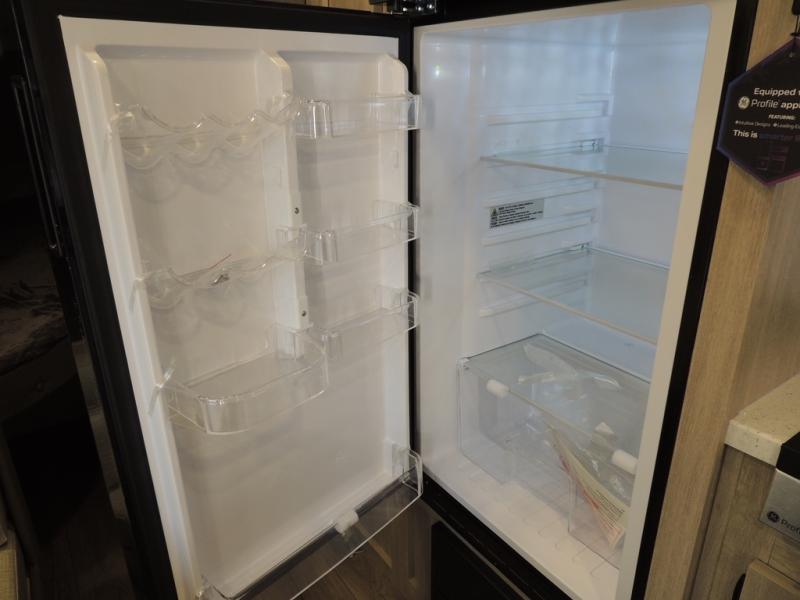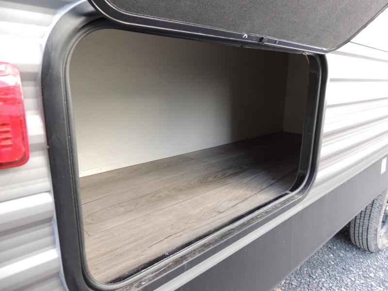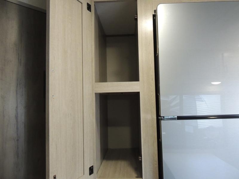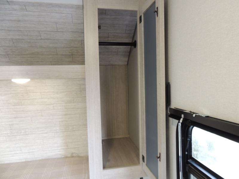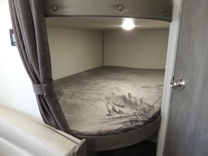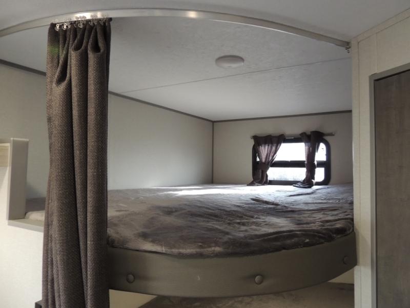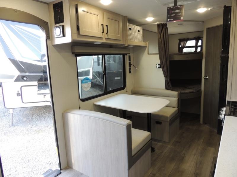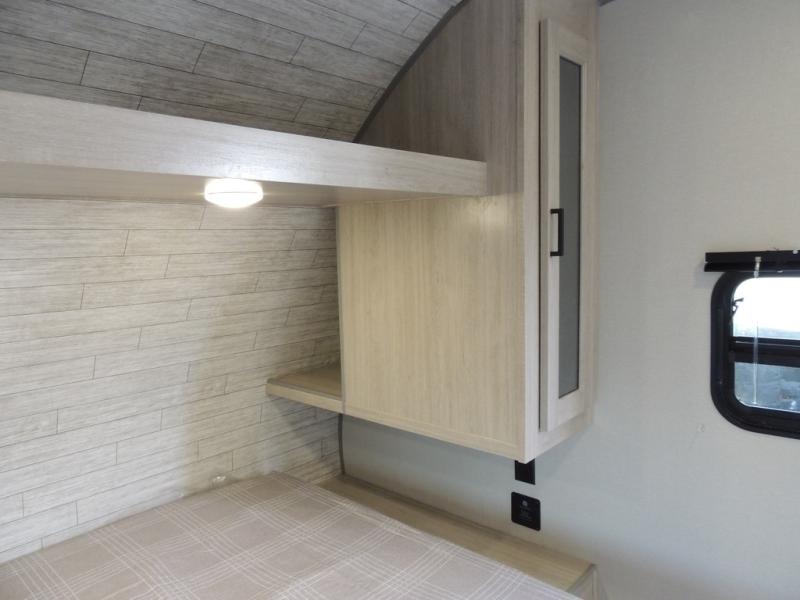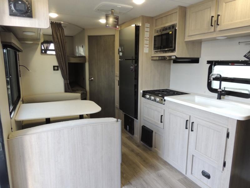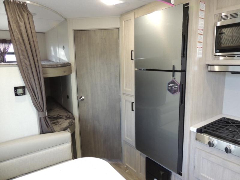 You'll love camping and spending time together in this travel trailer for seven! The bunk beds include under-bunk storage to keep bags out of the way, and the full bath is right next to the bunks for easy nighttime use. A semi-private bedroom up front includes a privacy curtain so you can get dressed each morning, and there are dual wardrobes to keep your things tidy. The chef of your group can whip up breakfast each morning on the three burner cooktop or in the GE stainless microwave, and there is a GE 10.7 cu. ft. 12V refrigerator to keep perishables fresh! A booth dinette provides a place to dine, or you can take your plate outdoors to sit under the 15' power awning with multicolored lights!