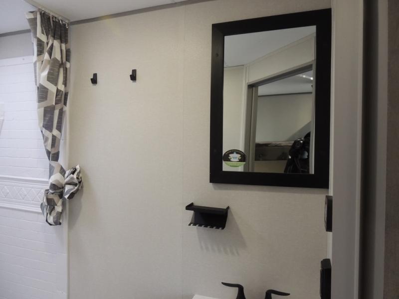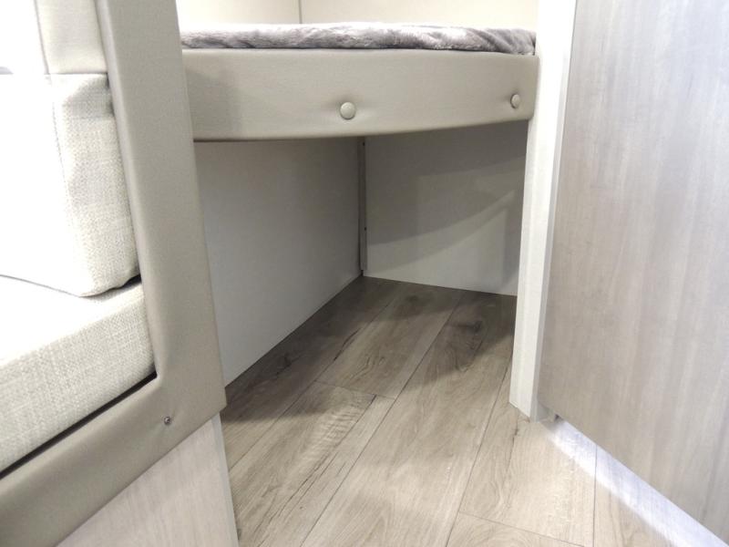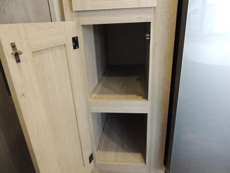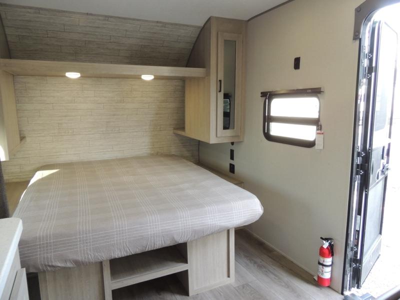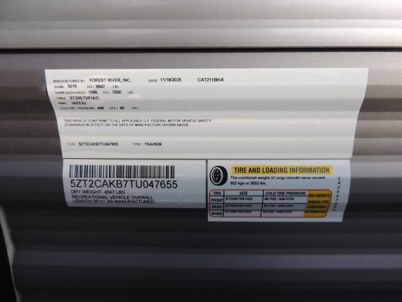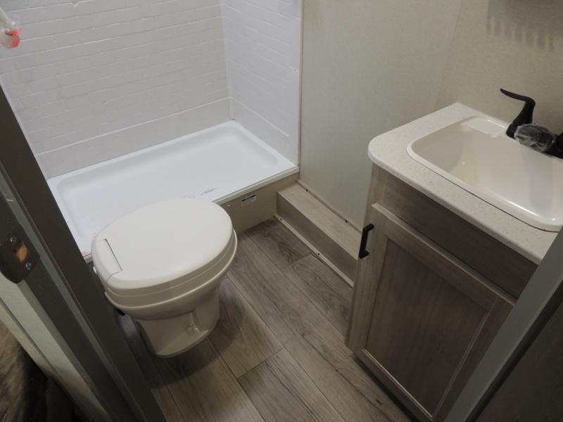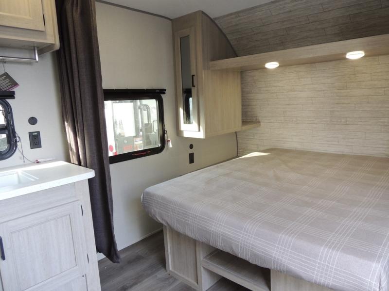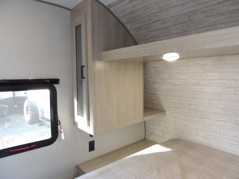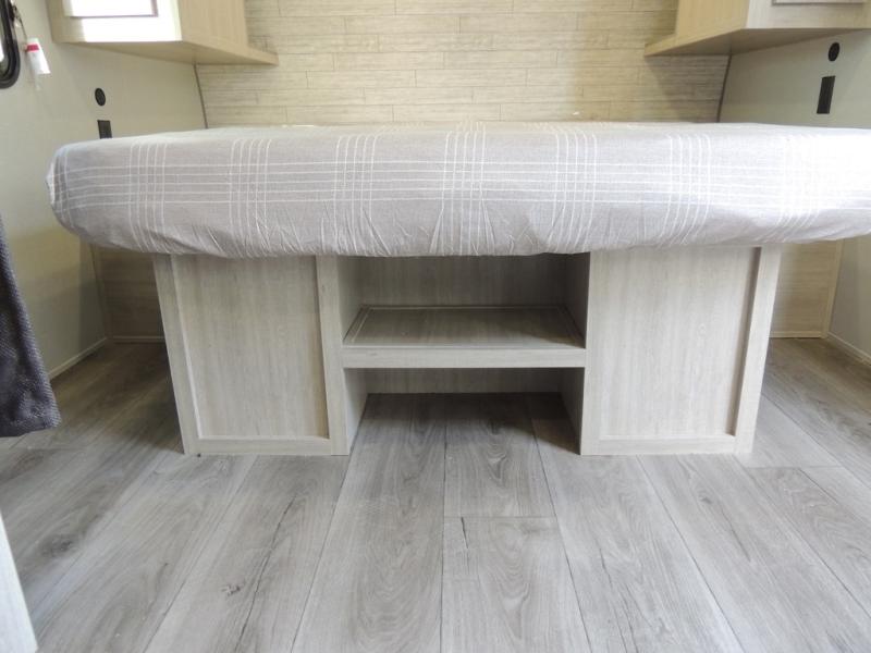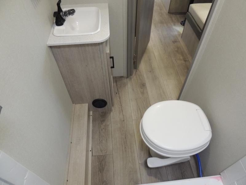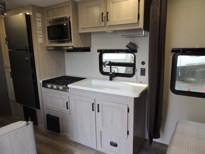 You'll love camping and spending time together in this travel trailer for seven! The bunk beds include under-bunk storage to keep bags out of the way, and the full bath is right next to the bunks for easy nighttime use. A semi-private bedroom up front includes a privacy curtain so you can get dressed each morning, and there are dual wardrobes to keep your things tidy. The chef of your group can whip up breakfast each morning on the three burner cooktop or in the GE stainless microwave, and there is a GE 10.7 cu. ft. 12V refrigerator to keep perishables fresh! A booth dinette provides a place to dine, or you can take your plate outdoors to sit under the 15' power awning with multicolored lights!