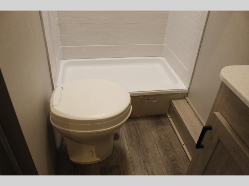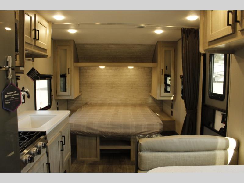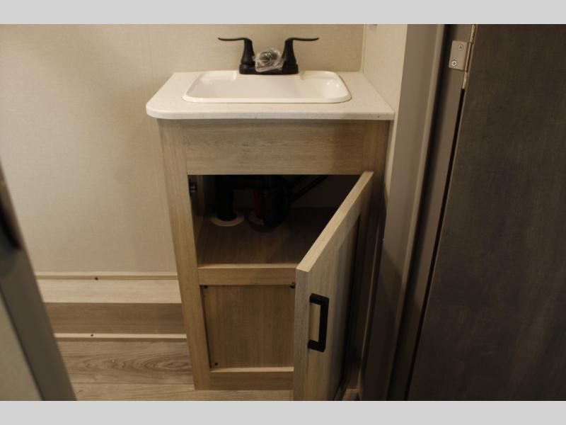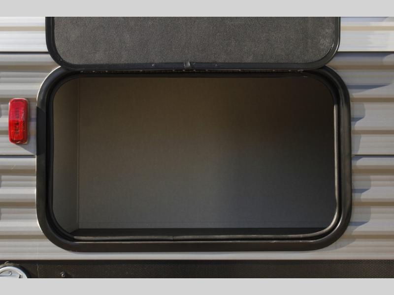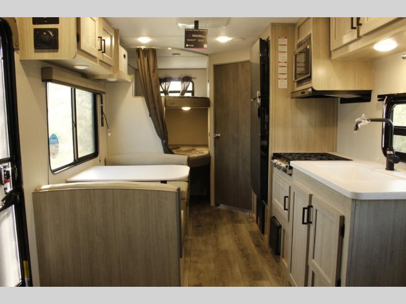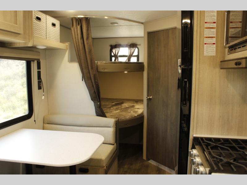 You'll love camping and spending time together in this travel trailer for seven! The bunk beds include under-bunk storage to keep bags out of the way, and the full bath is right next to the bunks for easy nighttime use. A semi-private bedroom up front includes a privacy curtain so you can get dressed each morning, and there are dual wardrobes to keep your things tidy. The chef of your group can whip up breakfast each morning on the three burner cooktop or in the GE stainless microwave, and there is a GE 10.7 cu. ft. 12V refrigerator to keep perishables fresh! A booth dinette provides a place to dine, or you can take your plate outdoors to sit under the 15' power awning with multicolored lights!