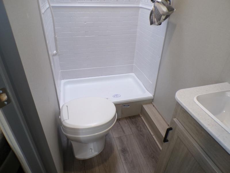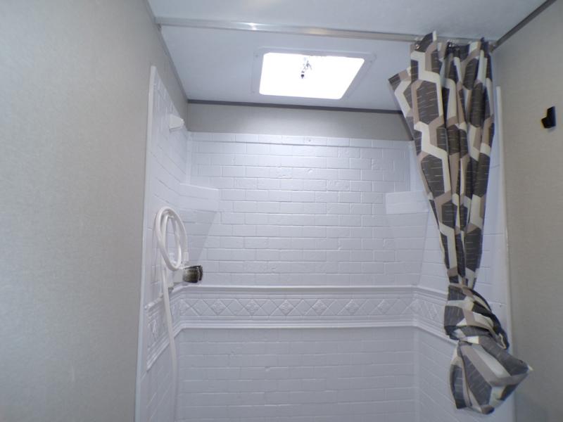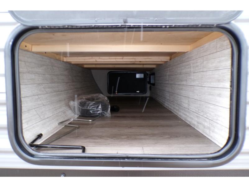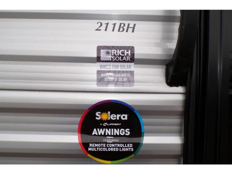 You'll love camping and spending time together in this travel trailer for seven! The bunk beds include under-bunk storage to keep bags out of the way, and the full bath is right next to the bunks for easy nighttime use. A semi-private bedroom up front includes a privacy curtain so you can get dressed each morning, and there are dual wardrobes to keep your things tidy. The chef of your group can whip up breakfast each morning on the three burner cooktop or in the GE stainless microwave, and there is a GE 10.7 cu. ft. 12V refrigerator to keep perishables fresh! A booth dinette provides a place to dine, or you can take your plate outdoors to sit under the 15' power awning with multicolored lights!