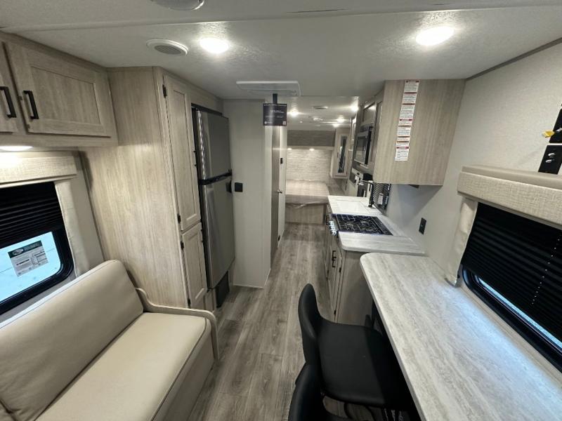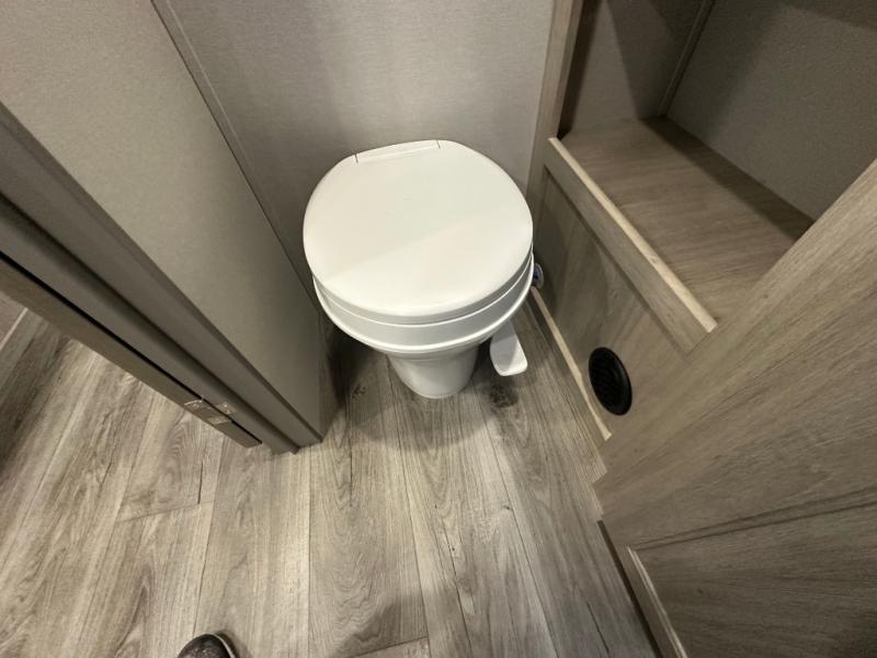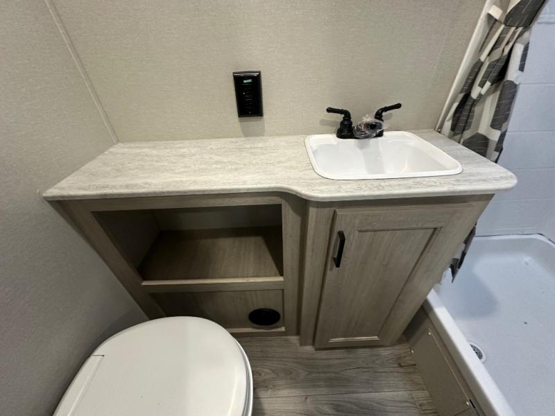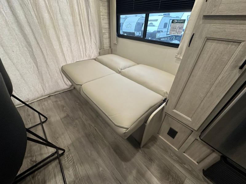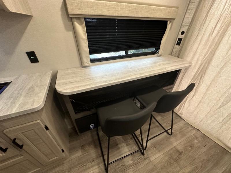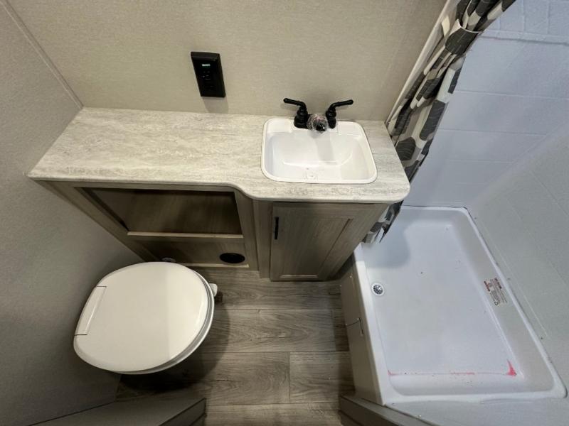 If you are looking for comfort this travel trailer is the one for you due to the amazing front bedroom. Have a relaxing time on the queen bed, which has dual bedside wardrobes and an overhead shelf perfect for storing all your belongings. Moving to the living room, you can take a rest on the 60" sofa jack knife or if you prefer, have a drink or two on the bar top for those hot days. Also for days where the temperature rises, take a refreshing bath in the full bathroom. Finally, this model has an optional 38" dinette, ideal to share your everyday meals with your loved ones.