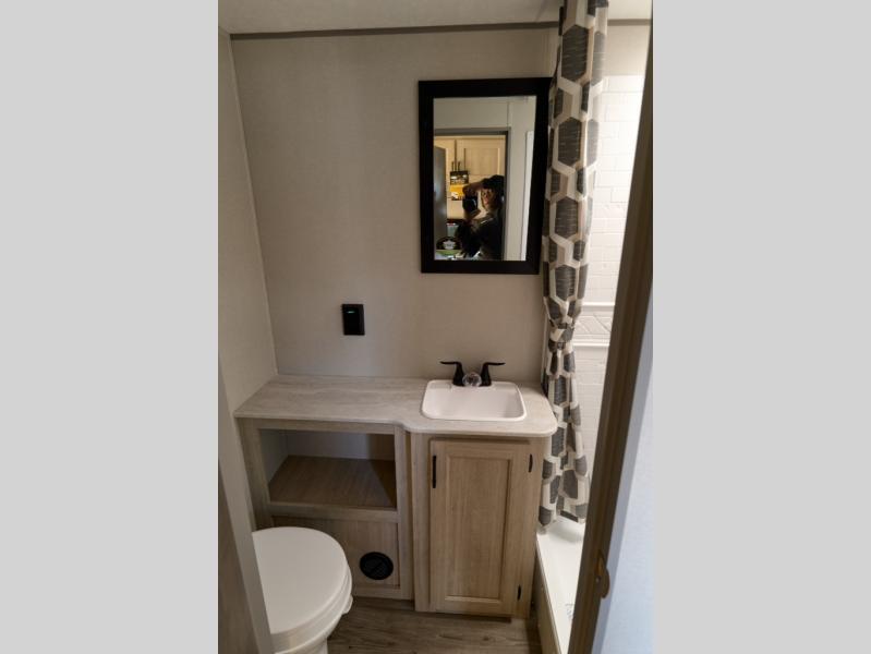If you are looking for comfort this travel trailer is the one for you due to the amazing front bedroom. Have a relaxing time on the queen bed, which has dual bedside wardrobes and an overhead shelf perfect for storing all your belongings. Moving to the living room, you can take a rest on the 60" sofa jack knife or if you prefer, have a drink or two on the bar top for those hot days. Also for days where the temperature rises, take a refreshing bath in the full bathroom. Finally, this model has an optional 38" dinette, ideal to share your everyday meals with your loved ones.
