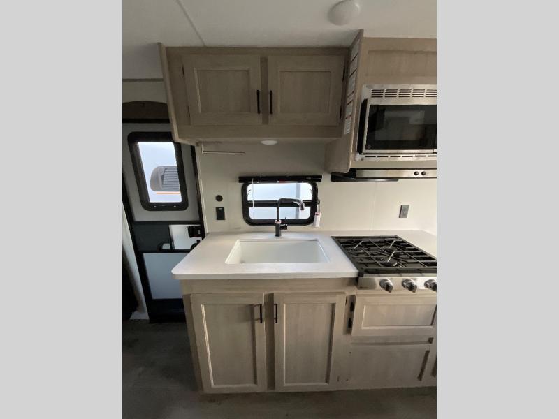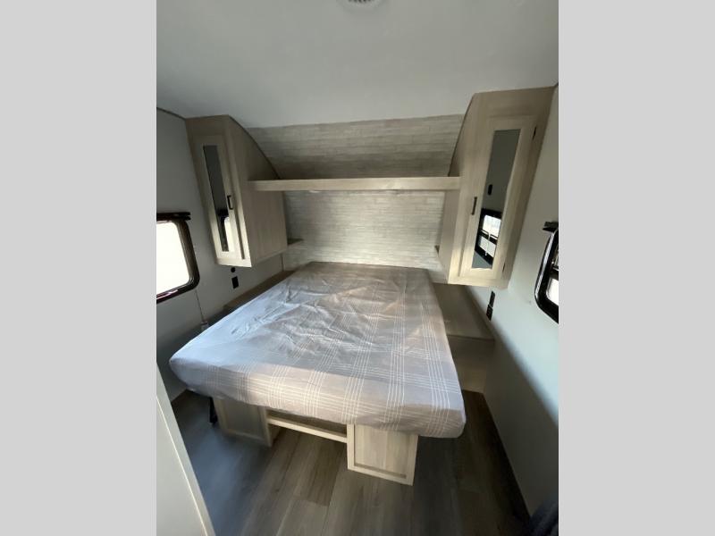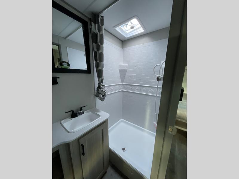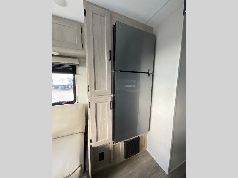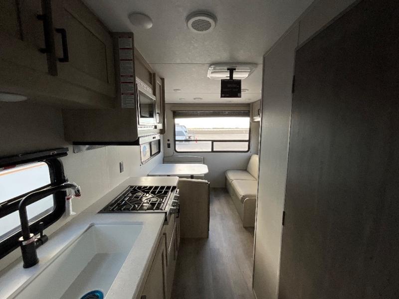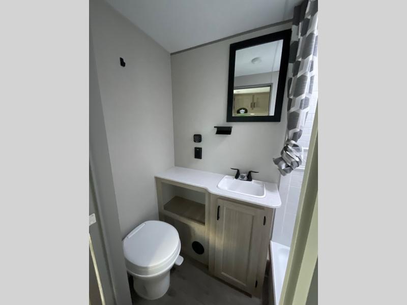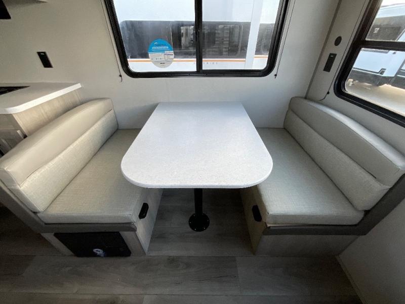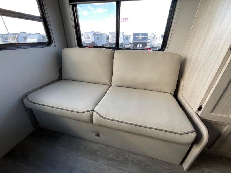 If you are looking for comfort this travel trailer is the one for you due to the amazing front bedroom. Have a relaxing time on the queen bed, which has dual bedside wardrobes and an overhead shelf perfect for storing all your belongings. Moving to the living room, you can take a rest on the 60" sofa jack knife or if you prefer, have a drink or two on the bar top for those hot days. Also, for days where the temperature rises, take a refreshing bath in the full bathroom. Finally, this model has an optional 38" dinette, ideal to share your everyday meals with your loved ones.