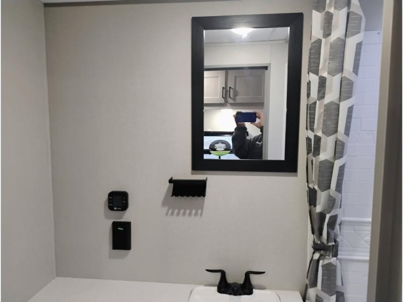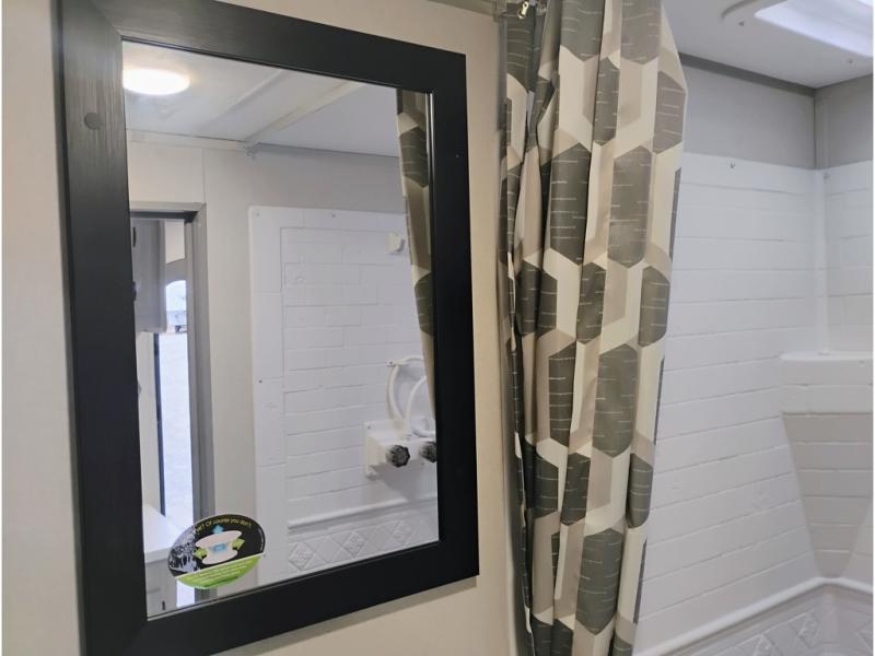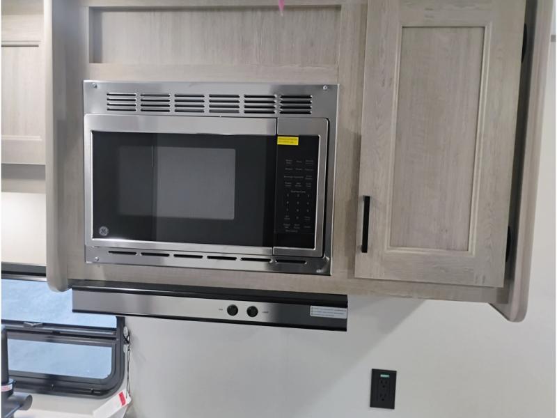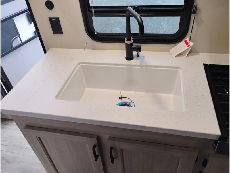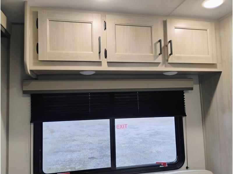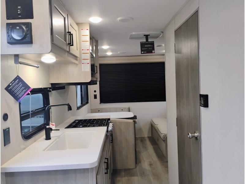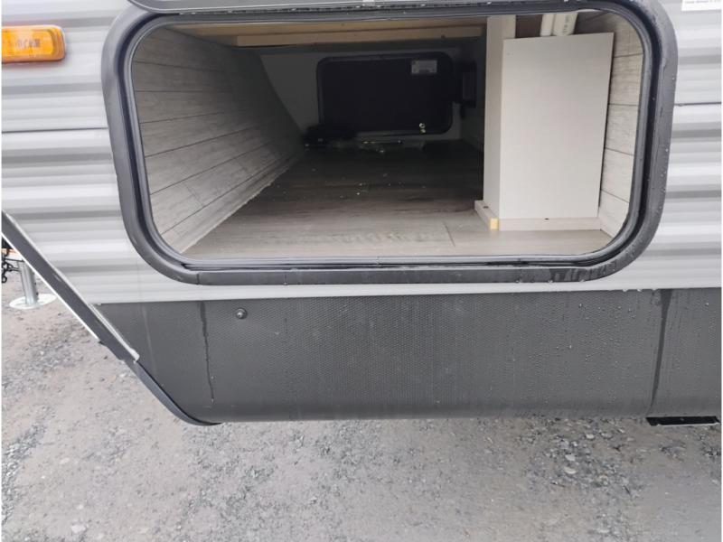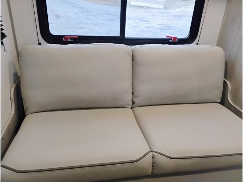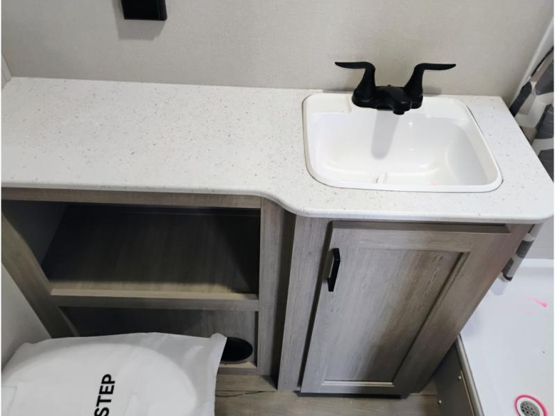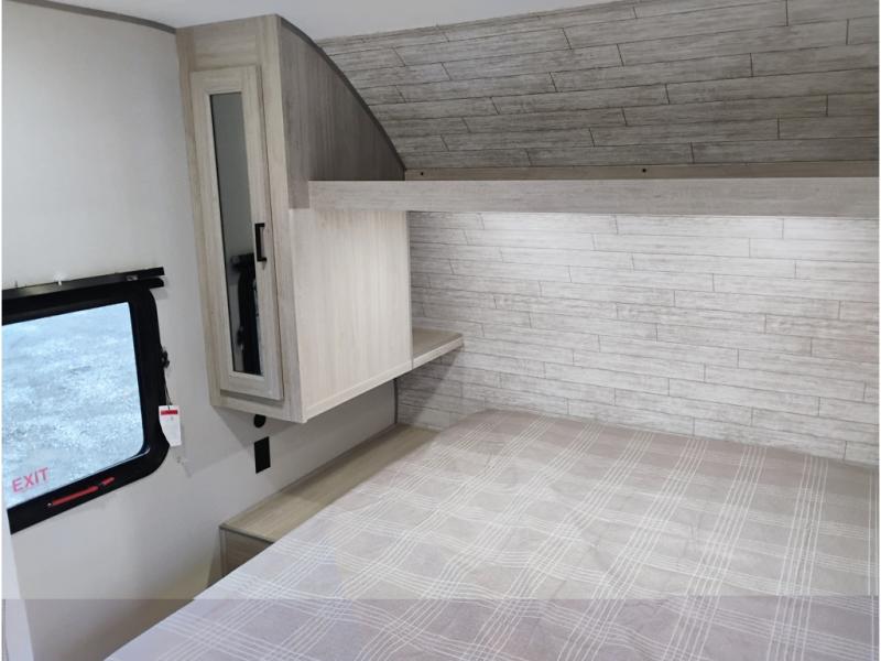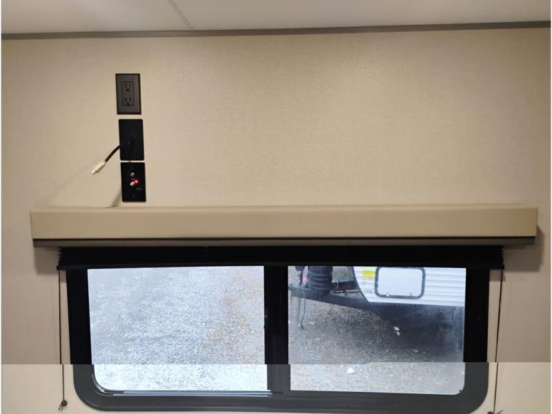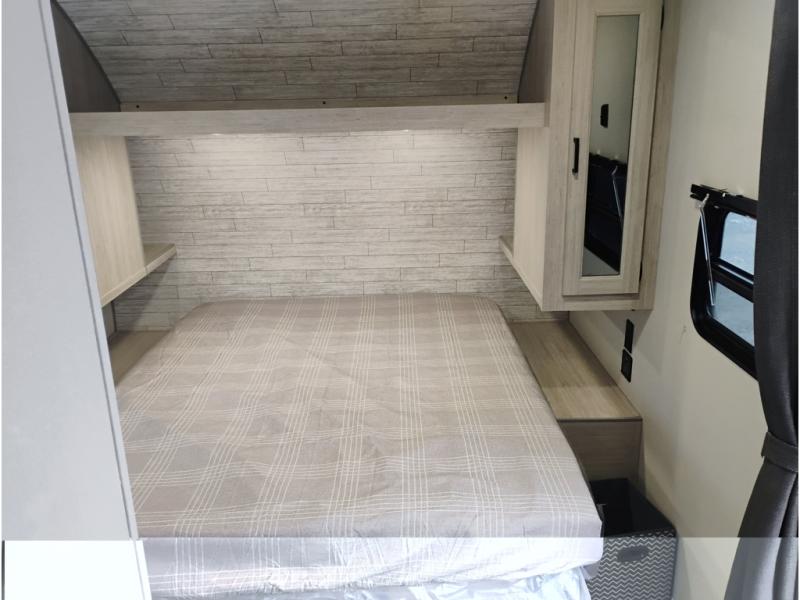 If you are looking for comfort this travel trailer is the one for you due to the amazing front bedroom. Have a relaxing time on the queen bed, which has dual bedside wardrobes and an overhead shelf perfect for storing all your belongings. Moving to the living room, you can take a rest on the 60" sofa jack knife, and you can enjoy your favorite snack or meal at the booth dinette. Also, for days where the temperature rises, take a refreshing bath in the full bathroom. Finally, this model has an optional bar top, ideal to have a refreshing drink for those hot days.