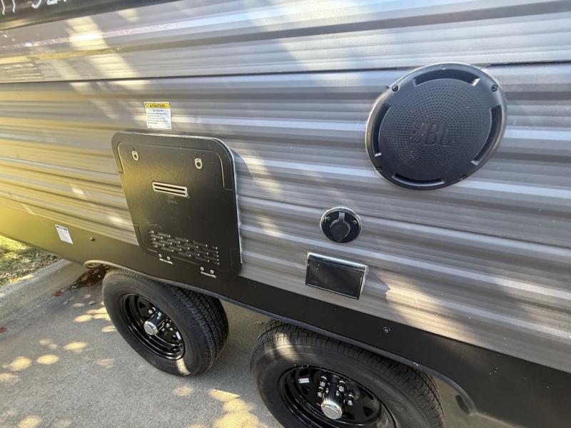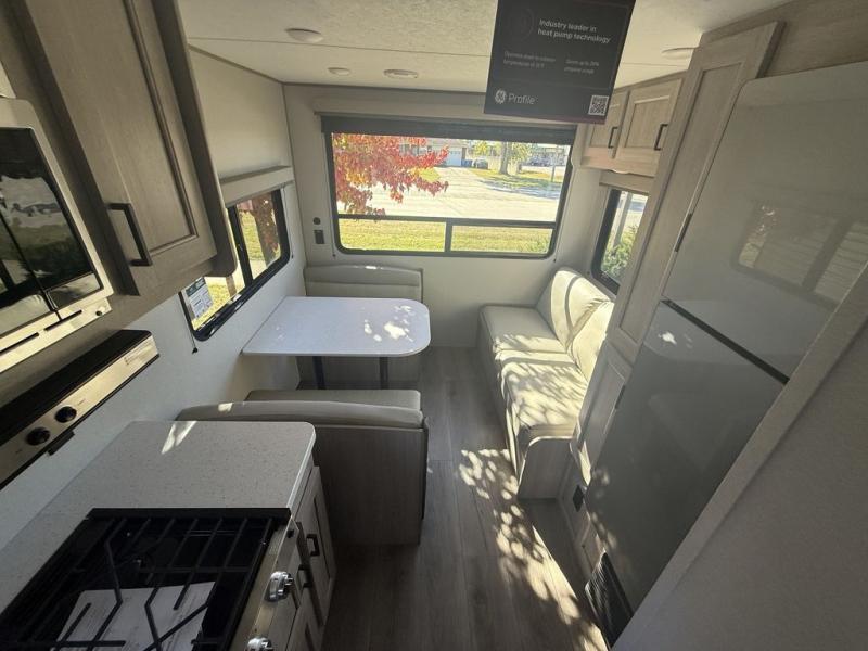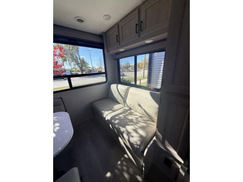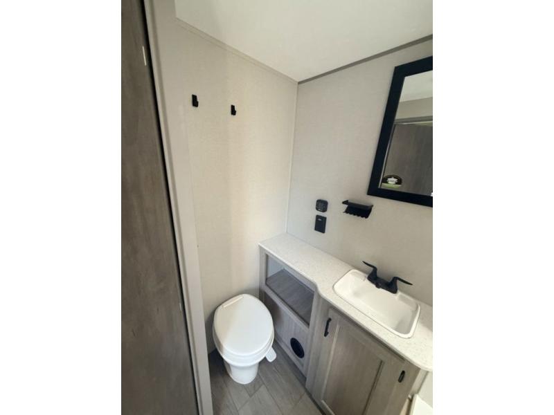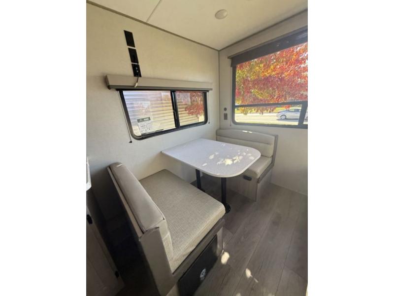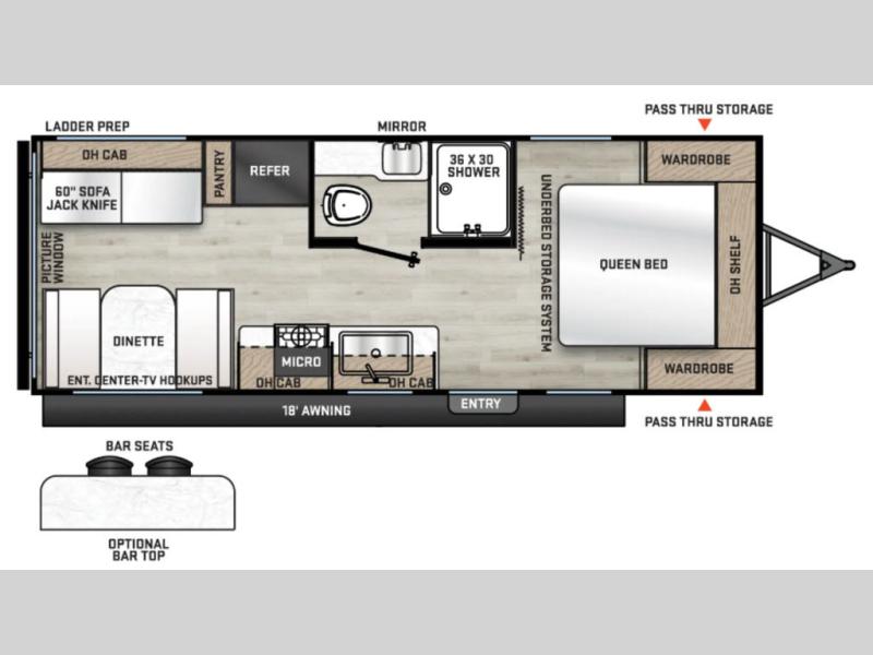 If you are looking for comfort this travel trailer is the one for you due to the amazing front bedroom. Have a relaxing time on the queen bed, which has dual bedside wardrobes and an overhead shelf perfect for storing all your belongings. Moving to the living room, you can take a rest on the 60" sofa jack knife, and you can enjoy your favorite snack or meal at the booth dinette. Also, for days where the temperature rises, take a refreshing bath in the full bathroom. Finally, this model has an optional bar top, ideal to have a refreshing drink for those hot days.