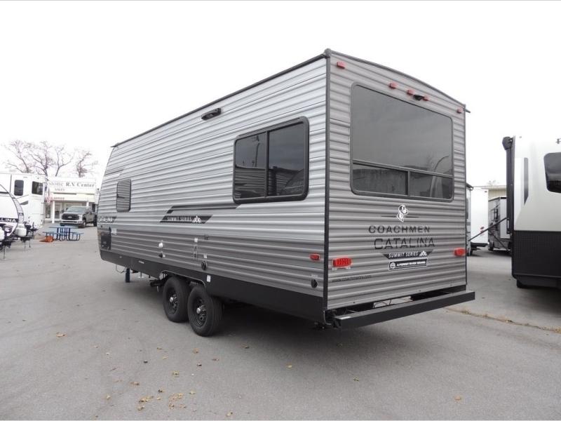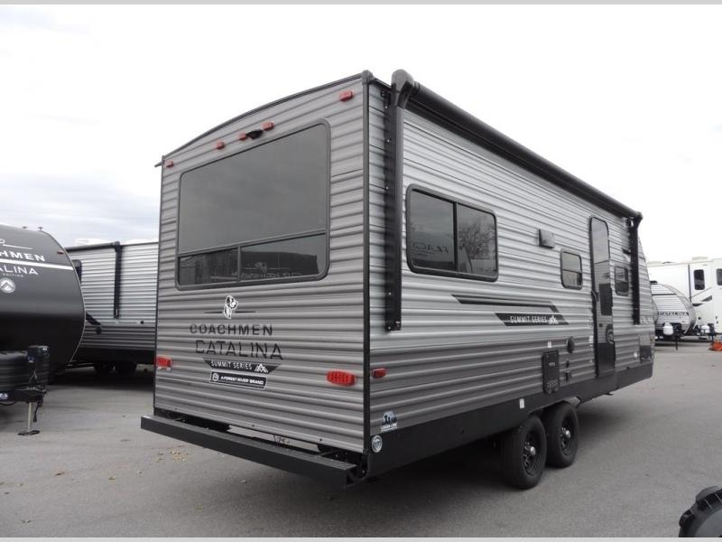 With any Catalina Summit Series 8 by Coachmen, you will enjoy an affordable travel trailer packed with at-home comforts! The solid construction includes a Norco electromagnetic powder coated chassis, a seamless Alpha roof membrane, and full length frame outriggers for maximum support and durability. EZ lube axles with leaf spring suspension and self-adjusting brakes provide smooth towing from home to campground, and the premium exterior graphics package is sure to turn heads as you travel down the highway. You will love the features included, such as a JBL Aura Cube media center, magnetic baggage door latches, 4,000 lumen interior touch lighting, and the list goes on!