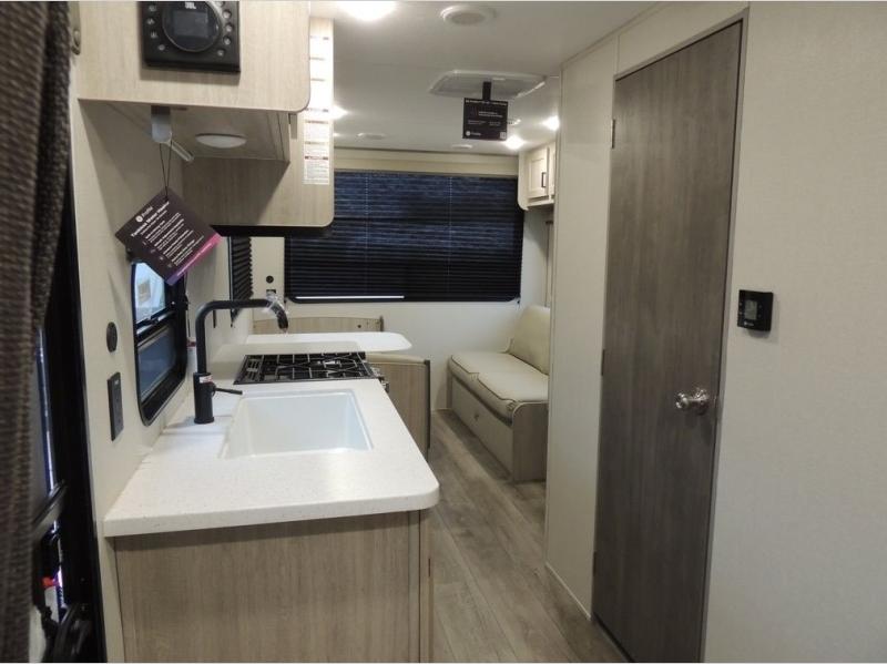 If you are looking for comfort this travel trailer is the one for you due to the amazing front bedroom. Have a relaxing time on the queen bed, which has dual bedside wardrobes and an overhead shelf perfect for storing all your belongings. Moving to the living room, you can take a rest on the 60" sofa jack knife, and you can enjoy your favorite snack or meal at the booth dinette. Also, for days where the temperature rises, take a refreshing bath in the full bathroom. Finally, this model has an optional bar top, ideal to have a refreshing drink for those hot days.