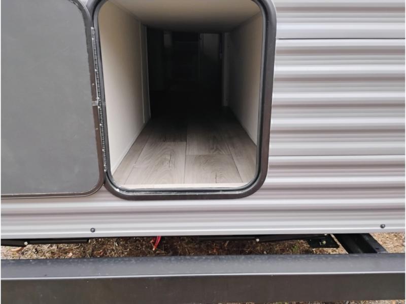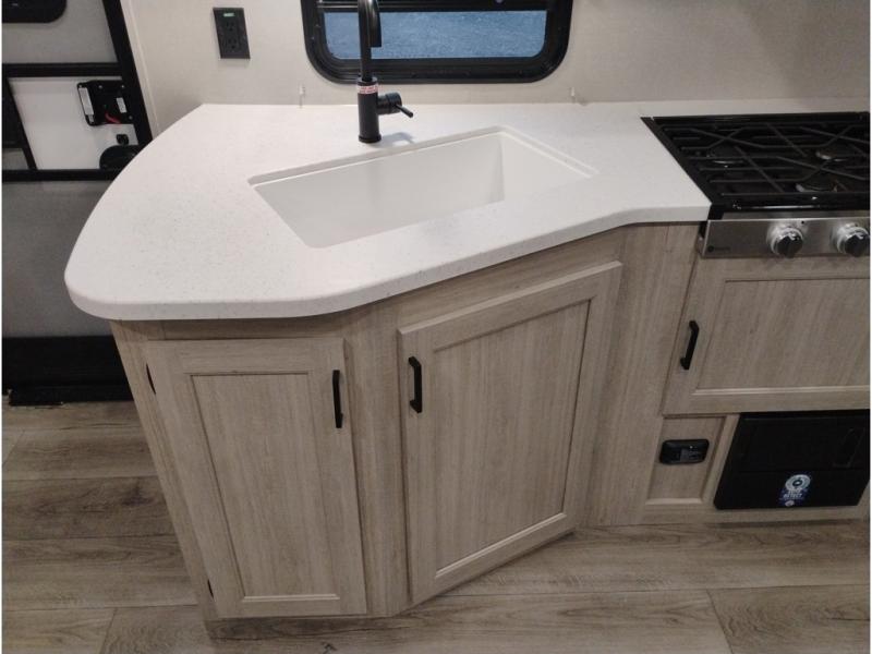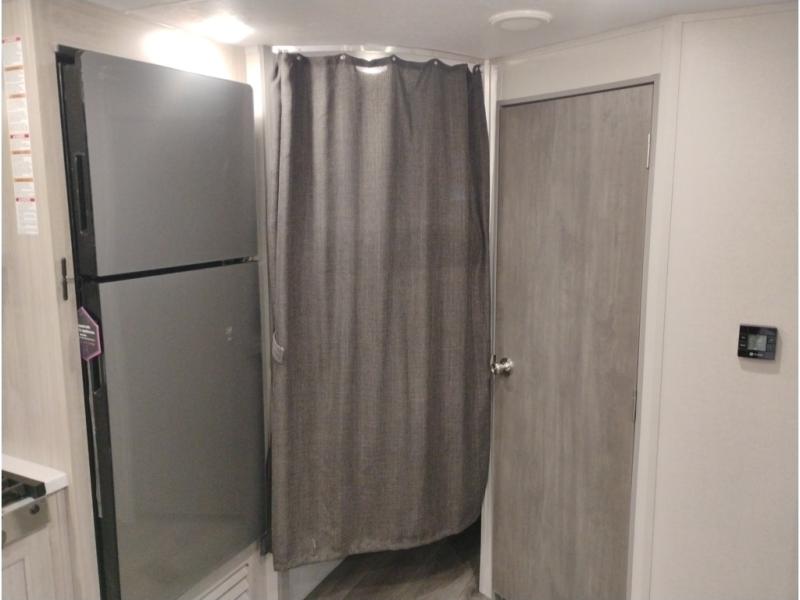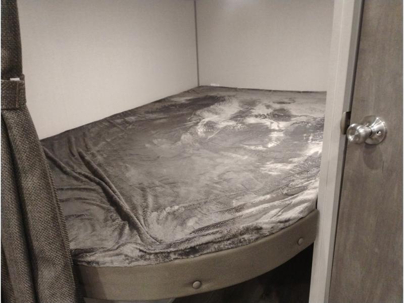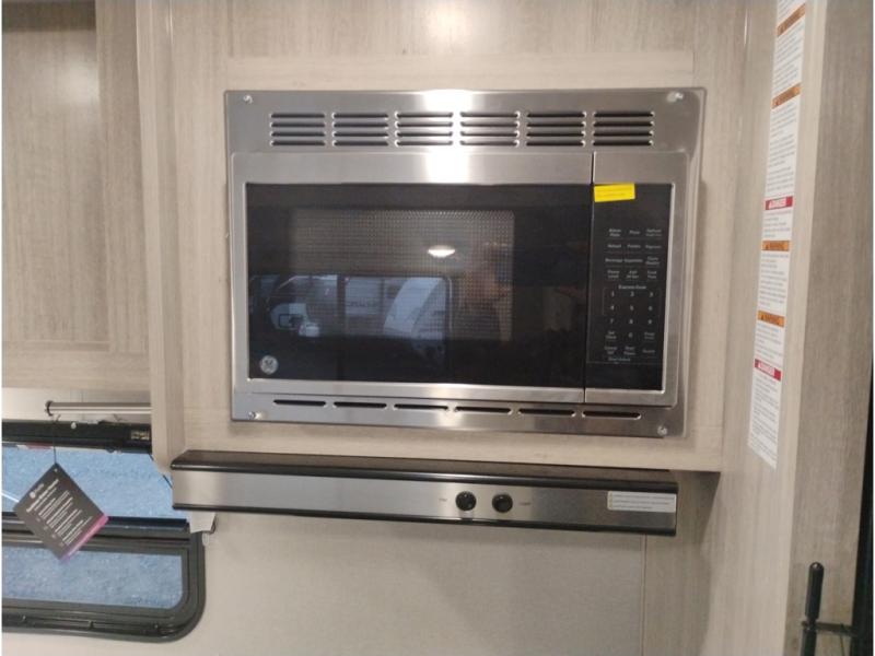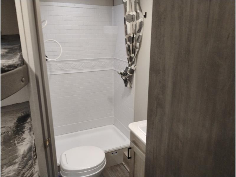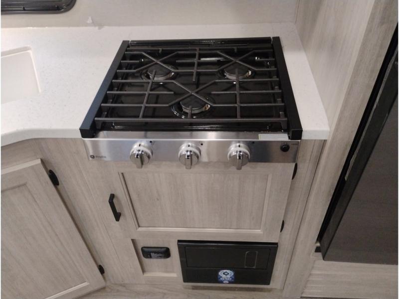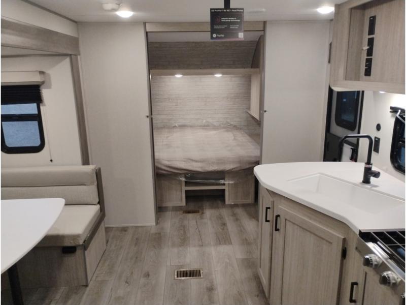 This is the perfect mid-size travel trailer for you and your family! The double-size bunks offer a comfortable sleeping space for the kids and you will have your own private sleeping space with a queen bed in the front bedroom. Freshen up each day in the rear corner bathroom with the tub/shower and a mirror to get ready each morning. You can prepare your best home cooked meals with the GE stainless three burner cooktop and GE stainless 10.7 cu. ft. 12V refrigerator, then enjoy them together at the u-shaped dinette. There is also a large pantry to store all your goods. Don't leave any of your outdoor gear behind either, thanks to the front pass-through storage area and the exterior outside storage area. You could even add the optional outside camper kitchen to grill the catch of the day on the pull out griddle!