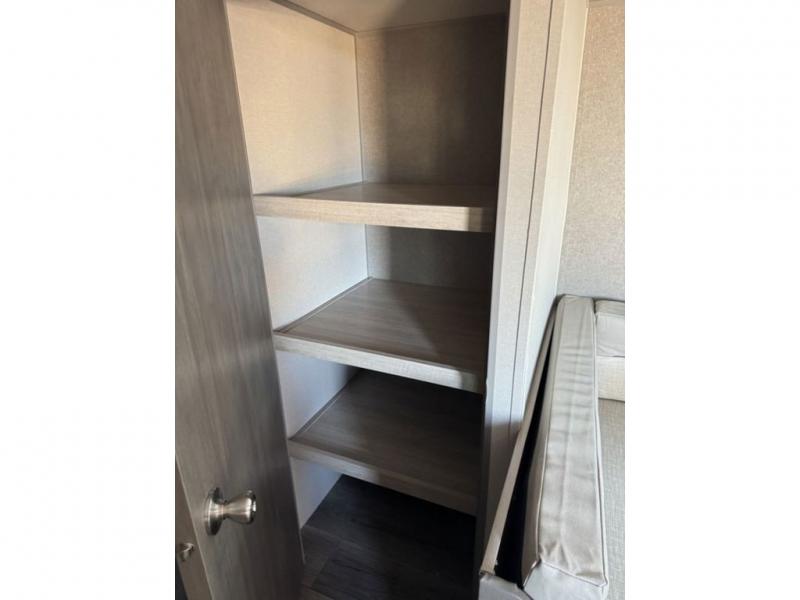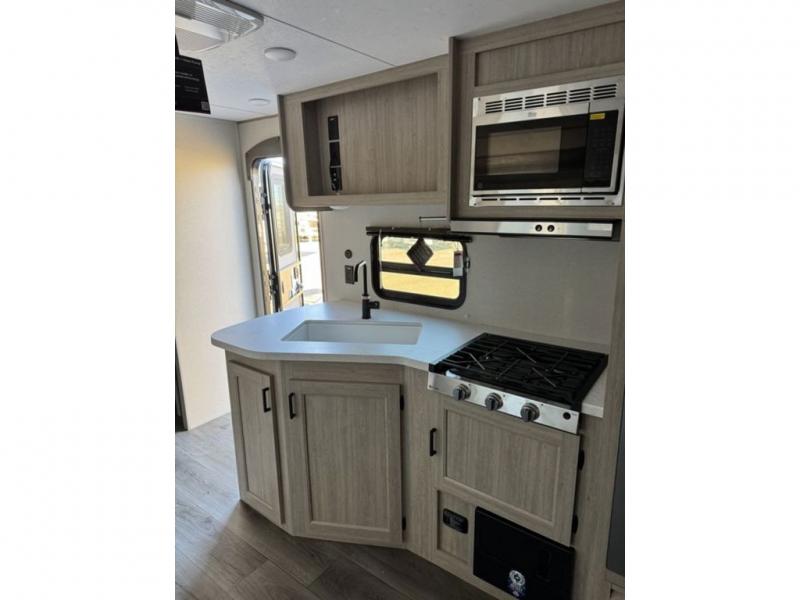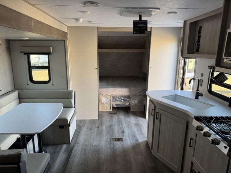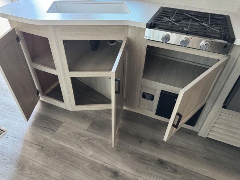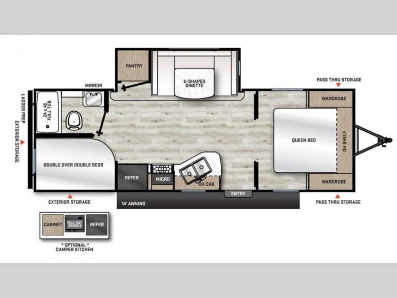 This is the perfect mid-size travel trailer for you and your family! The double-size bunks offer a comfortable sleeping space for the kids and you will have your own private sleeping space with a queen bed in the front bedroom. Freshen up each day in the rear corner bathroom with the tub/shower and a mirror to get ready each morning. You can prepare your best home cooked meals with the GE stainless three burner cooktop and GE stainless 10.7 cu. ft. 12V refrigerator, then enjoy them together at the u-shaped dinette. There is also a large pantry to store all your goods. Don't leave any of your outdoor gear behind either, thanks to the front pass-through storage area and the exterior outside storage area. You could even add the optional outside camper kitchen to grill the catch of the day on the pull out griddle!