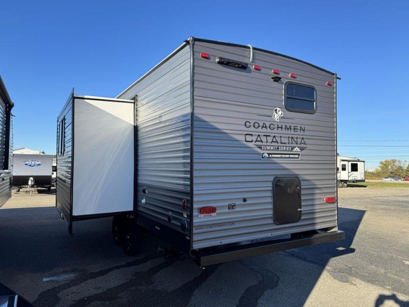 With any Catalina Summit Series 8 by Coachmen you will enjoy an affordable travel trailer packed with at-home comforts! The solid construction includes a Norco electromagnetic powder coated chassis, a seamless Alpha roof membrane, and full length frame outriggers for maximum support and durability. EZ lube axles with leaf spring suspension and self-adjusting brakes provide smooth towing from home to campground, and the premium exterior graphics package is sure to turn heads as you travel down the highway. You will love the features included, such as a JBL Aura Cube media center, magnetic baggage door latches, 4,000 lumen interior touch lighting, and the list goes on!