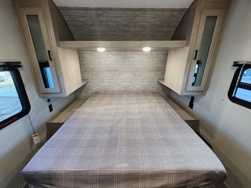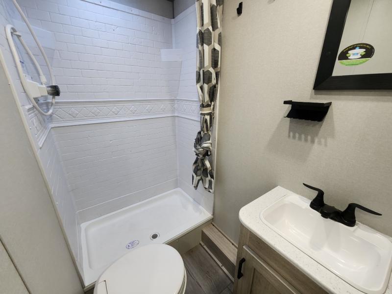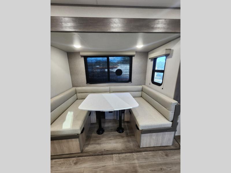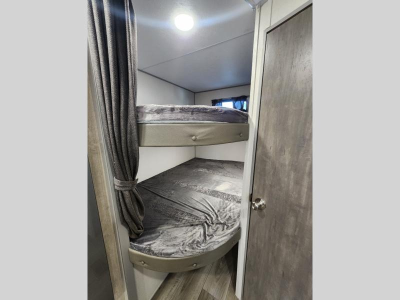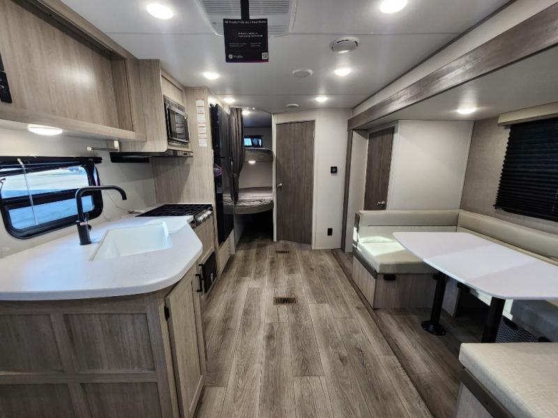 This is the perfect mid-size travel trailer for you and your family! The double-size bunks offer a comfortable sleeping space for the kids and you will have your own private sleeping space with a queen bed in the front bedroom. Freshen up each day in the rear corner bathroom with the tub/shower and a mirror to get ready each morning. You can prepare your best home cooked meals with the GE stainless three burner cooktop and GE stainless 10.7 cu. ft. 12V refrigerator, then enjoy them together at the u-shaped dinette. There is also a large pantry to store all your goods. Don't leave any of your outdoor gear behind either, thanks to the front pass-through storage area and the exterior outside storage area. You could even add the optional outside camper kitchen to grill the catch of the day on the pull out griddle!