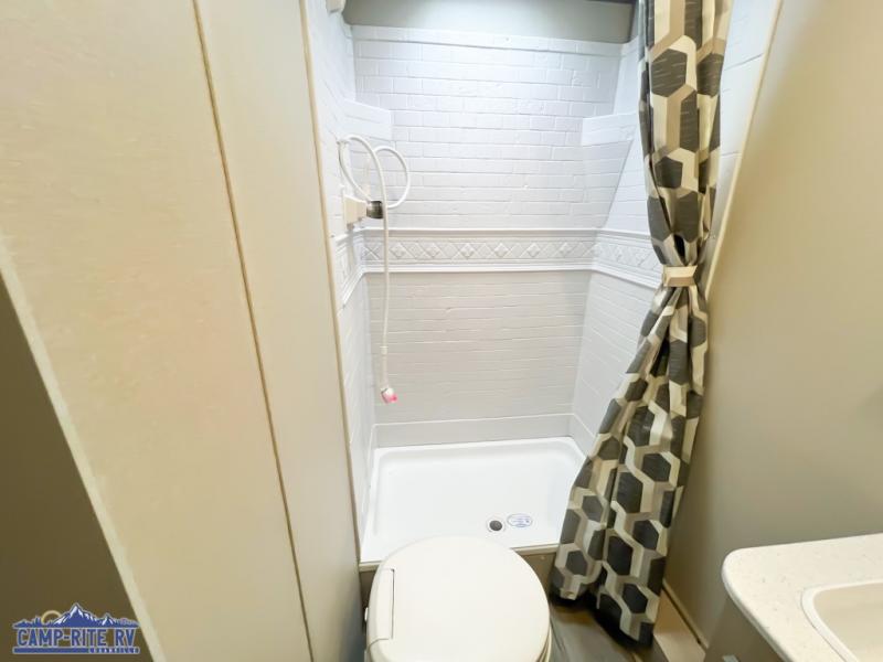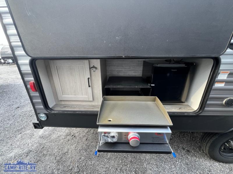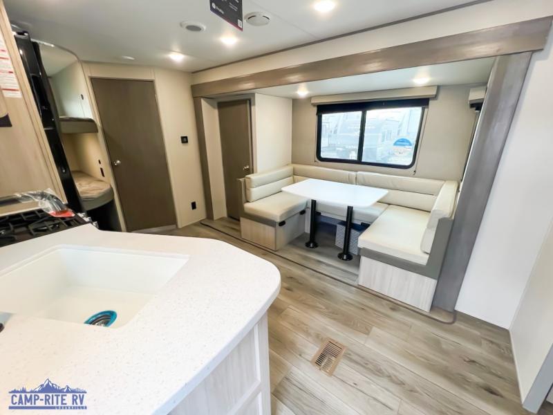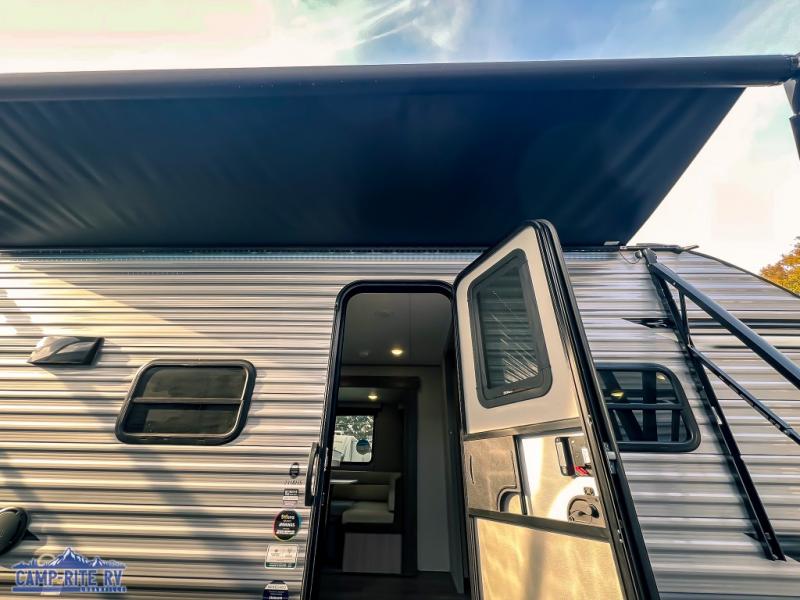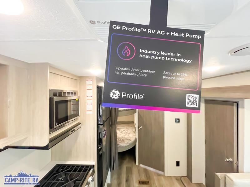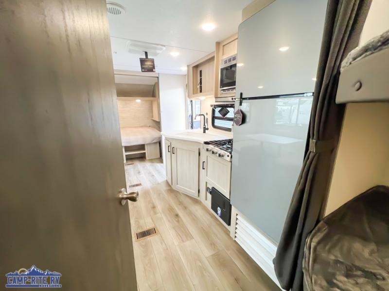 This is the perfect mid-size travel trailer for you and your family! The double-size bunks offer a comfortable sleeping space for the kids and you will have your own private sleeping space with a queen bed in the front bedroom. Freshen up each day in the rear corner bathroom with the tub/shower and a mirror to get ready each morning. You can prepare your best home cooked meals with the GE stainless three burner cooktop and GE stainless 10.7 cu. ft. 12V refrigerator, then enjoy them together at the u-shaped dinette. There is also a large pantry to store all your goods. Don't leave any of your outdoor gear behind either, thanks to the front pass-through storage area and the exterior outside storage area. You could even add the optional outside camper kitchen to grill the catch of the day on the pull out griddle!