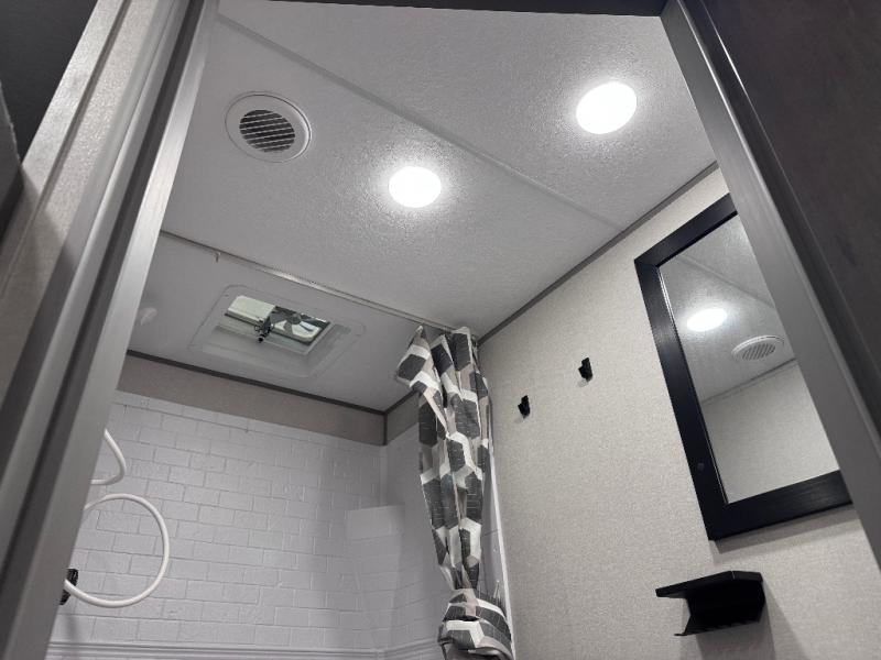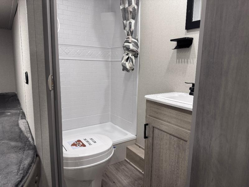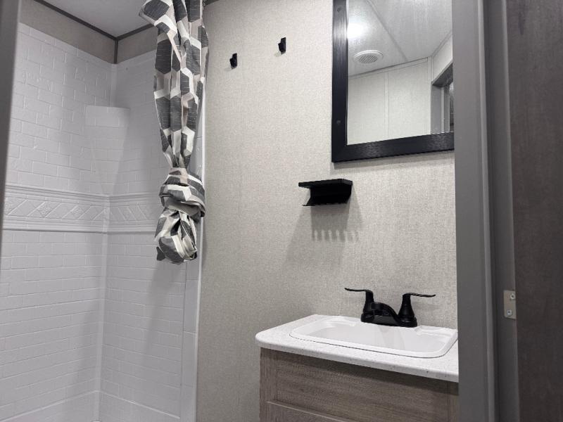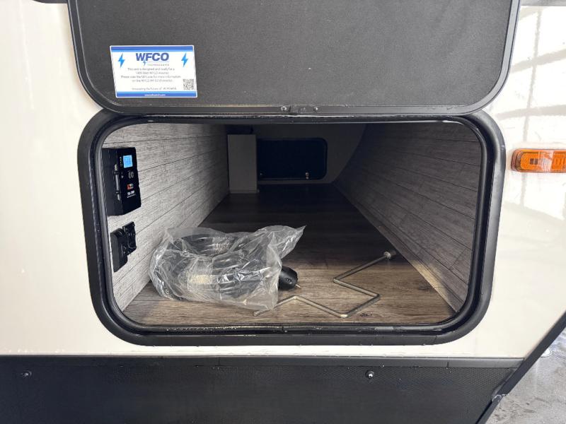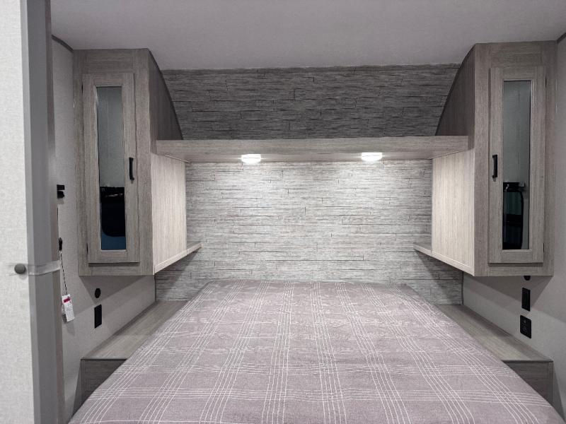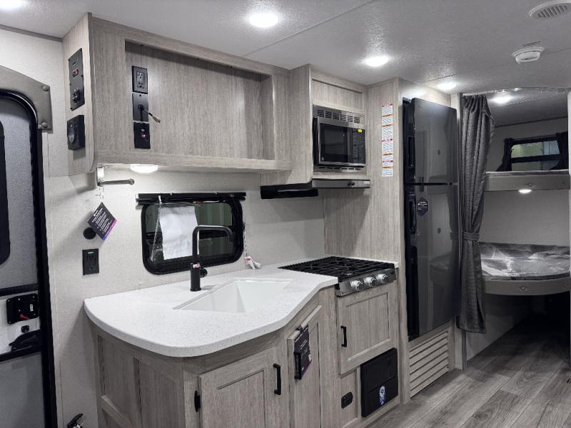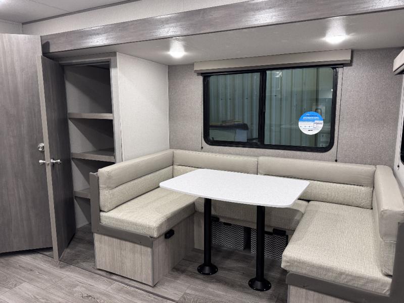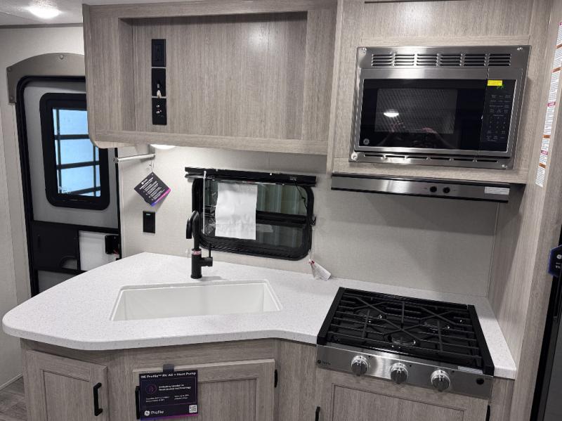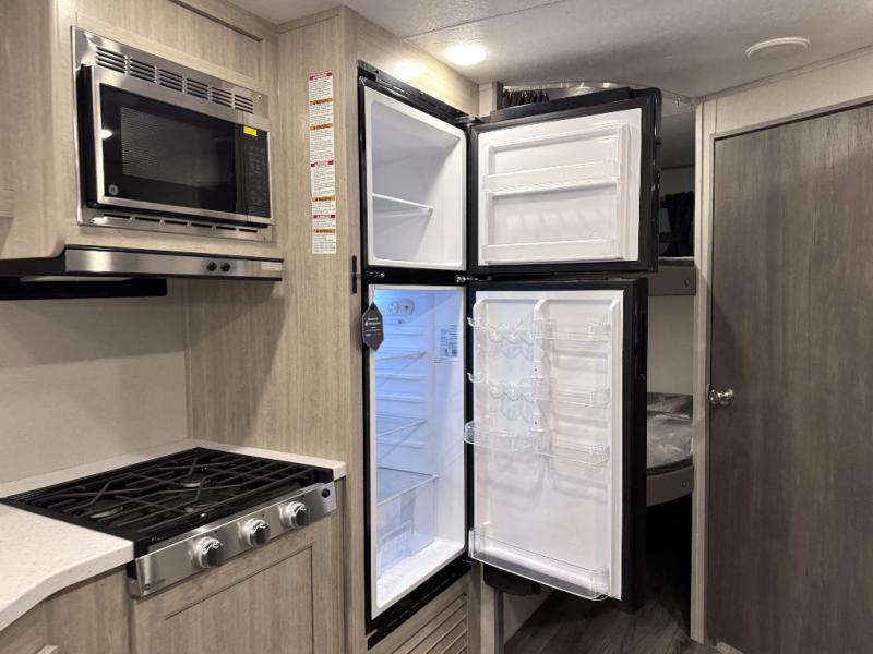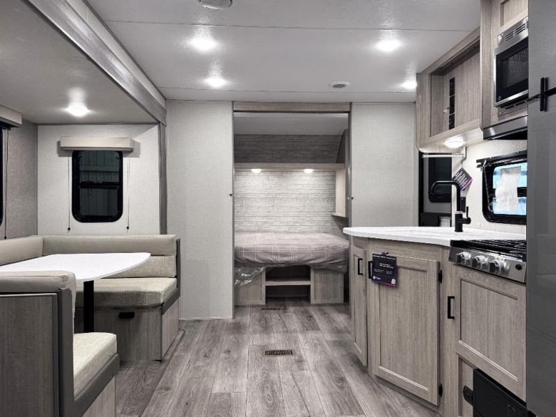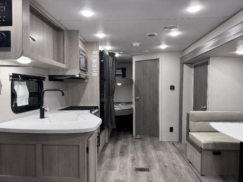This is the perfect mid-size travel trailer for you and your family! The double-size bunks offer a comfortable sleeping space for the kids and you will have your own private sleeping space with a queen bed in the front bedroom. Freshen up each day in the rear corner bathroom with the tub/shower and a mirror to get ready each morning. You can prepare your best home cooked meals with the GE stainless three burner cooktop and GE stainless 10.7 cu. ft. 12V refrigerator, then enjoy them together at the u-shaped dinette. There is also a large pantry to store all your goods. Don't leave any of your outdoor gear behind either, thanks to the front pass-through storage area and the exterior outside storage area. You could even add the optional outside camper kitchen to grill the catch of the day on the pull out griddle!