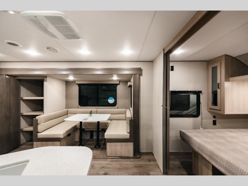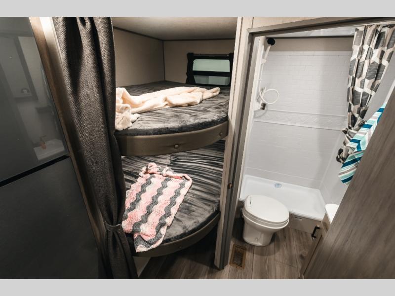 This is the perfect mid-size travel trailer for you and your family! The double-size bunks offer a comfortable sleeping space for the kids and you will have your own private sleeping space with a queen bed in the front bedroom. Freshen up each day in the rear corner bathroom with the tub/shower and a mirror to get ready each morning. You can prepare your best home cooked meals with the GE stainless three burner cooktop and GE stainless 10.7 cu. ft. 12V refrigerator, then enjoy them together at the u-shaped dinette. There is also a large pantry to store all your goods. Don't leave any of your outdoor gear behind either, thanks to the front pass-through storage area and the exterior outside storage area. You could even add the optional outside camper kitchen to grill the catch of the day on the pull out griddle!