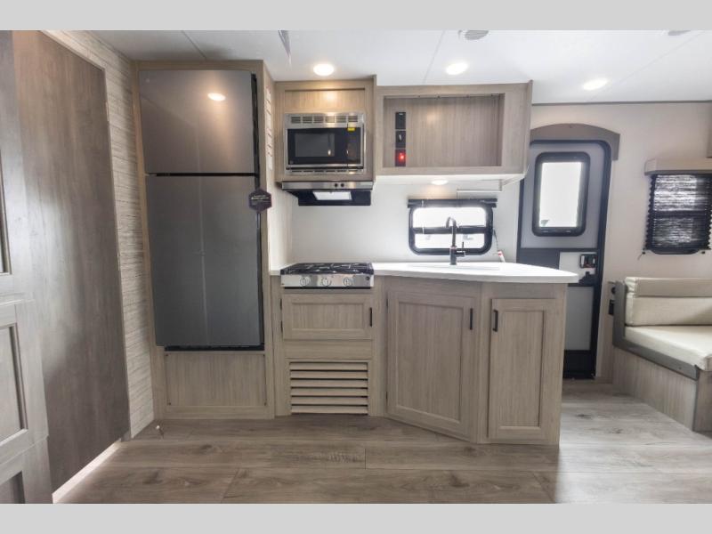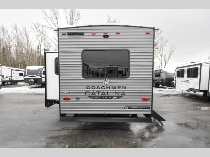 With any Catalina Summit Series 8 by Coachmen you will enjoy an affordable travel trailer packed with at-home comforts! The solid construction includes a Norco electromagnetic powder coated chassis, a seamless Alpha roof membrane, and full length frame outriggers for maximum support and durability. EZ lube axles with leaf spring suspension and self adjusting brakes provide smooth towing from home to campground, and the premium exterior graphics package is sure to turn heads as you travel down the highway. You will love the features included, such as a JBL Aura Cube media center, magnetic baggage door latches, 4,000 lumen interior touch lighting, and the list goes on!