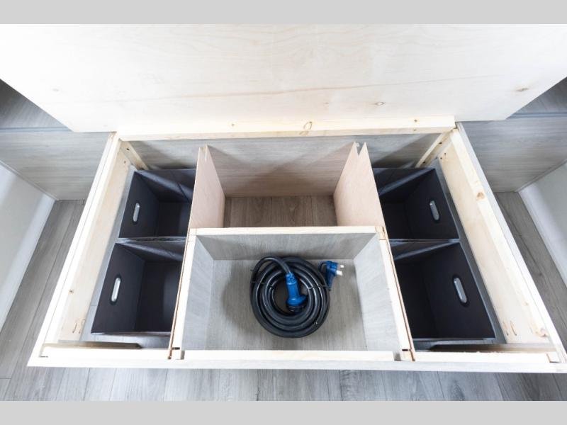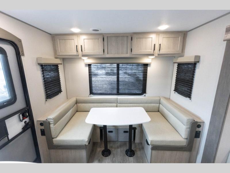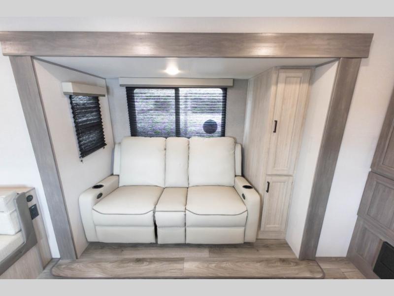 You and your partner will love the layout of this trailer with a walk-through bathroom which is convenient for you when you are in the front bedroom, and handy for your guests when they stay overnight on the U-shaped dinette. The rear U-shaped dinette includes dual end tables to set your drink on, and the theater seating within the slide out will let you relax each evening. The galley kitchen offers all the appliances needed to make all your meals, such as a GE stainless three burner cooktop, a GE stainless microwave, plus a GE stainless 10.7 cu. ft. 12V refrigerator. You will have your own side of the walk-around queen bed and a wardrobe, as well as USB ports and outlets in the nightstands.