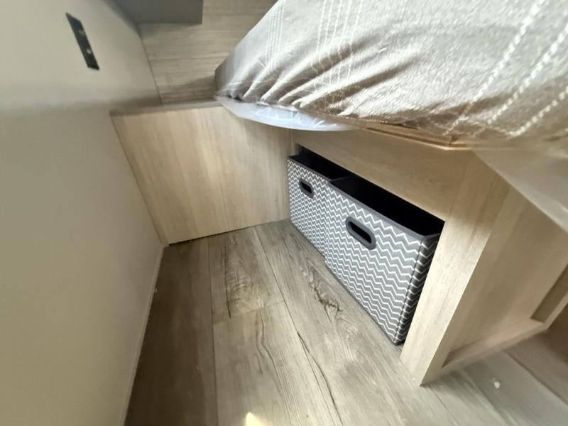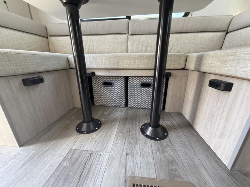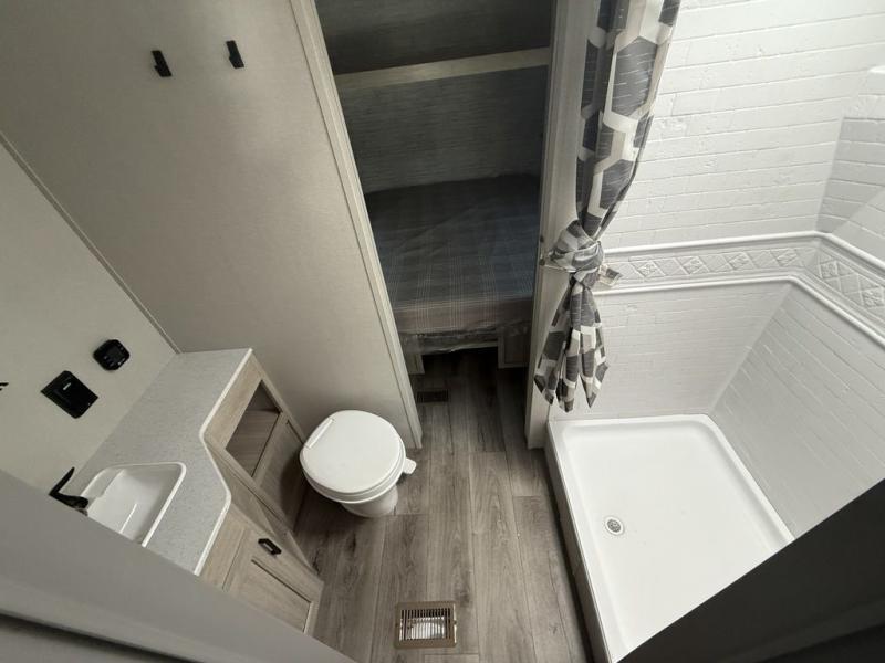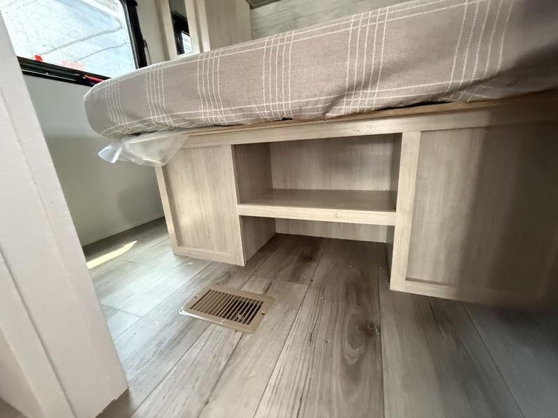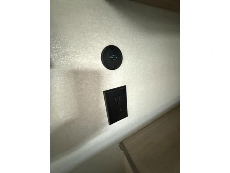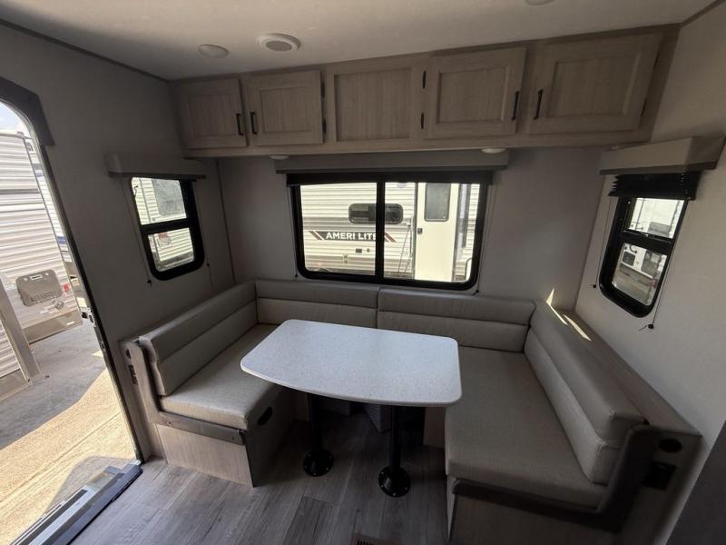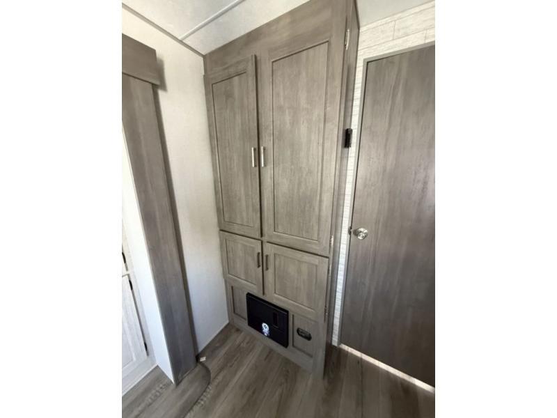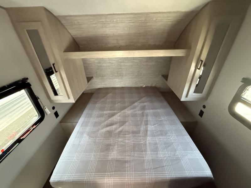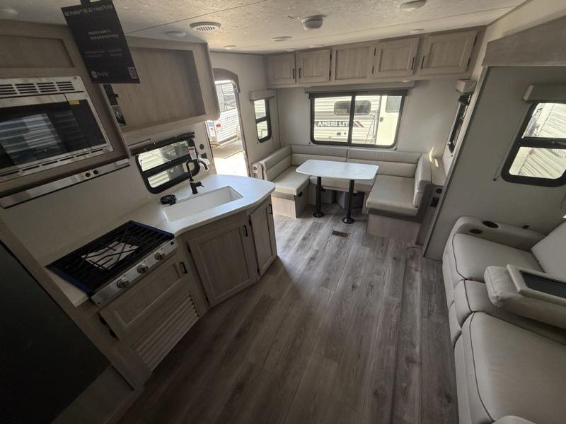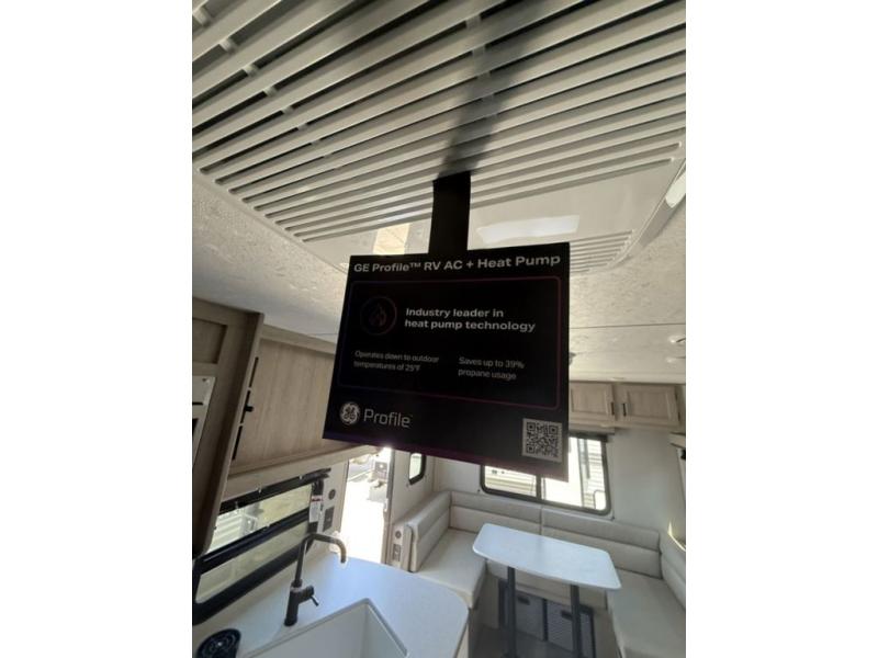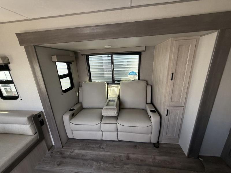 You and your partner will love the layout of this trailer with a walk-through bathroom which is convenient for you when you are in the front bedroom, and handy for your guests when they stay overnight on the U-shaped dinette. The rear U-shaped dinette includes dual end tables to set your drink on, and the theater seating within the slide out will let you relax each evening. The galley kitchen offers all the appliances needed to make all your meals, such as a GE stainless three burner cooktop, a GE stainless microwave, plus a GE stainless 10.7 cu. ft. 12V refrigerator. You will have your own side of the walk-around queen bed and a wardrobe, as well as USB ports and outlets in the nightstands.