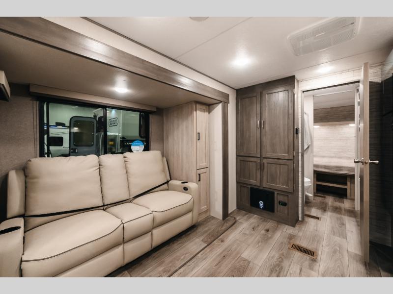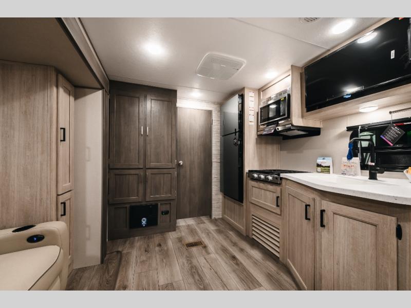 You and your partner will love the layout of this trailer with a walk-through bathroom which is convenient for you when you are in the front bedroom, and handy for your guests when they stay overnight on the U-shaped dinette. The rear U-shaped dinette includes dual end tables to set your drink on, and the theater seating within the slide out will let you relax each evening. The galley kitchen offers all the appliances needed to make all your meals, such as a GE stainless three burner cooktop, a GE stainless microwave, plus a GE stainless 10.7 cu. ft. 12V refrigerator. You will have your own side of the walk-around queen bed and a wardrobe, as well as USB ports and outlets in the nightstands.