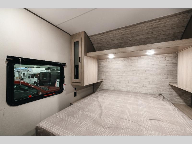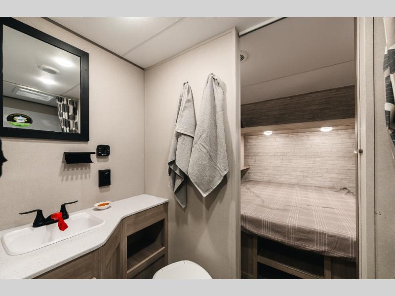 You and your partner will love the layout of this trailer with a walk-through bathroom which is convenient for you when you are in the front bedroom, and handy for your guests when they stay overnight on the U-shaped dinette. The rear U-shaped dinette includes dual end tables to set your drink on, and the theater seating within the slide out will let you relax each evening. The galley kitchen offers all the appliances needed to make all your meals, such as a GE stainless three burner cooktop, a GE stainless microwave, plus a GE stainless 10.7 cu. ft. 12V refrigerator. You will have your own side of the walk-around queen bed and a wardrobe, as well as USB ports and outlets in the nightstands.
