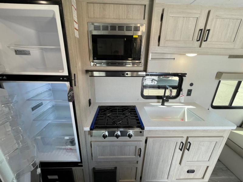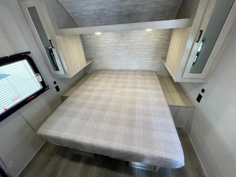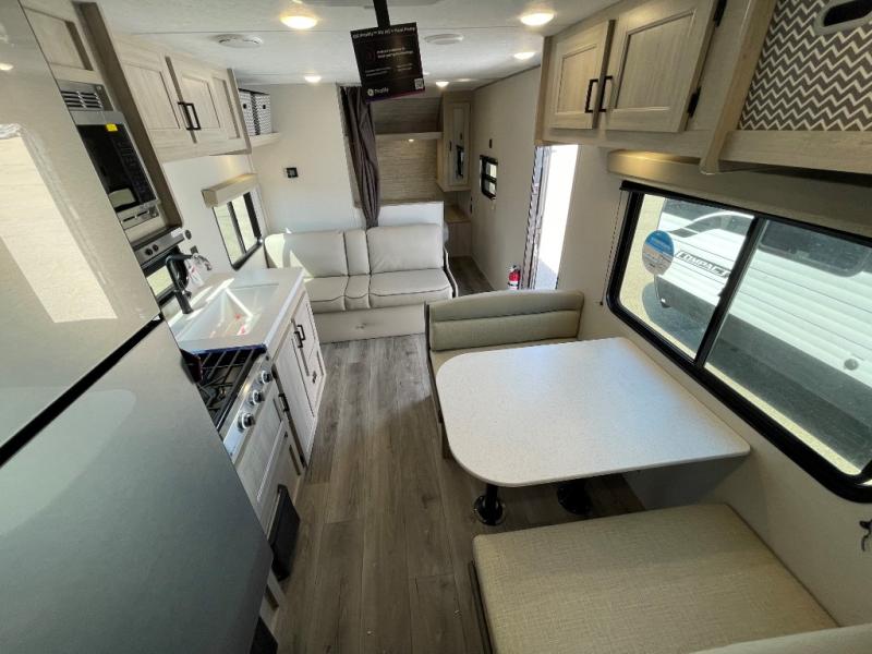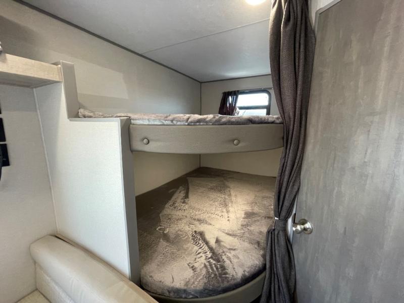 You get to choose to sit at the sofa or at the booth dinette when you are relaxing inside. There is a shelf with storage totes above the sofa for your belongings, and an additional overhead cabinet above the dinette for games. Maybe you want to rest on your own queen bed in the front semi-private bedroom before you make a meal in the kitchen or take a hike through the trails around the lake. The 15' electric awning with multi-color LED lights and a remote offers an outdoor living area where you can visit with other RVers. The kids will love their own double-size bunks that they can share with a friend or two, and the full bathroom is nearby as an added convenience.
