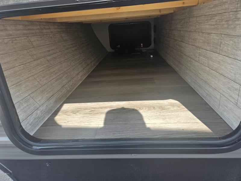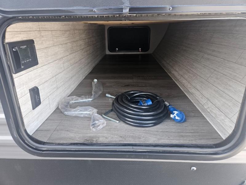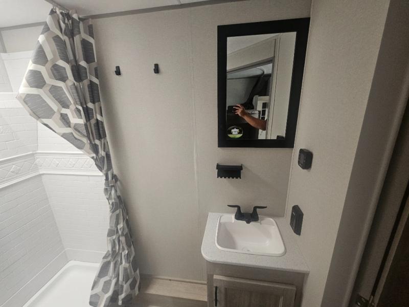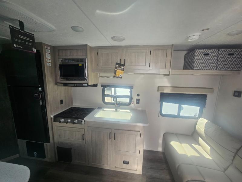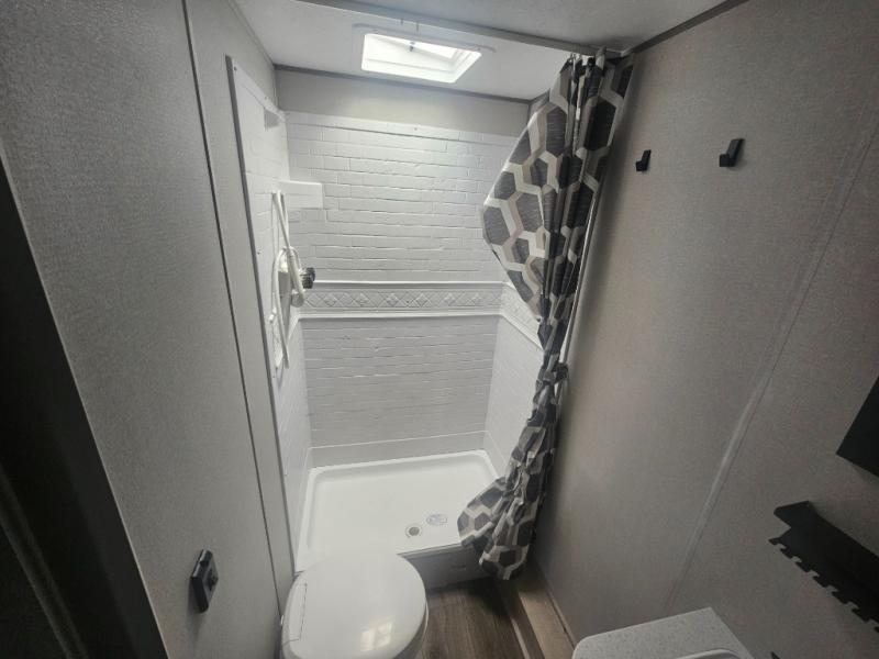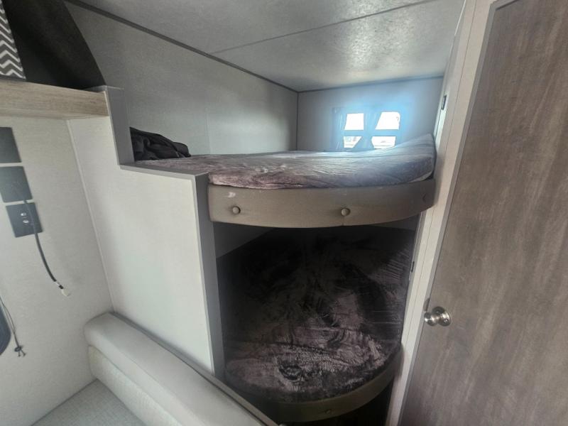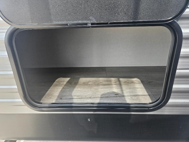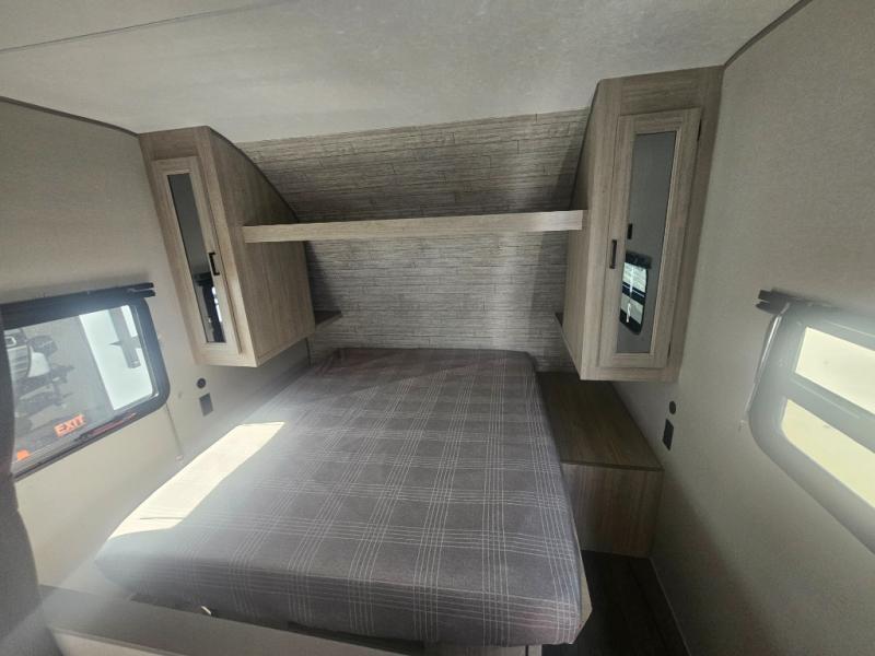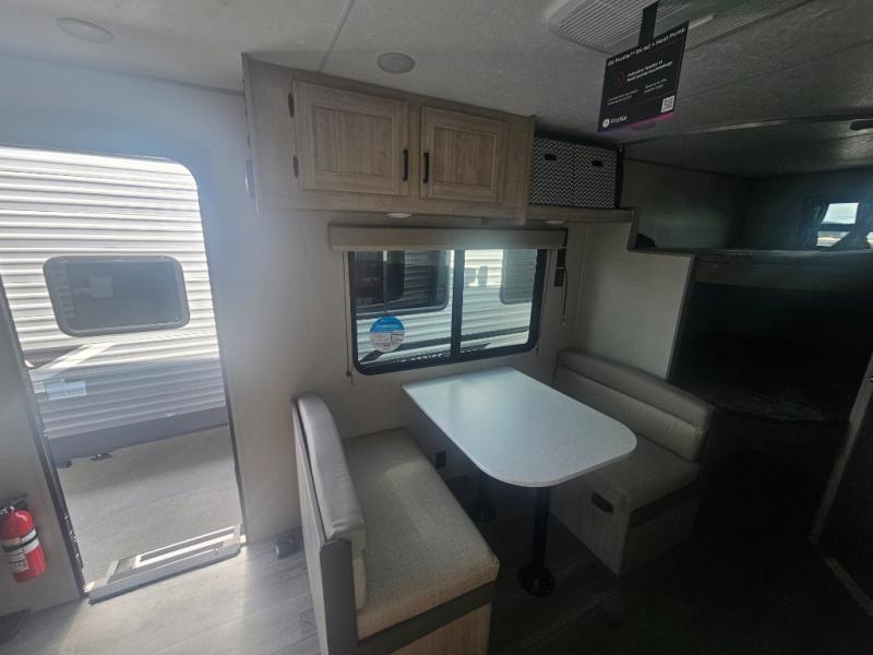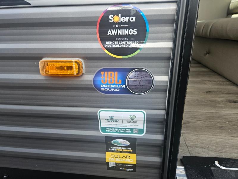 You get to choose to sit at the sofa or at the booth dinette when you are relaxing inside. There is a shelf with storage totes above the sofa for your belongings, and an additional overhead cabinet above the dinette for games. Maybe you want to rest on your own queen bed in the front semi-private bedroom before you make a meal in the kitchen or take a hike through the trails around the lake. The 15' electric awning with multi-color LED lights and a remote offers an outdoor living area where you can visit with other RVers. The kids will love their own double-size bunks that they can share with a friend or two, and the full bathroom is nearby as an added convenience.