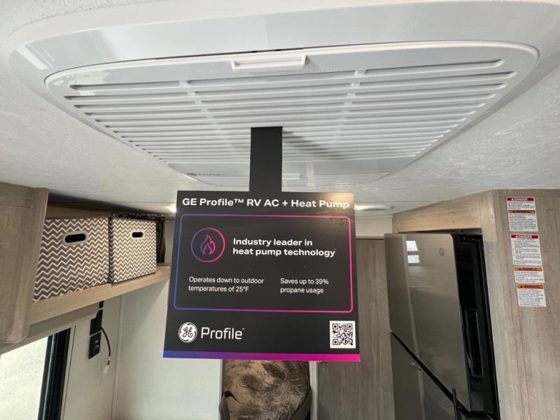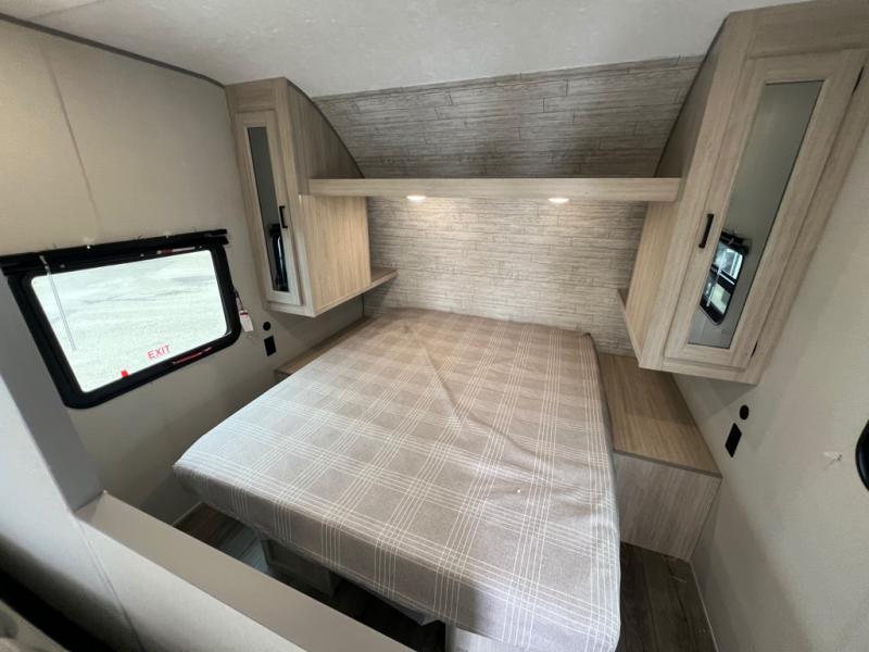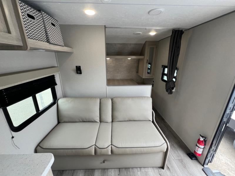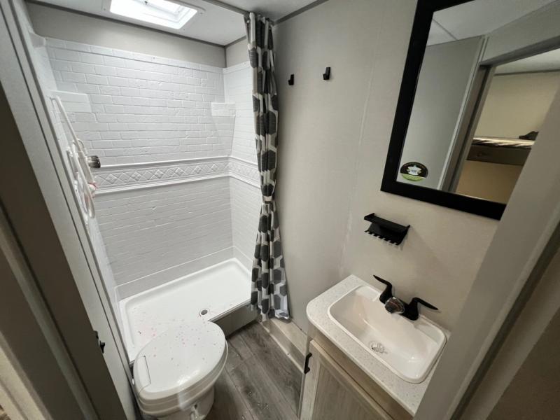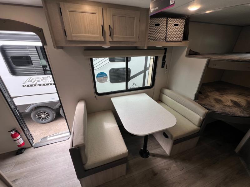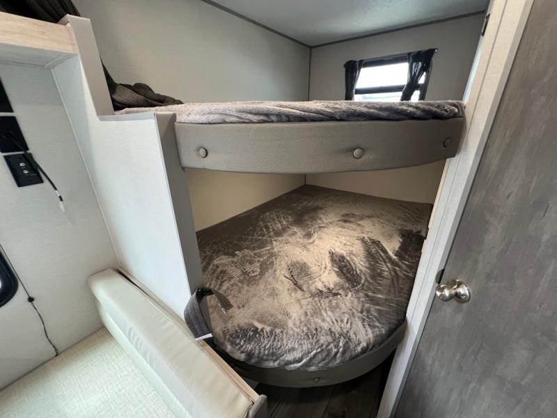 You get to choose to sit at the sofa or at the booth dinette when you are relaxing inside. There is a shelf with storage totes above the sofa for your belongings, and an additional overhead cabinet above the dinette for games. Maybe you want to rest on your own queen bed in the front semi-private bedroom before you make a meal in the kitchen or take a hike through the trails around the lake. The 15' electric awning with multi-color LED lights and a remote offers an outdoor living area where you can visit with other RVers. The kids will love their own double-size bunks that they can share with a friend or two, and the full bathroom is nearby as an added convenience.
