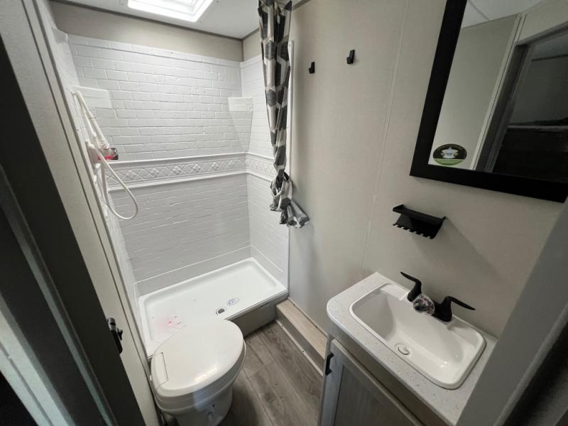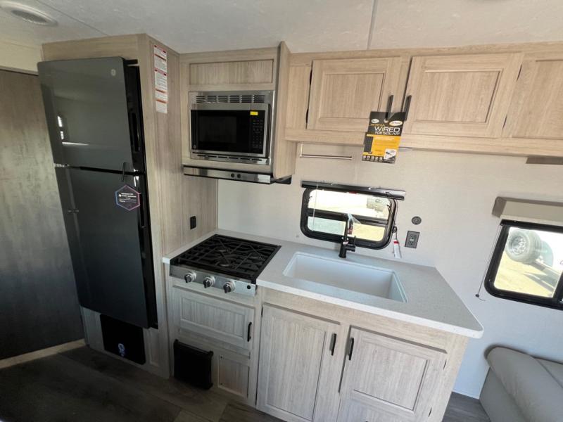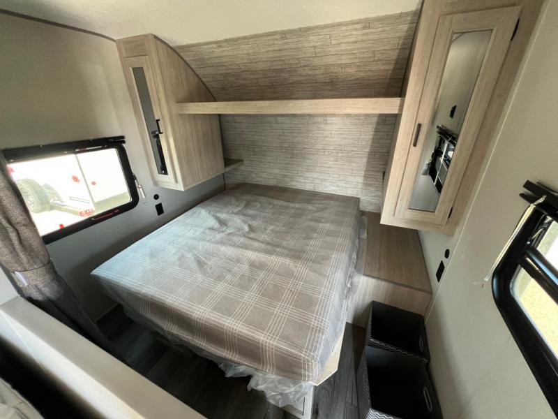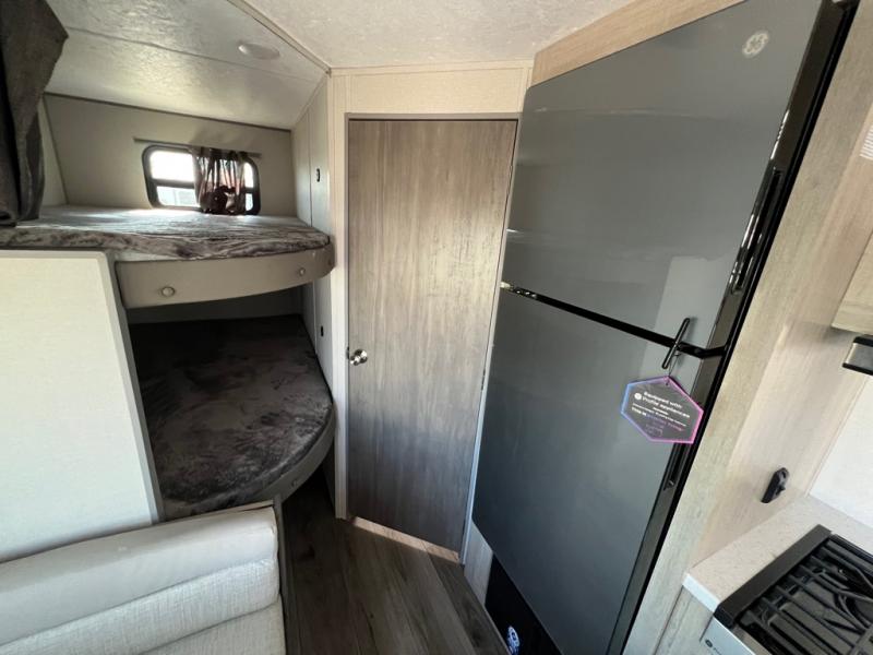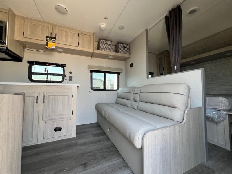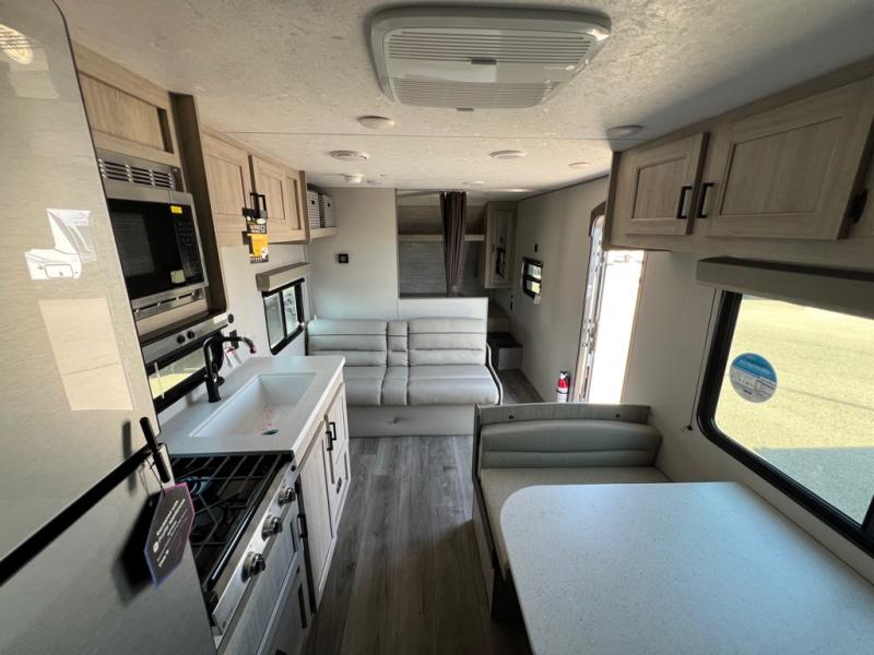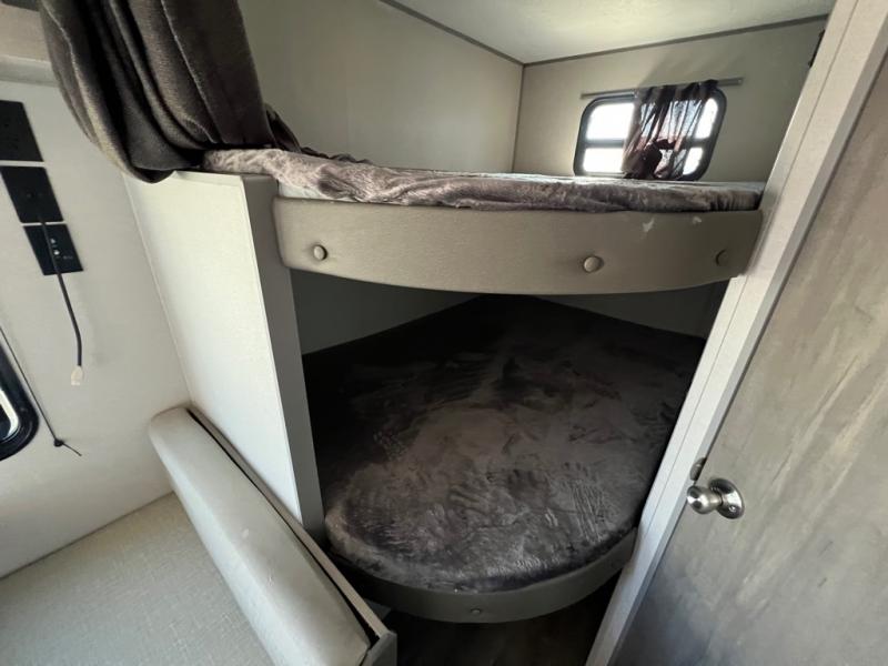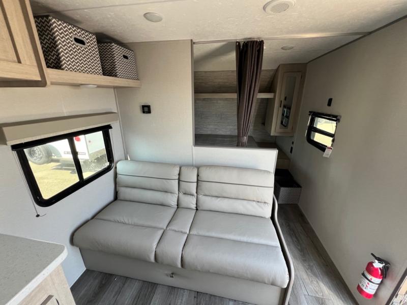 You get to choose to sit at the sofa or at the booth dinette when you are relaxing inside. There is a shelf with storage totes above the sofa for your belongings, and an additional overhead cabinet above the dinette for games. Maybe you want to rest on your own queen bed in the front semi-private bedroom before you make a meal in the kitchen or take a hike through the trails around the lake. The 15' electric awning with multi-color LED lights and a remote offers an outdoor living area where you can visit with other RVers. The kids will love their own double-size bunks that they can share with a friend or two, and the full bathroom is nearby as an added convenience.