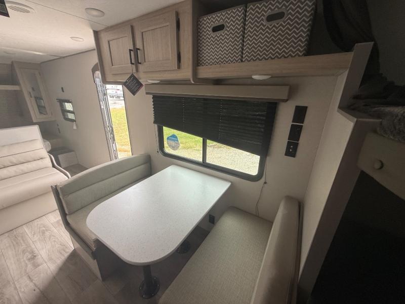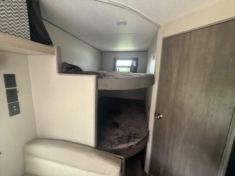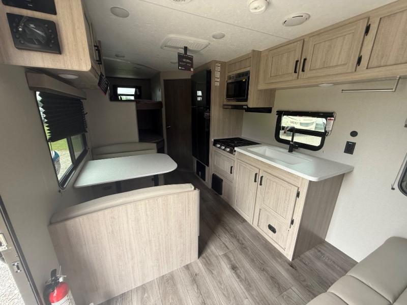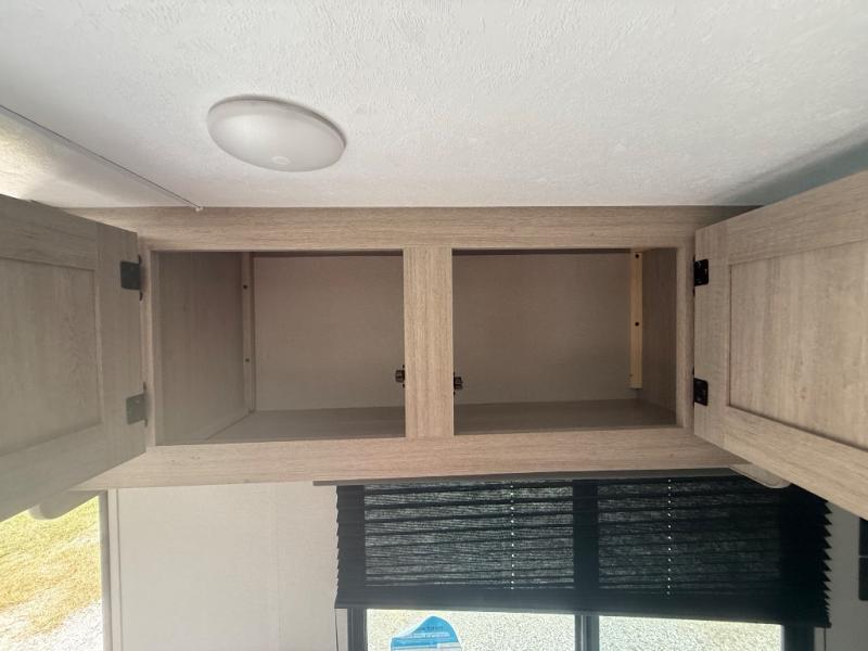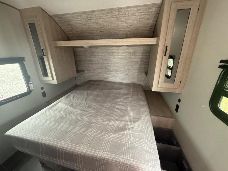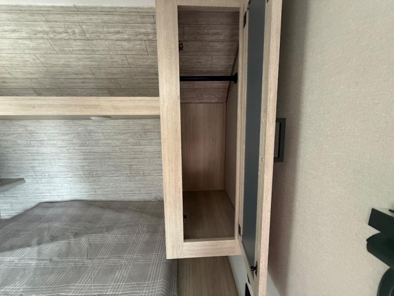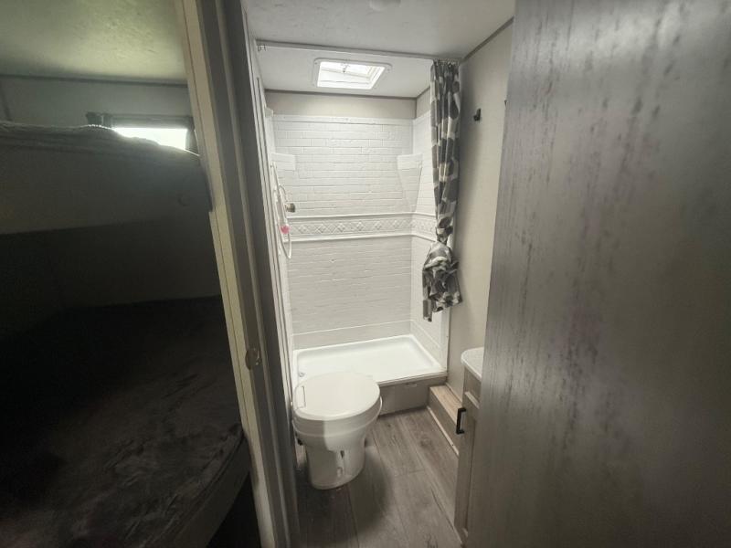 You get to choose to sit at the sofa or at the booth dinette when you are relaxing inside. There is a shelf with storage totes above the sofa for your belongings, and an additional overhead cabinet above the dinette for games. Maybe you want to rest on your own queen bed in the front semi-private bedroom before you make a meal in the kitchen or take a hike through the trails around the lake. The 15' electric awning with multi-color LED lights and a remote offers an outdoor living area where you can visit with other RVers. The kids will love their own double-size bunks that they can share with a friend or two, and the full bathroom is nearby as an added convenience.