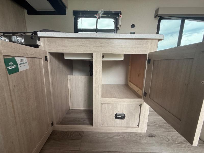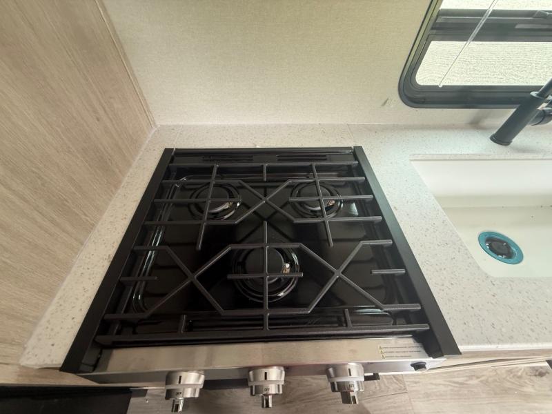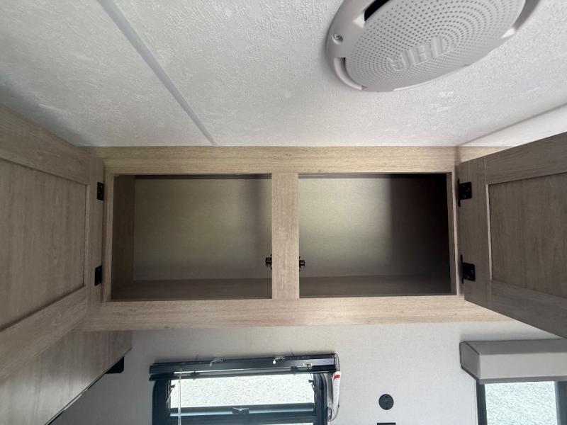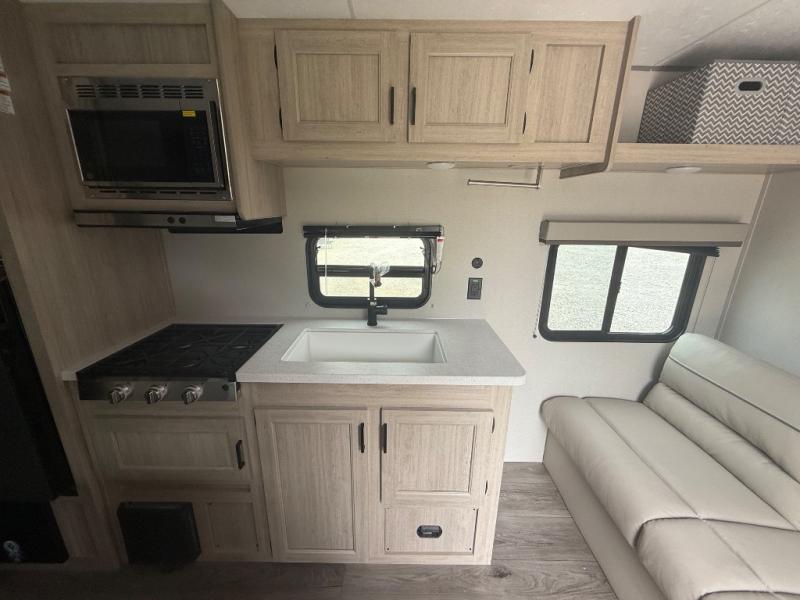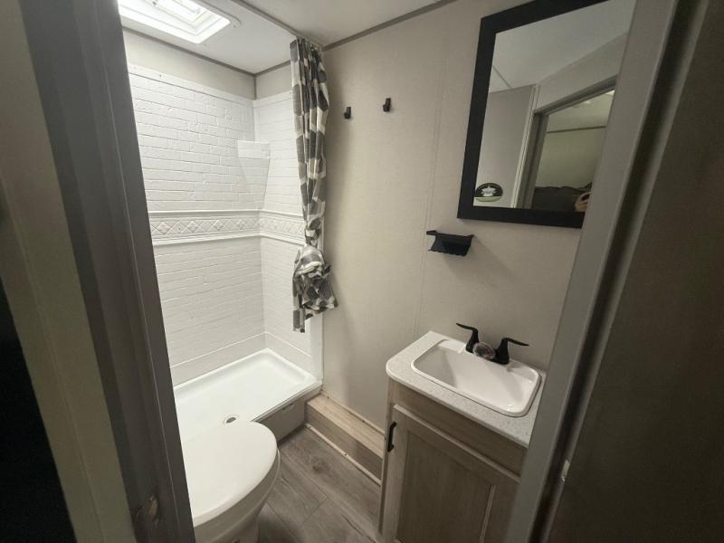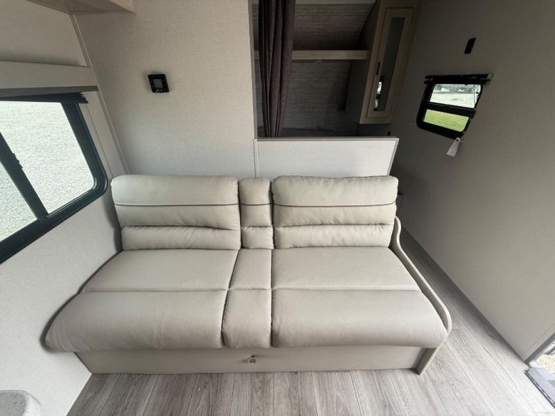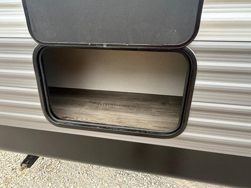 You get to choose to sit at the sofa or at the booth dinette when you are relaxing inside. There is a shelf with storage totes above the sofa for your belongings, and an additional overhead cabinet above the dinette for games. Maybe you want to rest on your own queen bed in the front semi-private bedroom before you make a meal in the kitchen or take a hike through the trails around the lake. The 15' electric awning with multi-color LED lights and a remote offers an outdoor living area where you can visit with other RVers. The kids will love their own double-size bunks that they can share with a friend or two, and the full bathroom is nearby as an added convenience.