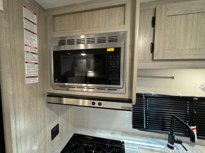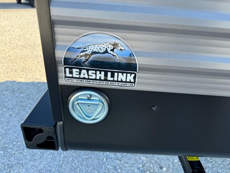 You get to choose to sit at the sofa or at the booth dinette when you are relaxing inside. There is a shelf with storage totes above the sofa for your belongings, and an additional overhead cabinet above the dinette for games. Maybe you want to rest on your own queen bed in the front semi-private bedroom before you make a meal in the kitchen or take a hike through the trails around the lake. The 15' electric awning with multi-color LED lights and a remote offers an outdoor living area where you can visit with other RVers. The kids will love their own double-size bunks that they can share with a friend or two, and the full bathroom is nearby as an added convenience.